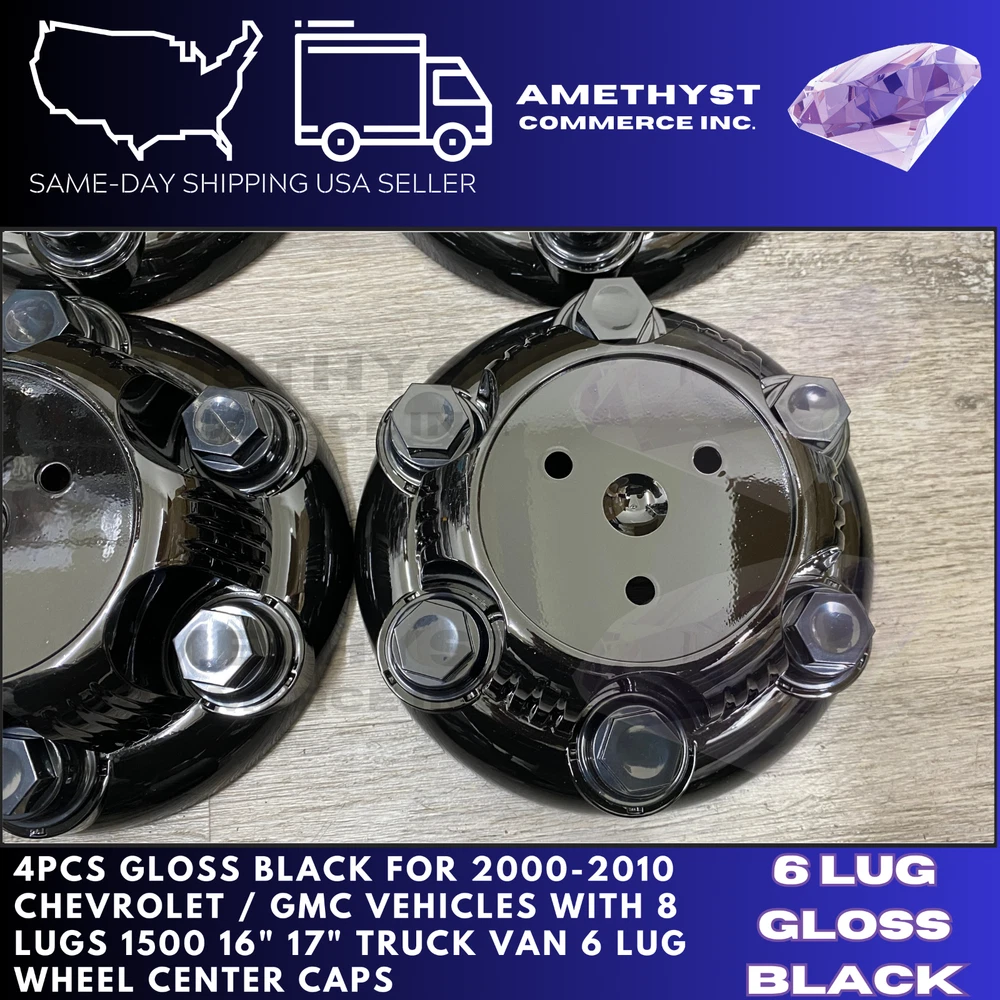 4pcs Chevy Silverado 1500 Tahoe Replacement 6Lugs BLACK Center Caps 5129c. Condition is "New". Comes alond with black nuts Fits the painted steel wheels ONLY Will not work on chrome clad wheels. 1999-2014 Chevy Silverado 1500 16'' rims 2000 Chevy Tahoe 16'' rims 2000 Chevy Suburban 1500 16'' rims 2003-2008 Chevy Van 16'' rims 2007-2013 Chevy Avalanche 17'' rims 2009 Chevy Van 17'' rims 2005-2013 Chevy Silverado 1500 17'' rims 2007-2013 Chevy Suburban 1500 17'' rims 2007-2013 Chevy Tahoe 17'' rims EBAY COMPATIBILITY IN NOT 100% ACCURATE, PLEASE SEE ABOVE CHART FOR ACCURACY.