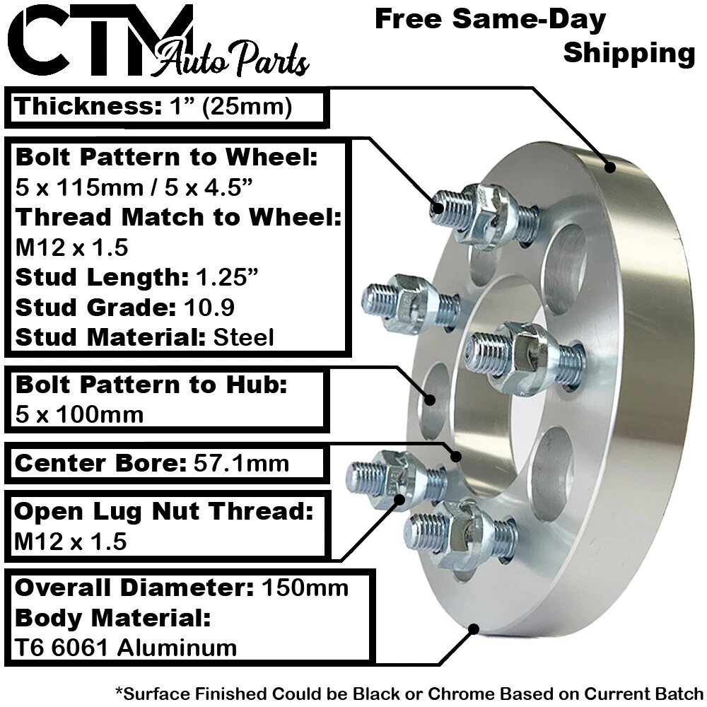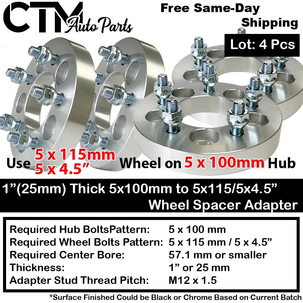 Wheel Compatibility Check May I use the Same STOCK WHEEL: No, This is Conversion Adapter May I use the Same Thread Stock Lug Nuts/Bolts: Yes How about Other Wheels: Check Requirements Below Product Specification: About the Adapter Adapter Thickness: 1" Adapter Bolt Pattern Fit to Hub: 5x100mm Adapter Bolt Pattern Fit to Wheel: 5x4.5"(115mm) Adapter Center Bore: 57.1mm Adapter Hub Ring: No Adapter Overall Diameter: 150mm Adapter Stud Thread Pitch: M12x1.5 Adapter Stud Grade: 10.9 Adapter Color: Chrome or Black Depending on Current Batch Adapter Material: Cold Forged 6061 T6 Grade Aluminum Requirements of the Vehicle Specification Required Vehicle Hub Bolt Pattern: 5x100mm Required Vehicle Hub Center Bore: 57.1mm or smaller Required Vehicle Hub Stud Thread: M12x1.5 Min Required Vehicle Fender Gap: 1" Max Vehicle Hub Stud Length: 1" *If your stud is longer than 1" you will need to trim it to use the adapter. Requirements of the Wheel Specification Required Vehicle Wheel Bolt Pattern: 5x4.5"(5x115mm) Required Vehicle Wheel Center Bore: 57.1mm or smaller Required Vehicle Wheel Lug Thread: M12x1.5 Required Vehicle Wheel Lug Nuts Hex: Based on your Wheel What You Will Receive: 4 pcs Wheel Adapters 20 pcs Open Lugs fit to your Hub What You May Need As Extra: 20 pcs Wheel Lugs to Fit Your Wheel Compatibility Chart and Important Part Note: Please Carefully Check for Generation information Make Model Year Made Generation Hub Stud Hub PCD Required Wheel Lug Required Wheel PCD Buick Skylark 1992-1998 M12x1.5 5x100mm M12x1.5 5x4.5"(5x115mm) Chevrolet Beretta 1987-1996 M12x1.5 5x100mm M12x1.5 5x4.5"(5x115mm) Chevrolet Cavalier 1982-2005 I/II/III M12x1.5 5x100mm M12x1.5 5x4.5"(5x115mm) Chevrolet Celebrity 1982-1990 M12x1.5 5x100mm M12x1.5 5x4.5"(5x115mm) Chevrolet Corsica 1987-1996 M12x1.5 5x100mm M12x1.5 5x4.5"(5x115mm) Chrysler Cirrus 1995-2000 JA M12x1.5 5x100mm M12x1.5 5x4.5"(5x115mm) Chrysler Dynasty 1988-1993 M12x1.5 5x100mm M12x1.5 5x4.5"(5x115mm) Chrysler Fifth Avenue 1984-1993 M-Body/Y-Body M12x1.5 5x100mm M12x1.5 5x4.5"(5x115mm) Chrysler LeBaron 1989-1995 H-Body M12x1.5 5x100mm M12x1.5 5x4.5"(5x115mm) Chrysler PT Cruiser 2000-2010 PT M12x1.5 5x100mm M12x1.5 5x4.5"(5x115mm) Chrysler Saratoga 1989-1995 C9 M12x1.5 5x100mm M12x1.5 5x4.5"(5x115mm) Chrysler Sebring 2001-2006 JR/ST M12x1.5 5x100mm M12x1.5 5x4.5"(5x115mm) Chrysler Sebring Convertible 1995-2000 FJ/JX M12x1.5 5x100mm M12x1.5 5x4.5"(5x115mm) Dodge Caravan 1991-2000 AS/NS M12x1.5 5x100mm M12x1.5 5x4.5"(5x115mm) Dodge Dynasty 1988-1993 M12x1.5 5x100mm M12x1.5 5x4.5"(5x115mm) Dodge Grand Caravan 1987-1990 S M12x1.5 5x100mm M12x1.5 5x4.5"(5x115mm) Dodge Grand Caravan 1996-2000 NS M12x1.5 5x100mm M12x1.5 5x4.5"(5x115mm) Dodge Neon 1994-2005 PL I/PL II M12x1.5 5x100mm M12x1.5 5x4.5"(5x115mm) Dodge Neon SRT 2003-2005 PL M12x1.5 5x100mm M12x1.5 5x4.5"(5x115mm) Dodge Spirit 1988-1995 AA-Body M12x1.5 5x100mm M12x1.5 5x4.5"(5x115mm) Dodge Stratus 1995-2006 JA/JR M12x1.5 5x100mm M12x1.5 5x4.5"(5x115mm) Oldsmobile Achieva 1992-1998 M12x1.5 5x100mm M12x1.5 5x4.5"(5x115mm) Pontiac 6000 1982 A-Body M12x1.5 5x100mm M12x1.5 5x4.5"(5x115mm) Pontiac Fiero 1984-1988 P-Body M12x1.5 5x100mm M12x1.5 5x4.5"(5x115mm) Pontiac Grand Am 1985-1998 N-Body M12x1.5 5x100mm M12x1.5 5x4.5"(5x115mm) Pontiac Phoenix 1980-1984 X-Body II M12x1.5 5x100mm M12x1.5 5x4.5"(5x115mm) Pontiac Sunbird 1982-1994 J-Body I/J-Body II M12x1.5 5x100mm M12x1.5 5x4.5"(5x115mm) Pontiac Sunfire 1995-2005 J-Body M12x1.5 5x100mm M12x1.5 5x4.5"(5x115mm) Pontiac Tempest 1987-1991 L-Body M12x1.5 5x100mm M12x1.5 5x4.5"(5x115mm) Pontiac Vibe 2002-2008 ZZE M12x1.5 5x100mm M12x1.5 5x4.5"(5x115mm) Pontiac Vibe 1.8i 2009-2010 AZE M12x1.5 5x100mm M12x1.5 5x4.5"(5x115mm) Notes: Buyer must check compatibility chart before buying, any vehicle that is not displayed in the capability may NOT fit. Buyer must check part notes regarding generations, wheel type, etc. For Adapter thickness limitation, buyer must measure Fender Gap before buying. Parts must meet all the requirements listed in the description in order to ensure fitment and safety. If you are not sure, you can always contact customer service for help. Return & Exchange Policy: Your happiness with the product is our top concern. We allow returns based on the following rules: Return & Exchange is allowed within 30-day of Purchase Date Return Product must be unused, intact, and with the original package Buyer is responsible for return shipping charge Buyer is responsible for all exchange shipping charge Please allow 3 business day after the delivery of your return for us to process the refund. 15% RMA Restocking Fee is applied to all Adapter/Spacer/Spike orders. Please use a specific return shipping address (not the ship-from address) to avoid the 30% Processing Fee. If you have any questions or concerns, please do not hesitate to let us know. Shipping: All shipments will be shipped via Fedex 2 Days (Same-Day), If your address is not qualified for FedEx Service, it will be shipped via USPS Priority Mail (2-5 Days). Order placed before 9:00 am PST will be shipped on the same day. Order placed after 9:00am will be shipped promptly the next business day. If you wish to cancel or modify order, please notify Customer Service before 9:00 am PST or we won't be able to change/cancel your order prior to shipping. We also provide local pickup service! Contact us for more information. Warranty: 30-Day Return Policy; For Colored Lug Nuts (Any color other than Chrome), we suggest the use of manual torque for installation to avoid damage to the paint layer. Warranty is voided if power tool is used Abuse of Usage (Excessive power torque) will not be covered by Warranty Frequent Asked Questions: Q: When will my order shipped? A: Order made by 9:00 am Pacific Time will be shipped same day, except Holidays, Weekends. Order made after 9:00 am Pacific Time will be shipped on next Business Day. Q: The shipping status indicates my package was sent, but there is no movement or 