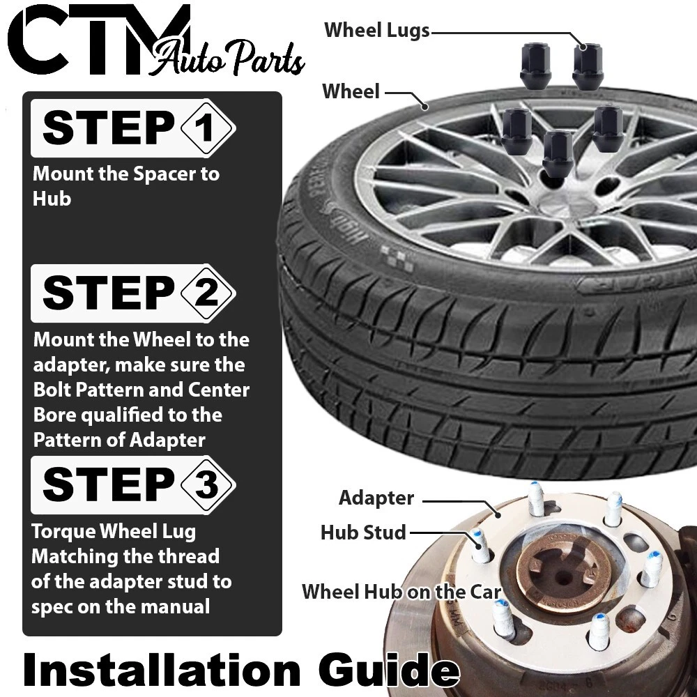 This Universal Spacers Also Fit All Wheels&Hub with PCD Below 6x139.7mm (6x5.5") Wheel Compatibility Check May I use the Same STOCK WHEEL: Yes May I use the Same Thread Stock Lug Nuts/Bolts: Yes How about Other Wheels: Check Requirements Below Product Specification: About the Spacers Spacers Thickness: 1/4"(6mm) Spacers Bolt Pattern: 6x5.5"(6x139.7mm) Spacers Center Bore: 106mm Spacers Hub Ring: No Spacers Overall Diameter: 176mm Spacers Color: Chrome Spacers Material: Casted 6061 T6 Grade Aluminum Requirements of the Vehicle Specification Required Vehicle Hub Bolt Pattern: 6x5.5"(6x139.7mm) Required Vehicle Hub Center Bore: 106mm or smaller Min Required Vehicle Fender Gap: 1/4"(6mm) Requirements of the Wheel Specification Required Vehicle Wheel Bolt Pattern: 6x5.5"(6x139.7mm) Required Vehicle Wheel Center Bore: 106mm or smaller What You Will Receive: 4 pcs Wheel Spacers Compatibility Chart and Important Part Note: Please Carefully Check for Generation information Make Model Year Made Generation Hub Stud Hub PCD Required Wheel Lug Required Wheel PCD Chevrolet Astro 2003-2005 II M14x1.5 6x5.5" M14x1.5 6x5.5"(6x139.7mm) Chevrolet Avalanche 2007-2013 M14x1.5 6x5.5" M14x1.5 6x5.5"(6x139.7mm) Chevrolet Avalanche 1500 2002-2006 M14x1.5 6x5.5" M14x1.5 6x5.5"(6x139.7mm) Chevrolet Blazer 1992-1994 III M14x1.5 6x5.5" M14x1.5 6x5.5"(6x139.7mm) Chevrolet C2500 1988-2000 M14x1.5 6x5.5" M14x1.5 6x5.5"(6x139.7mm) Chevrolet Cheyenne 2007-2023 GMT900/K2XX/IV M14x1.5 6x5.5" M14x1.5 6x5.5"(6x139.7mm) Chevrolet Express 1500 2003-2014 M14x1.5 6x5.5" M14x1.5 6x5.5"(6x139.7mm) Chevrolet Express 2500 1996-2023 M14x1.5 6x5.5" M14x1.5 6x5.5"(6x139.7mm) Chevrolet K1500 1988-1999 M14x1.5 6x5.5" M14x1.5 6x5.5"(6x139.7mm) Chevrolet K1500 Suburban 1992-1999 M14x1.5 6x5.5" M14x1.5 6x5.5"(6x139.7mm) Chevrolet K2500 1988-2000 M14x1.5 6x5.5" M14x1.5 6x5.5"(6x139.7mm) Chevrolet S10 2017-2021 IV M14x1.5 6x5.5" M14x1.5 6x5.5"(6x139.7mm) Chevrolet Silverado 2014-2023 K2XX/IV M14x1.5 6x5.5" M14x1.5 6x5.5"(6x139.7mm) Chevrolet Silverado 1500 1999-2023 I(GMT800)/II(GMT900)/III(K2XX)/IV M14x1.5 6x5.5" M14x1.5 6x5.5"(6x139.7mm) Chevrolet Silverado 1500Classic 2007 M14x1.5 6x5.5" M14x1.5 6x5.5"(6x139.7mm) Chevrolet Silverado 1500 LD 2019 K2XX M14x1.5 6x5.5" M14x1.5 6x5.5"(6x139.7mm) Chevrolet Sonora 2000-2006 M14x1.5 6x5.5" M14x1.5 6x5.5"(6x139.7mm) Chevrolet Suburban 2012-2023 IX(GMT900)/X(GMT K2YC/G)/XI(GMT1YC) M14x1.5 6x5.5" M14x1.5 6x5.5"(6x139.7mm) Chevrolet Suburban 1500 2000-2014 VIII/IX M14x1.5 6x5.5" M14x1.5 6x5.5"(6x139.7mm) Chevrolet Tahoe 2001-2023 II(GMT800)/III(GMT900)/IV(GMTK2UC/G)/V(GMT1YC) M14x1.5 6x5.5" M14x1.5 6x5.5"(6x139.7mm) Chevrolet Tahoe 4WD 1995-2000 I(GMT400) M14x1.5 6x5.5" M14x1.5 6x5.5"(6x139.7mm) Notes: Buyer must check compatibility chart before buying, any vehicle that is not displayed in the capability may NOT fit. Buyer must check part notes regarding generations, wheel type, etc. For Adapter thickness limitation, buyer must measure Fender Gap before buying. Parts must meet all the requirements listed in the description in order to ensure fitment and safety. If you are not sure, you can always contact customer service for help. Return & Exchange Policy: Your happiness with the product is our top concern. We allow returns based on the following rules: Return & Exchange is allowed within 30-day of Purchase Date Return Product must be unused, intact, and with the original package Buyer is responsible for return shipping charge Buyer is responsible for all exchange shipping charge Please allow 3 business day after the delivery of your return for us to process the refund. 15% RMA Restocking Fee is applied to all Adapter/Spacer/Spike orders. Please use a specific return shipping address (not the ship-from address) to avoid the 30% Processing Fee. If you have any questions or concerns, please do not hesitate to let us know. Shipping: All shipments will be shipped via Fedex 2 Days (Same-Day), If your address is not qualified for FedEx Service, it will be shipped via USPS Priority Mail (2-5 Days). Order placed before 9:00 am PST will be shipped on the same day. Order placed after 9:00am will be shipped promptly the next business day. If you wish to cancel or modify order, please notify Customer Service before 9:00 am PST or we won't be able to change/cancel your order prior to shipping. We also provide local pickup service! Contact us for more information. Warranty: 30-Day Return Policy; For Colored Lug Nuts (Any color other than Chrome), we suggest the use of manual torque for installation to avoid damage to the paint layer. Warranty is voided if power tool is used Abuse of Usage (Excessive power torque) will not be covered by Warranty Frequent Asked Questions: Q: When will my order shipped? A: Order made by 9:00 am Pacific Time will be shipped same day, except Holidays, Weekends. Order made after 9:00 am Pacific Time will be shipped on next Business Day. Q: The shipping status indicates my package was sent, but there is no movement or scan. A: Order sent during peak hour or season may subject to delayed by shipping company in rare case, some package will be delivered without having tracking information due to the shipping company system glitch. If we did not send out something due to any reason, we will contact you in the same day. Q: My package was returned to sender A: Shipping company will return packages if the address is wrong, missing apartment number, vacant, or security issues of your drop off location. Please double check your address before buying, once the package is returned, there will be additional shipping charge. Q: Shipping company holds my package and requests for additional postage A: All the package postage was paid off upon our agreement with Shipping company, if there is possibility that you get the notice of additional postage, please DO NOT make payment and refuse the package. Contact customer service for help. We will NOT be responsible to additional postage paid on customer side.