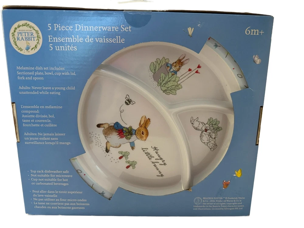 This 5 piece dinnerware set includes everything your little one needs to enjoy a meal with Peter Rabbit and friends. Made of durable melamine material, the set includes a fork, spoon, bowl, plate, and cup, all featuring whimsical illustrations from Beatrix Potter's beloved children's book series. Perfect for young children, this dinner set is sure to make mealtime a fun and exciting experience. The set was manufactured in 2016 and is part of the Kids Preferred brand, known for high-quality products for kids. Get your little bunny ready for mealtime with this adorable Peter Rabbit dinnerware set!