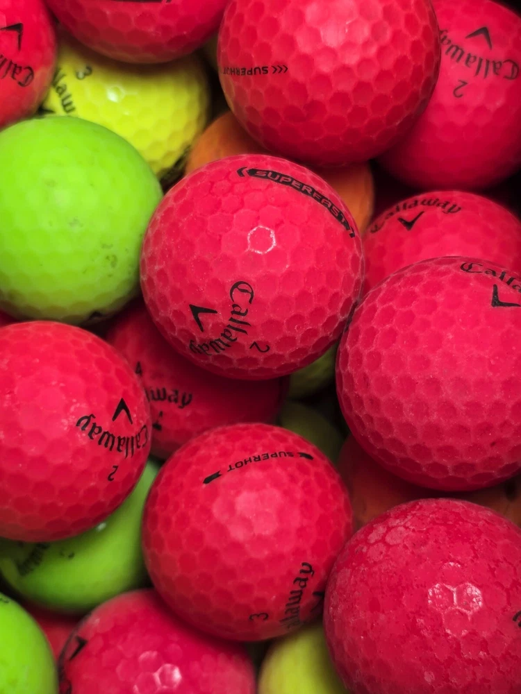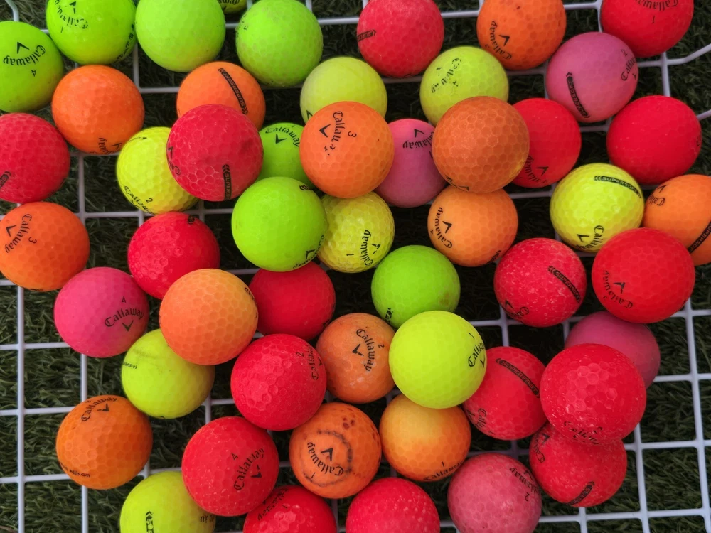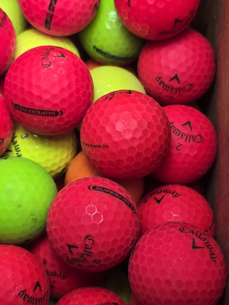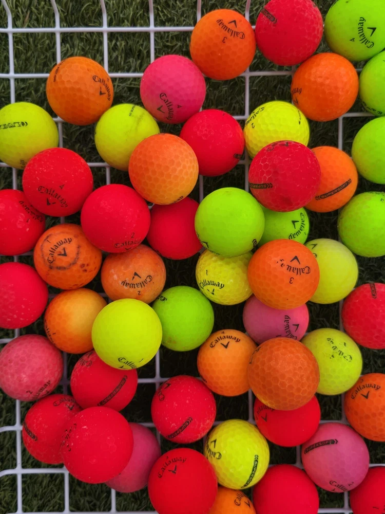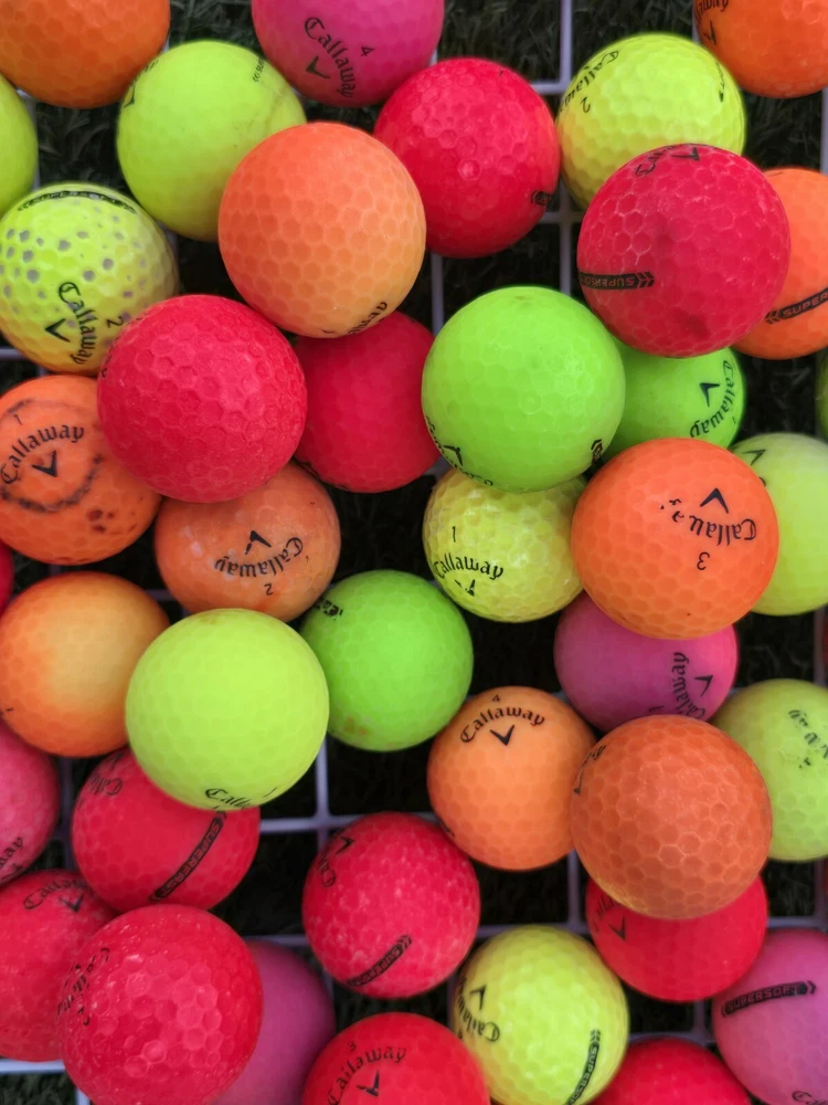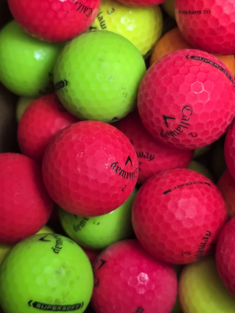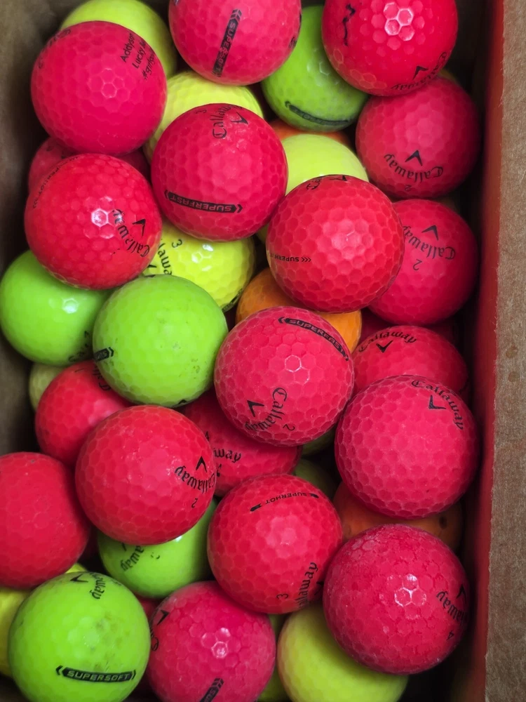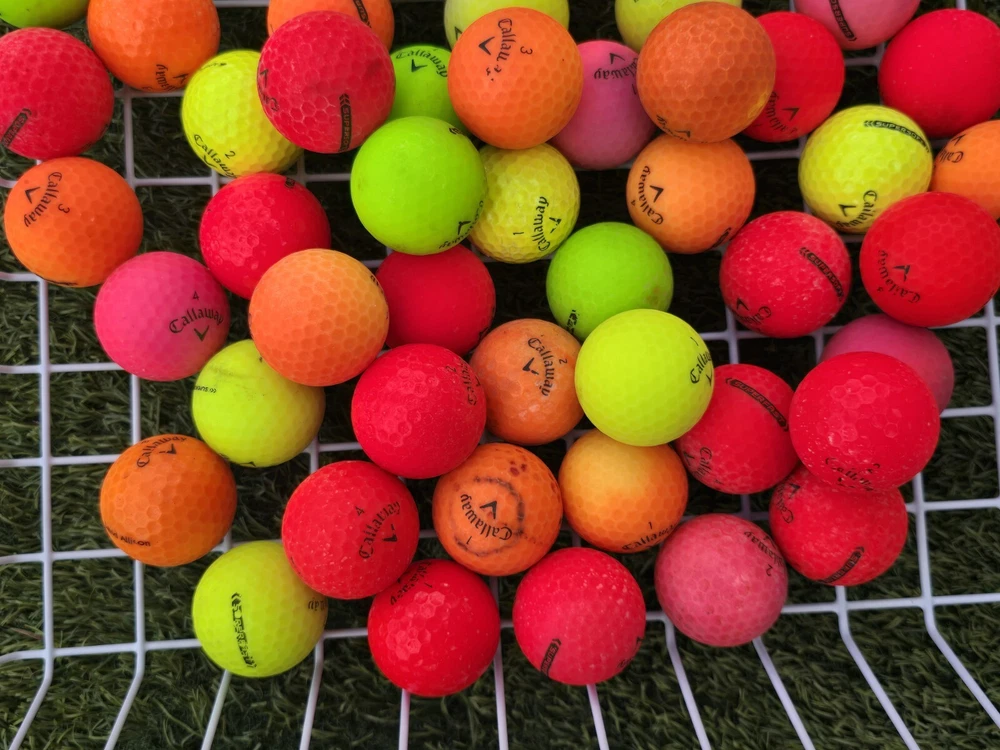 Enhance your golf game with this set of 50 Callaway Supersoft MATTE golf balls. These balls are perfect for a match and come in an assortment of colors including pink, green, yellow, orange, and red. The 3-piece construction and medium compression rating make them ideal for both short and long game. These golf balls are in excellent shape and are near mint, with a letter grade of AAA. They are made of high-quality Ionomer material and are suitable for any golf enthusiast. Whether you are a beginner or a pro, these balls provide great value and control. The set weighs 2 pounds and is perfect for an event like the Arnold Palmer Cup.