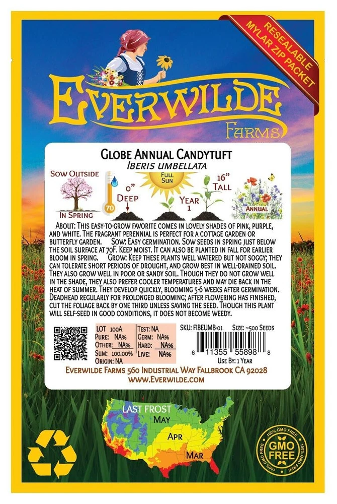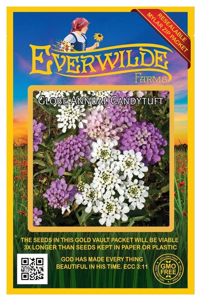 XL Mylar Packet - Globe Annual Candytuft Seeds Gold Vault Mylar Zip Packet This plant's genus name of "Iberis" indicates its original home on the Europe's Iberian Peninsula. It often grows on the rocky slopes and hills of coastal regions as well as the rest of Europe. It became known in colonial American gardens in the late 18th century, and well known horticulturist Bernard McMahon first offered its seed for sale in the 1804 edition of his Catalogue. The common name "candytuft" actually originated from the flower's presence on the Mediterranean island of Candia, an ancient name for Crete. Direct sow in fall for the earliest blooms, or after the last spring frost for early summer bloom. Plant more every several weeks for continuous flowers. Though these plants do not respond well to transplanting, they can also be started indoors in peat pots; sow just below the surface of the soil, keeping it evenly moist and at a temperature of 65-70 degrees F. Germination usually occurs within 15-20 days. These seeds are non-GMO (Genetically Modified Organisms), and are also free from all Neonicotinoids . They are packaged in our superb Gold Mylar Mylar Zip Packaging, which gives the seeds the best storage possible, and allows you to reseal the bag for later use. The artwork and labels on the packet are loaded with information - many people comment that it is the most beautiful packet that they have ever seen. If you have never tried out our seeds before, this is your chance to experience something special!