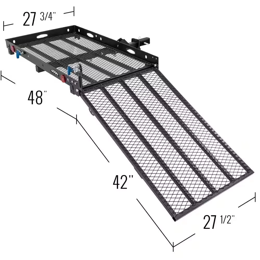 Store New Arrivals Add to Favorite View Feedback Contact 500 Lbs. Capacity Hitch-Mounted Folding Steel Wheelchair or Scooter Carrier with 42 In. L Ramp Description Automotive Part Type Cargo Carrier Color Black Features Folding General Part Type Cargo Carrier Included Parts Installation Hardware Material Steel Mount Location Hitch Product Weight (lb) 71 lb Returnable 90-Day Weight Capacity (lb) 500 lb Manufacturer Warranty 1 Year Hitch Receiver Size (in) 2 in Product Height (in) 3 in Product Length (in) 27.75 in Product Width (in) 48 in Transport mobility scooters or wheelchairs Carrier folds up for smaller footprint when not in use Ergonomically-designed T-handles for easy use Easily transport your power scooter or wheelchair anywhere with the Silver Spring Folding Scooter and Wheelchair Carrier. The innovative 42 in. L 3-position ramp allows you to easily load and unload your scooter and, when not in use, the ramp folds flat to the carrier for tailgate or hatch access. Best of all, with our specially designed hitch attachment, this carrier folds up against the back of your vehicle when not in use to make driving and parking easier. For most vehicles with this folding attachment you will be able to park your car in your garage without removing the carrier. The specialty ergonomically designed spring pin handles included on this mobility carrier make operation incredibly user friendly. These exclusive carrier handles eliminate the difficult standard style pin-rings, allowing users to simply grab and pull when you need to position the loading ramp. Also included with the carrier is an anti-rattle device which slides onto the hitch tube to prevent the rack from wobbling during transportation. Durable and lightweight, this is one of the most user-friendly wheelchair carriers on the market. Scooter or wheelchair cargo carrier rack designed for designed for Class III or IV 2 in. hitch receivers Maximum 500 lb. weight capacity can support most 4-wheeled scooters Includes anti-rattle device, 5/8 in. hitch pin, T-handle spring pull pin Built-in 42 in. folding loading ramp 10 Tie-down points to secure your mobility device Folds upright against vehicle when not in use for a tighter footprint while parked Durable powder-coated steel construction ABOUT US We offer the best prices around on high quality products. Our E-store includes tools, general home, garden items and more. SHIPPING We are always working hard to ensure your package arrives as soon as possible. Please understand that some factors like weather, high postal traffic, and the performance of shipping companies are outside of our control. We offer free shipping to the lower 48 states and ship within 4 business days of payment, usually sooner. We do not accept P.O. Boxes. Please provide a physical address. RETURNS We offer a 30-Day Return Policy on items which you are not completely satisfied with. You have the option for a full-refund or an exchange of the item. No returns are available on items shipped outside of the USA. PAYMENT We accept PayPal. CONTACT US This page content is yet to come Please ad us to your favorite seller and visit again later Thank You CUSTOMER SATISFACTION We try our very best to make sure every customer is completely satisfied. If there's a problem, message us! We're happy to help. WE ACCEPT Copyright © 2017 AutoDs. | All Rights Reserved