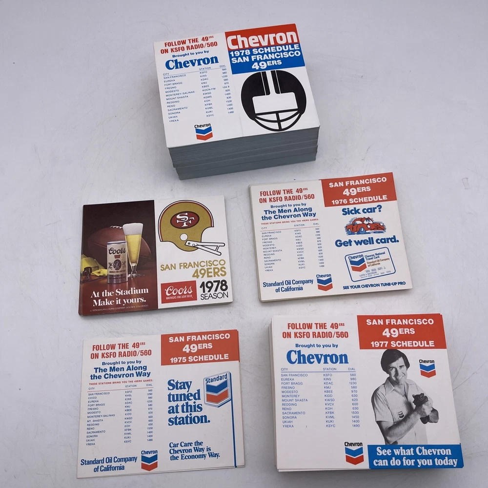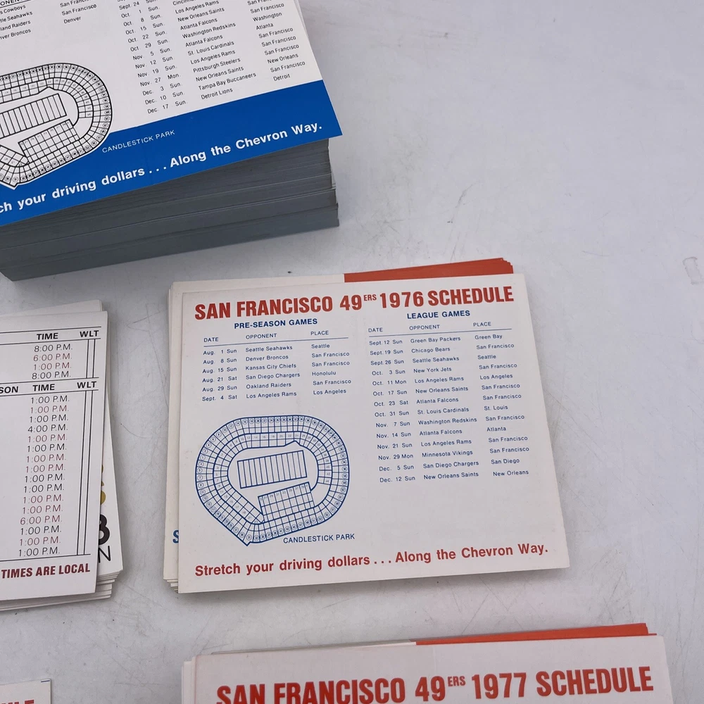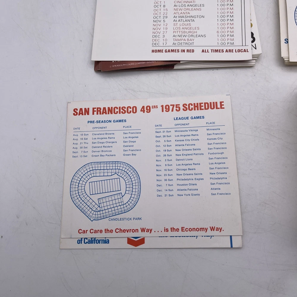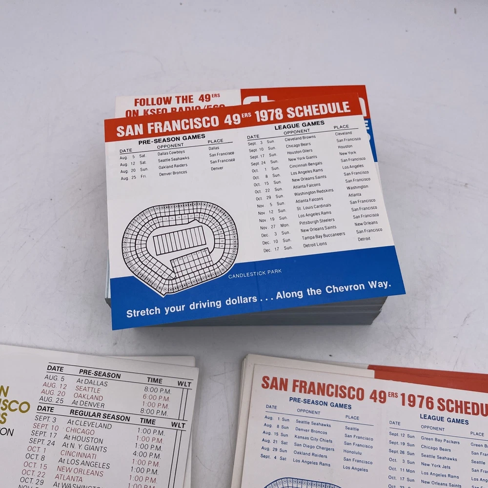San Francisco 49ers Schedules 1975 Chevron - 2 1976 Chevron - 40+ 1977 Chevron - apx 200 1978 Chevron - 270+ 1978 Coors Beer - 25+ Thanks so much for stopping by! Let us know if you have any questions or need any additional images. Please take a look at our other vintage treasures.
