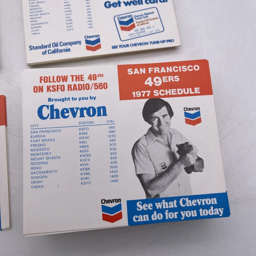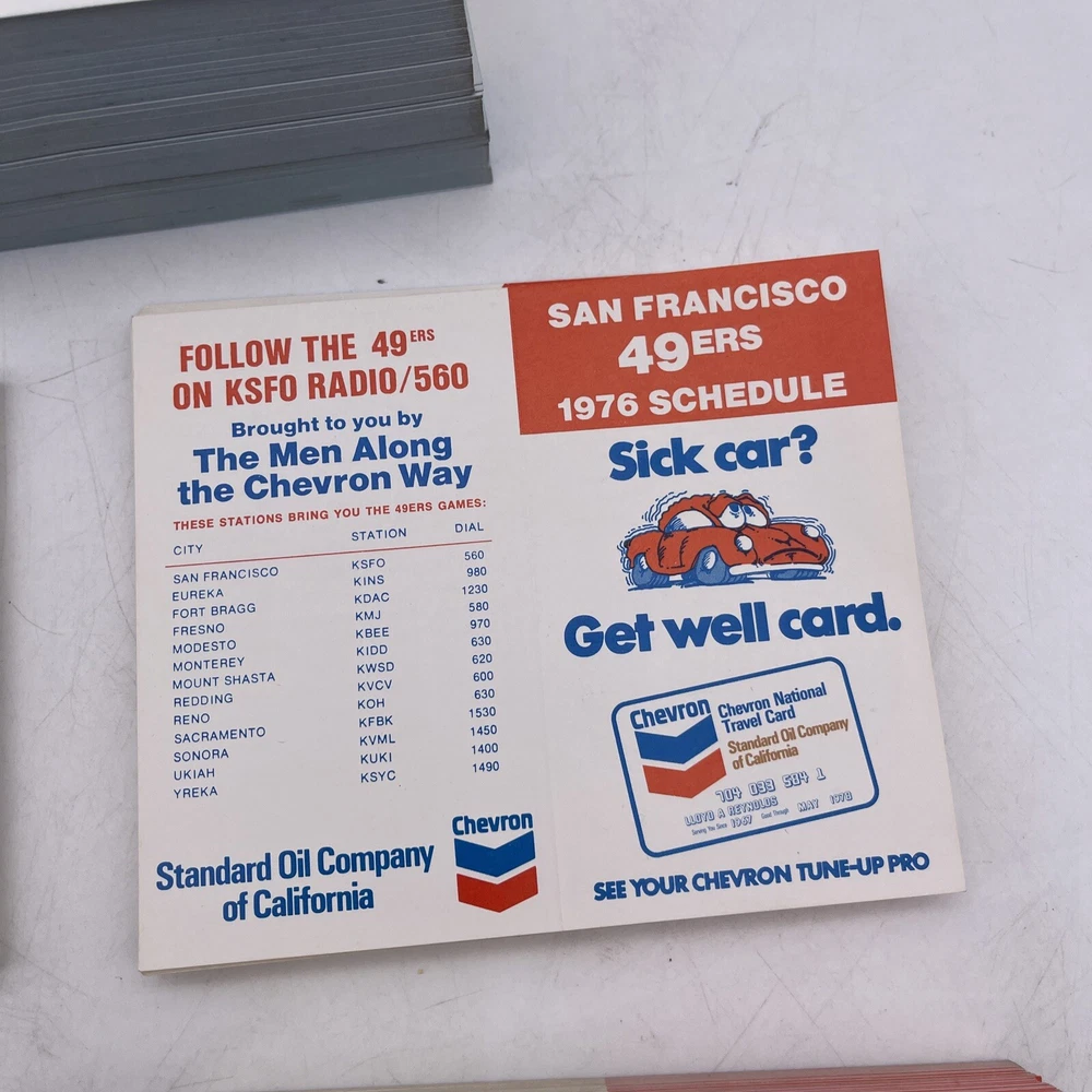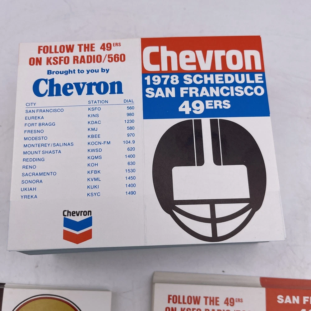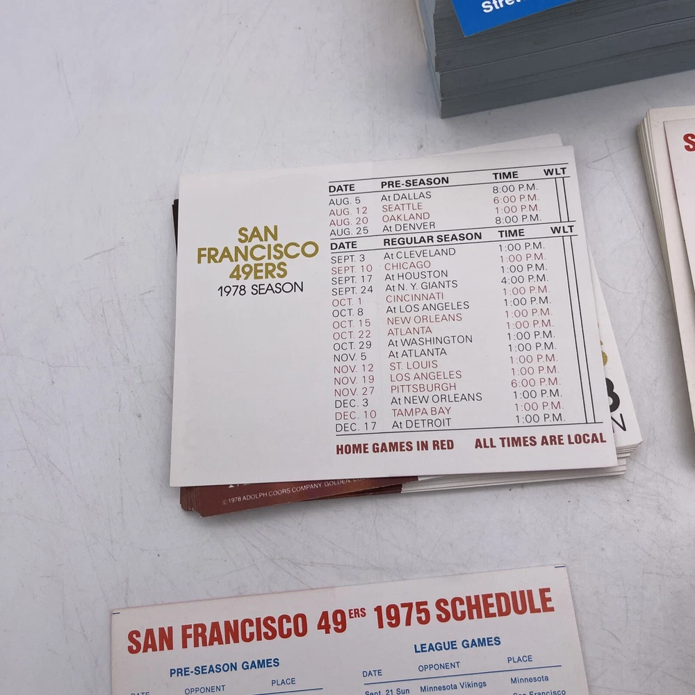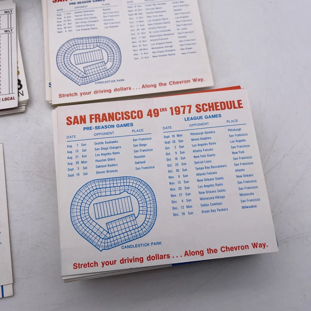 San Francisco 49ers Schedules 1975 Chevron - 2 1976 Chevron - 40+ 1977 Chevron - apx 200 1978 Chevron - 270+ 1978 Coors Beer - 25+ Thanks so much for stopping by! Let us know if you have any questions or need any additional images. Please take a look at our other vintage treasures.