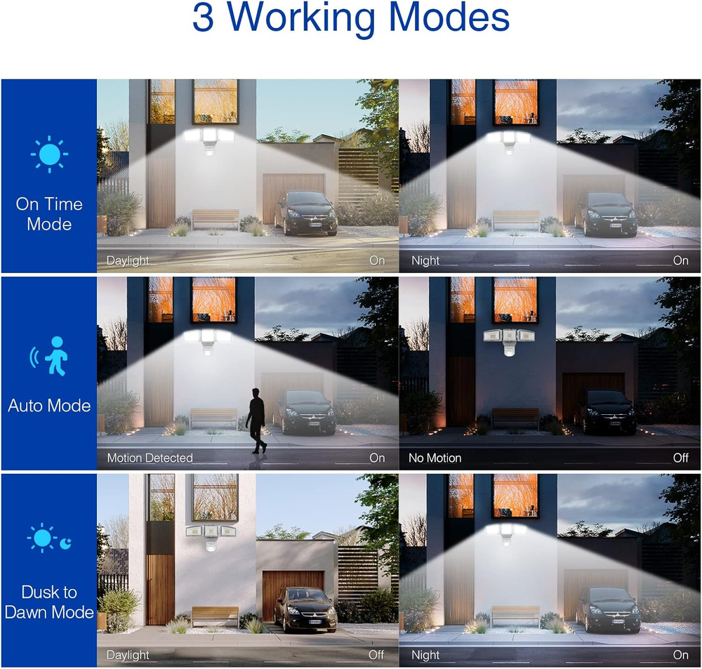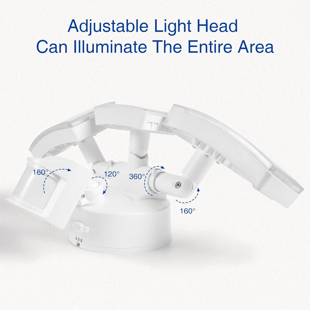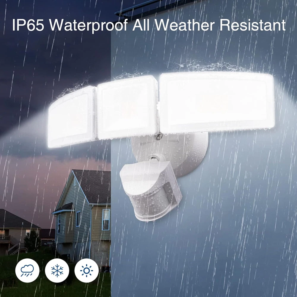 【3 COLOR TEMPERATURE ADJUSTMENT】: This security flood lights with motion sensor offers you the option to choose your color temperature directly with one flood light. With the 3 CCT color button, you can choose between 3 color temperatures from warm white 3000K and cool white 4000k and daylight 5000K. You can easily install the light anywhere you want. 【3 LIGHTING MODE CONTROL】: Saatly motion sensor outdoor lights have 3 working modes. First, On-Time Mode, light allows manual control on and off of the light.Second, AUTO Mode, when the movement is detected in darkness, the light will turn on & after 5 seconds to 5 minutes it will turn off depending on your setting on the “Time” button. Third, Dusk To Dawn Mode, light will automatically turns on at night and stays off at daytime, work only during the night. 【40W BRIGHTNESS & ENERGY SAVING】: This 40W outdoor flood light is powered by ultra bright 160 LED beads, through optical filter lenses, the flood light shines anti-dazzle beams, giving a comfortable lighting experience. producing up to 4600lm high brightness, equivalent to 160W incandescent bulbs, saving 80% of your electricity bill. 【ENHANCED MOTION SENSOR】: LED outdoor security lights are highly sensitive, with built-in sensors that respond quickly after monitoring the motion of humans, cars or pets. The outdoor sensor light can be illuminated from 5 seconds to 5 minutes (support your own manual settings). The light supports 180° motion detection angle and the sensing distance can reach 72 feet, protecting the safety of your yard and bringing you an intelligent and user-friendly lighting experience. 【IP65 WATERPROOF】: The outside motion sensor light and its sensor are made of full aluminum, have an excellent heat dissipation, which is more durable and the lifespan of light will be up to 50,000hrs. The lights are equipped with IP65 waterproof material, they can adopt any weather like a rainstorm, sleet or snow. Perfect motion flood light for porch, back yard, front door, garage, driveway, walkway, garden and step, etc. Product Description Dusk to Dawn Mode Sensor lights outdoor motion detection will automatically turns on at night and turns off at daytime, work only in the night. (Please set the LUX to the min) Wattage: 40 Watts Luminous Flux: 4600 Lumen Color:3000K/4000K/5000K Adjustable Detection Angle: 180 Degree Length: 384.64mm / 15.14inch Special Features: IP65 Waterproof, Motion-Sensor Specific Uses: Backyard, Front Door, Driveway Shade Material: Full Aluminum Bright & Wide Sensing Range Flood Light Why choose Saatly LED Security Lights ? Saatly security motion sensor outdoor lights provide wide-angle illumination with 3 adjustable heads design. You can freely move the spot lights upwards, downwards and horizontally, cover your home or business with flexible security lights. three color adjustable, you can choose different lights according to your different scenes every day, equivalent to you spend one money to buy three lights, but also for you do not know what color to choose and save time. Saatly security light has 3 independently rotating light heads Recommended installation height is 7.2 FT -14.8 FT The operating voltage of the security light is 120V (110V-130V) 3 color temperatures (3000K/4000K/5000K) to choose from Not Solar Powered, Lights are AC Power Hardwired Please make sure the motion sensor faces the person when mounted on the eave/soffit, and we suggested mounting on the wall Om Time Mode If you need a light that doesn't go out at night, you can choose saatly LED security light. The outdoor security light installation process was simple. You can use the switch to control the light directly or to keep the it on constantly. Auto Mode Saatly Outdoor LED Motion Sensor Light with Maximum 72ft detection range/180° sensing angle provides you with a wide range of motion detection to help you detect cars, humans and pets. Dusk to Dawn Mode Upgraded dusk to dawn flood light with the photocell sensor, this outdoor motion sensor security light can automatically turn on at night and go off at daytime, which greatly save your electricity bills. Adjustable Head & Motion Sensor This LED security light has 3 adjustable heads, you can rotate them to a positon according to your needs, so you will have more installation angle options, customize your lighting area.(Note: Make sure the motion sensor face outside when mount on soffit/eave. We recommend mounting on the wall) Aluminum & Heat Dissipation All-aluminum head is corrosion-resistant and will not fade even after decades. Excellent heat dissipation makes the lamps durable, with a service life of up to 50,000 hours. By choosing Saatly's security lights, you can reduce the number of times you have to replace your lights, saving your money. IP65 Waterproof The three-head 160 LED bead security light is waterproof to IP65, ensuring safety for outdoor use against rain, snow or hail. It can be used in any weather.