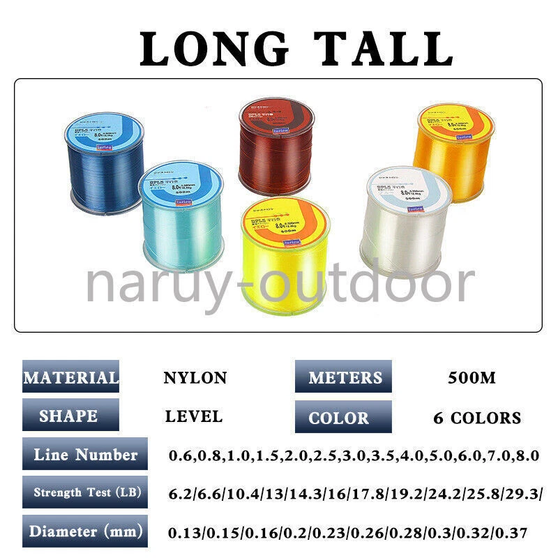 500M fishing line test table Line Number 0.6#: 0.13mm / 6LB Line Number 0.8#: 0.15mm / 7LB Line Number 1.0#: 0.16mm / 10LB Line Number 1.5#: 0.2mm / 13LB Line Number 2.0#: 0.23mm / 14LB Line Number 2.5#: 0.26mm / 16LB Line Number 3.0#: 0.28mm / 18LB Line Number 3.5#: 0.30mm / 19LB Line Number 4.0#: 0.330mm / 24LB Line Number 5.0#: 0.370mm / 26LB Line Number 6.0#: 0.405mm / 29LB Line Number 7.0#: 0.435mm / 32LB Line Number 8.0#: 0.470mm / 35LB Features: 1.Smooth design increase casting distance and overall fishability. 2.Best Material From Janpan is good for sea carp.etc fishing 3.Braided by the machine from German make the line more rand than others and ensure casting longer. 4.Bulkly knots eliminated, gives incredible contact with your catch. 5.Nearly zero water absorption, is best fro saltwater, blue lake fishing. 6.No unpleasant odor on Poseidon line, is healthy. 500M Fishing Line Capacity Details: The fishing line has a small diameter. Less capacity on a transparent plate. The fishing line has a large diameter. There is much capacity on a transparent plate.