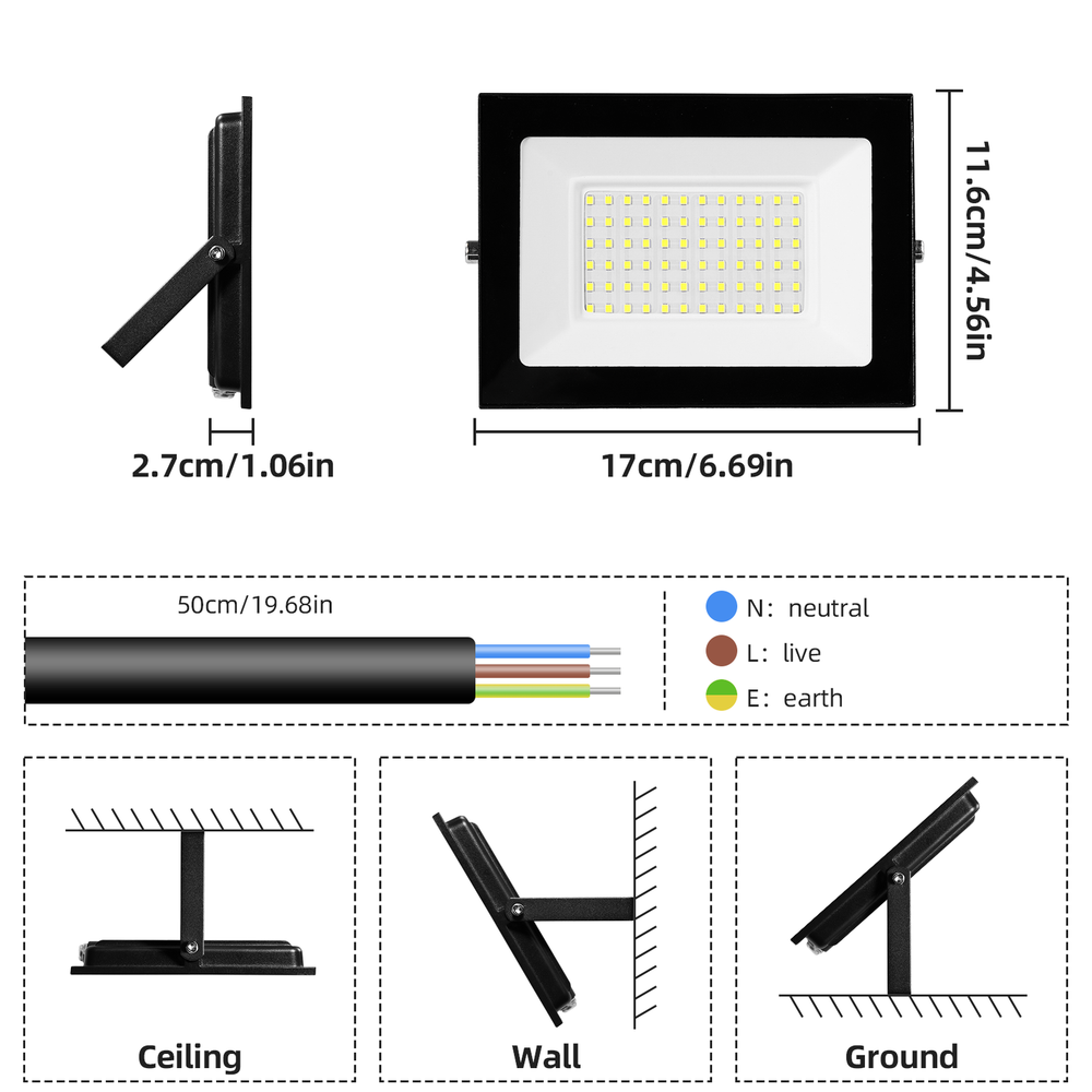 新建网页 2 新建网页 1 新建网页 1 Product Description 新建网页 2 新建网页 1 Features: 1. High lumens without radiation: LED lighting creates healthy life without radiation, flash frequency and flash. It is manufactured with high lumen LED chip, turn-on delay, instant sparkle, 100% brightness. 2. Good heat dissipation performance: The high-efficiency aluminum body is used, which is impact resistant and has good heat dissipation performance, and the new thermal circuit with convection design has good heat dissipation performance, which prolongs the service life of the bulb. 3.120° wider angle beam: LED floodlights provide super bright, shadow-free and wide beam distribution light for general outdoor outdoor floodlights. 4.IP66 waterproof: IP66 rating, which means you don't have to worry about water penetration to get the job done. Note that floodlights cannot be immersed in water. 5. Indoor and outdoor lighting: basketball/football field, garden, courtyard parking lot, hotel, square, landscape. Specification: Power: 50W Color Temperature: Cool White (6000K-6500K) lumens : 100lm/W Size (cm): 17x11.6x2.7cm/6.69*4.56*1.06in Voltage: AC85-265V Impact resistance: IK08 Reflective cup material: Nano refractive index of 95% LED Chip Code:2835SMD Material: Aluminum Waterproof grade: IP66 Beam angle: 120° Operating temperature: -20℃ to +55℃ Life: > 50,000 hours line length:50cm Dimmable: No =