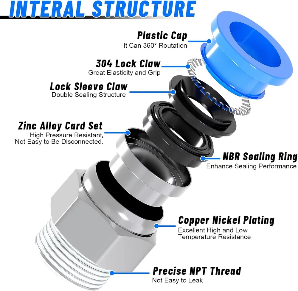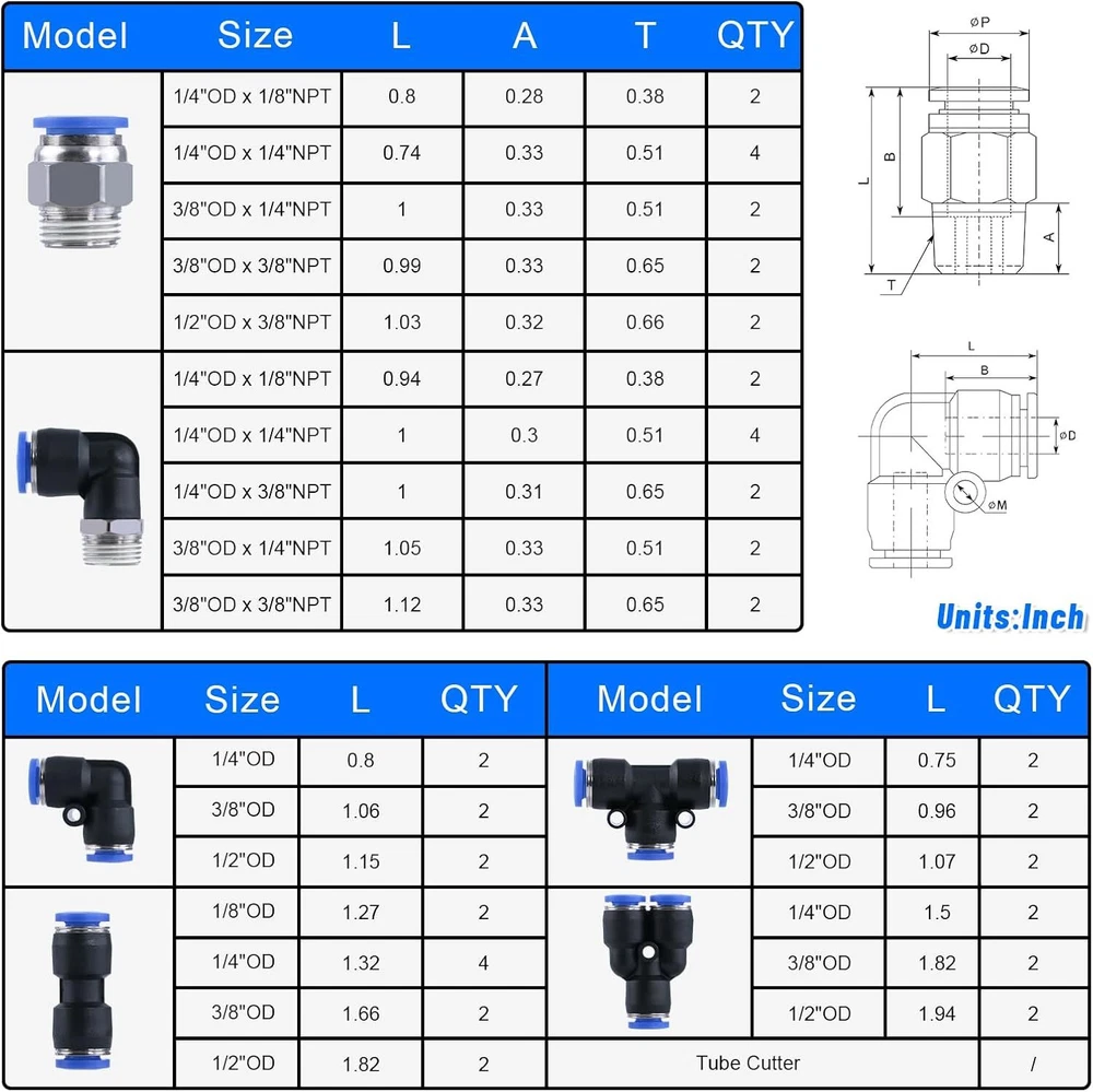 53 Pcs Quick Connect Air Hose Fittings Kit 1/8" 1/4" 3/8" 1/2" Air Line Quick... PREMIUM MATERIAL - Quick connect air hose fittings kit made of high quality Polybutylene Terephtalate (PBT) and with stainless steel lock claw and good steel washers for a thousand bounces. High pressure resistance and environmental, can withstand strong pressure without tripping 53 PCS KIT - The air line quick connect fittings includes 53 pcs fittings: 12 pcs Straight Connectors with NPT Thread. 12 pcs 90° Elbows Connectors with NPT Thread. 8 pcs Straight Union Connectors. 6 pcs Tees. 6 pcs 90° Elbows Connectors .6 pcs Splitters Connectors.1 pc Tubing Cutter. Pneumatic fitting types: 1/2", 3/8", 1/4", 1/8". All in a durable yet lightweight plastic storage container with flip lock tabs, rust and secure WIDE APPLICATION - Our air line fittings are suitable for PU / PA / PE / PVC lines or hoses. They widely applied in manufacturing production lines, truck,trailer repairs, Pneumatic tools, instruments, mechanical gas piping and laboratory automation equipment. Besides those, daily gardening maintenance and lawn mower machine areas also need those items EASY TO INSTALL - Push to connect air fittings assortment is a simple push in design and easy to be installed. Release rings at the top could be pushed down easily when inserting the tube into the coupler and bouncing up immediately when taking out the tube. Cutting tool is included for meeting your tube length requirements MAX WORKING PARAMETER - Fluid type: air, vacuum, 0 -145 Psi, 0 - 0.9 Mpa. Proof pressure: 1.32 Mpa. High pressure resistance, long service life. Temperature Range: 0 - 60 °C | 32 - 140 °F Shipping We offer FREE shipping on all orders! We ship within Three business days of payment, usually sooner. Local pickups and combined shipping options are not provided at this time. Return You can return a product for up to 30 days from the date you purchased it. Any product you return must be in the same condition you received it and in the original packaging. Please keep the receipt. Payment We accept payment by any of the following methods: PayPal Please pay as soon as possible after winning an auction, as that will allow us to post your item to you sooner! Feedback Customer satisfaction is very important to us. If you have any problem with your order, please contact us and we will do our best to make you satisfied. Contact Us If you have any queries, please contact us via ebay. We usually respond within 24 hours on weekdays. Please visit our eBay store to check out other items for sale! Thank you for shopping at our store.