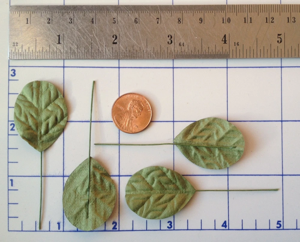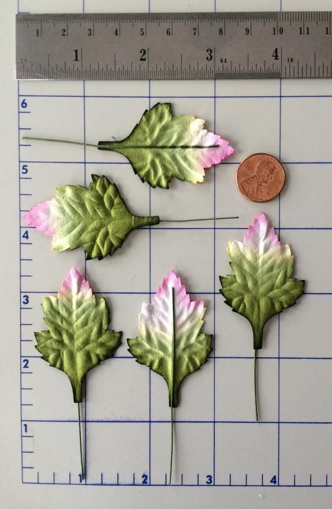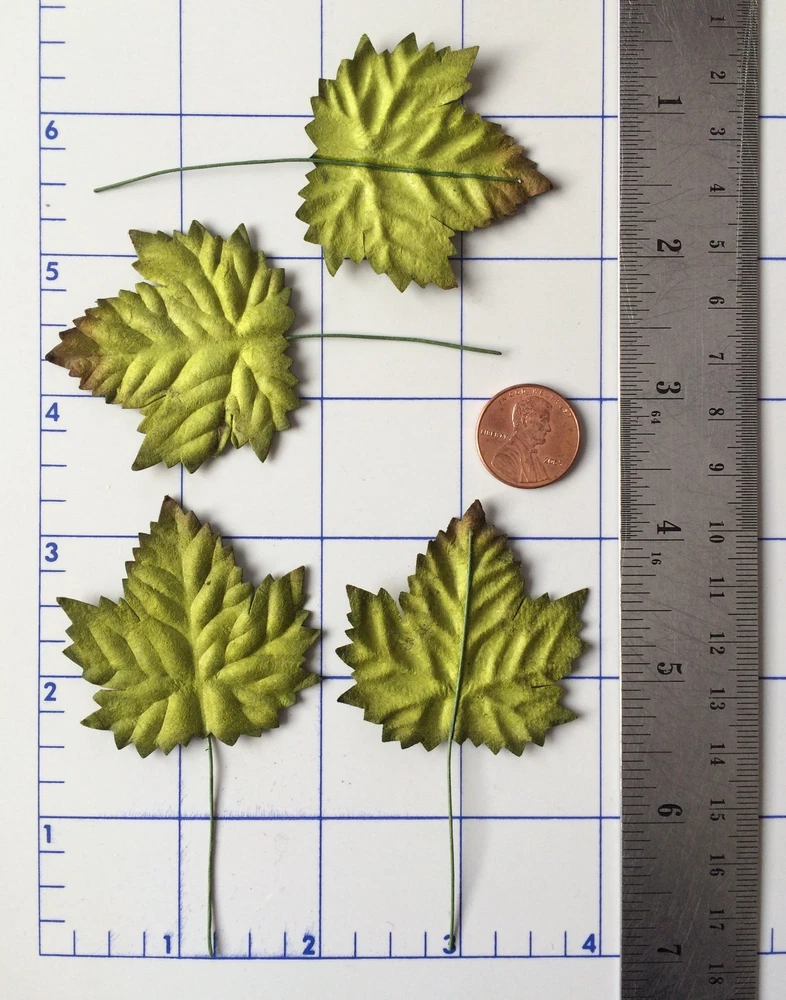 55 assorted leaves. These leaves are packaged separately by style. The leaves range in size from approximately 1 1/8"-2 3/4" in length, excluding the wire stems. Photo 3- Quantity 5 leaves. Approximately 3 13/16" (4.6cm) long x 5/16" (8mm) widest point. Photo 4- Quantity 10 leaves. Approximately 1 1/4" (3.2cm) long x 15/16" (2.4cm) widest point. Photo 5- Quantity 5 leaves. Approximately 1 3/4" (4.5cm) long x 1 3/4" (4.5cm) widest point. Photo 6- Quantity 10 leaves. Approximately 5/8" (1.7cm) long x 7/16" (1.1cm) widest point. Photo 7- Quantity 5 leaves. Approximately 1 11/16" (4.3cm) long x 1 1/16" (2.7cm) widest point. Photo 8- Quantity 5 leaves. Approximately 2 1/8" (5.3cm) long x 1 5/16" (3.4cm) widest point. Photo 9- Quantity 10 leaves. Approximately 1 1/8" (3cm) long x 15/16" (2.4cm) widest point. Photo 10- Quantity 5 leaves. Approximately 2 3/4" (7cm) long x 1 1/16" (2.7cm) widest point. Mulberry paper is acid and lignin free and suitable for long lasting projects.