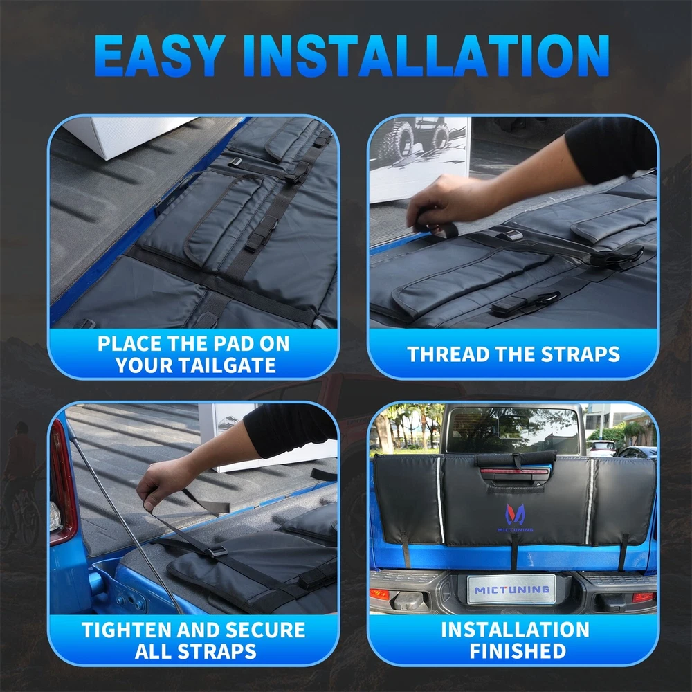 Tailgate Pad Bike Rack for 5-Bikes Tailgate Pad Pickup Truck Bed Protector Cover MICTUNING Tailgate Bike Pad for Mountain Bike, Secure 5 Bikes on Truck, with Reflective Strips and Tool Pocket, for Outdoor Bicycle Transportation About the item: Secure Transport for up to 5 Bikes - Our 50"L X 16.5"H X 8.25"D Tailgate Pad Features Adjustable Straps That Hold up to 5 Bikes Firmly in Place, Protecting Both Your Truck and Your Bikes from Scratches or Damage During Transport Built for All Weather Conditions - Made from 600d Pvc, the Bike Pad's Waterproof and Abrasion-resistant Outer Layer Protects Against the Elements. the Soft Flannelette Inner Layer, Combined with a Thick Shock-absorbing Pad, Ensures Your Bikes Stay Safe and Steady on Bumpy Roads Enhanced Safety with Reflective Strips - High-visibility Reflective Strips Improve Safety During Nighttime or Low-light Trips, Making Your Truck Easily Noticeable to Other Drivers Backup Camera-friendly Design - Features a Roll-up Window That Aligns with Your Backup Camera, Maintaining Full Functionality for Hassle-free Parking and Navigation Tool Pocket on the Back - Keeps Your Repair Tools and Small Accessories Organized and Easily Accessible, Ensuring You're Always Prepared for Your Outdoor Adventures Payment Delivery details Terms of sales About us Contact us Payment -PayPal - We ONLY ship your item to your PayPal shipping address. If you want your package to be sent to any address other than your Paypal shipping address. -Please state it clearly in the PayPal note section and also confirm with us by sending message. -Payment is expected within 5 days after auction end. This is serious business, so please make sure you are serious before bidding the item. Delivery details -All the orders will be processed within 2 business day after payment received. -Tracking number will be uploaded after we ship it. Please don't worry. -If there's any delivery issue, feel free to contact us in time before file a case. Thanks. Terms of sales Replacement is available for wrong or defective item receipt within the first 30 days , it's free of extra charge. Please contact us for the return procedure. About us Our working time: Beijing Time: 9:30-18:00 from Monday 9:30 to Saturday 18:00 New York Time: 21:30 – 6:00 from Sunday 21:30 to Saturday 6:00 Please just leave us message, we will reply you as soon as possible. Contact us -We will leave positive feedback for each buyer firstly . If you are happy with the transaction, please give all 5-star ratings. Thank you in advance! -We value client service as well as product quality. Please don't leave us any negative feed back if there is something wrong with the product or you just not satisfied with the item. Please just feel free to contact us if there is any issue ,you will receive answer within 24 hours and we will offer the best offer to the issue. -We try our best to provide you happy solution by communication. -Welcome to place order from us! Wish you a happy shopping!