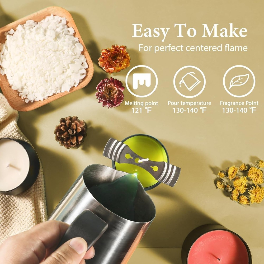 【NATURAL SOY WAX】Our candle wax that is 100% soy wax which burns evenly, clean and smell better. Without any worry of the unhealthy chemicals found in traditional paraffin wax. 【EASY DIY CANDLE MAKING】Beginners and experts alike will love our soy wax for candle making. Simply melt them down and mix at 120 degrees to get started; if you want to add dyes or scents, raise the temperature to 180 degrees (or 185 degrees if the dyes do not fully melt). That will help every beginner make handmade candles at home with ease and total safety. 【WIDELY USED】It can DIY beautiful candles with family, which can not only enhance parent-child communication, but also enhance happiness; Can be given to friends as Christmas gifts; You can also make candles with friends to convey the festive atmosphere and bring new fun. 【PERFECT CANDLE CREATIONS】Our premium soy wax ensure smooth tops and consistent scent in every candle. Ideal for DIY candle making, these soy wax mix well with scents, dyes, perfect for scented soy candles to transform any space into your ideal comfort zone. 【PROMISE】Shop with confidence, because no matter what, we have a solution for you!