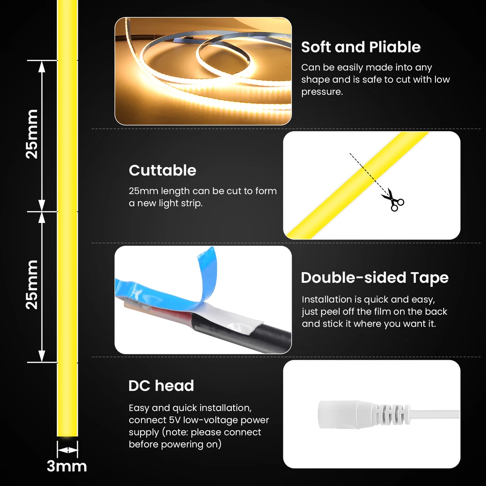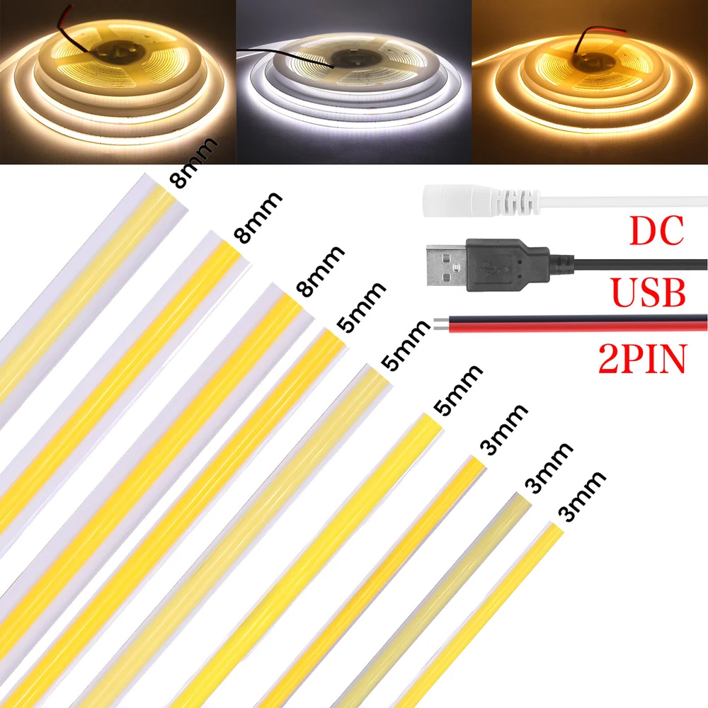 Specifications: Type: COB Led Strip Lights Input voltage: DC12V Power: 5-6W/m(5V); 8-10W/M(DC12V) FPCB Width: 3mm, 5mm, 8mm LED quantity: 320 LED/M Length: 0,5m, 1m, 2m, 3m, 4m, 5m Color temperature: Warm white (3000K), Natural white (4000K), Cold white (6000K) Cut length: 5V/12V 3mm: all 25mm 5V 5mm: all 25mm 12V 5mm: all 50mm 5V 8mm: all 25mm Waterproof quality: IP21 is not waterproof. Connection: 2-pin cable, USB-powered, DC connection USB plug cable length 15cm Operating temperature: -20℃~+45℃ Storage temperature: -20℃~+60℃ Viewing angle: 180° Propert ies: 1.Very smooth balance light, no illumination point, no dark area. 2. Super bright and soft light. 3.Much more bendable and flexible than any other SMD led strip. 4.Cuttable and jointable,can make any length you want. 5. RA>90, much friendly to eyes. Package included: 1x COB Led Strip