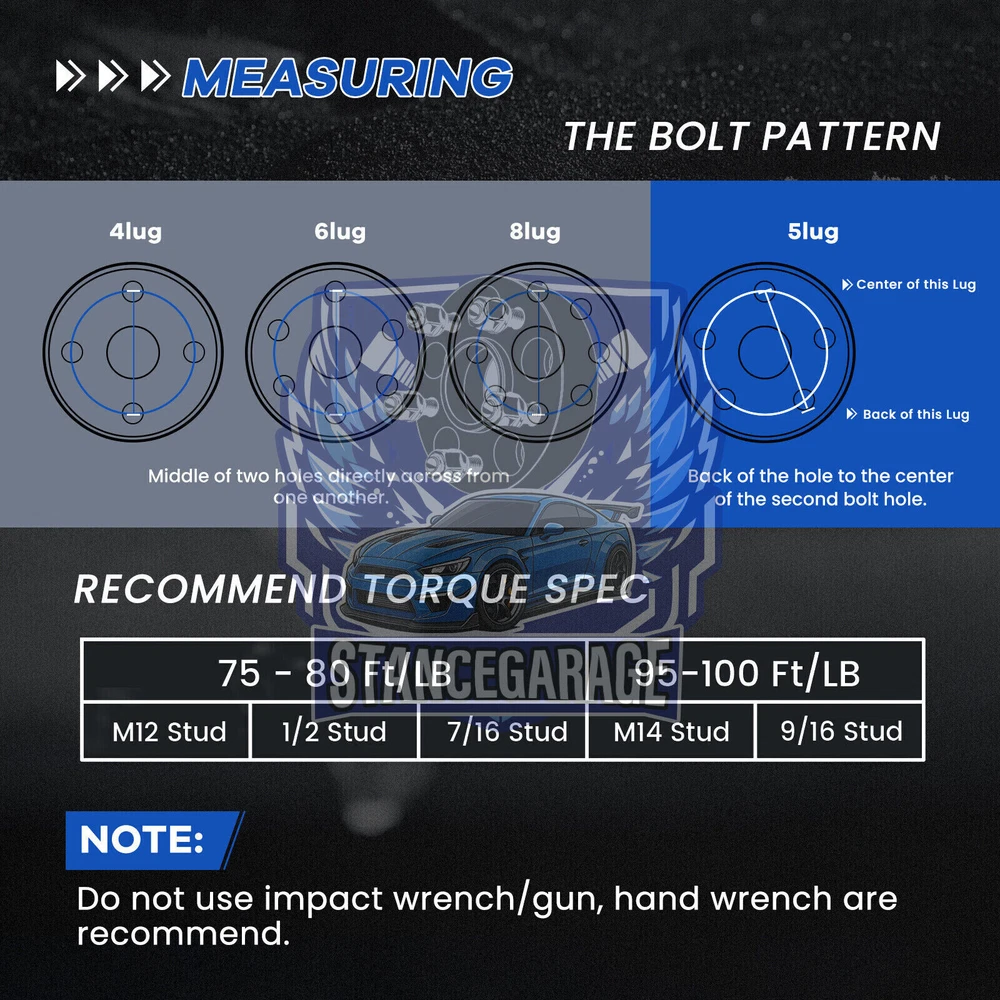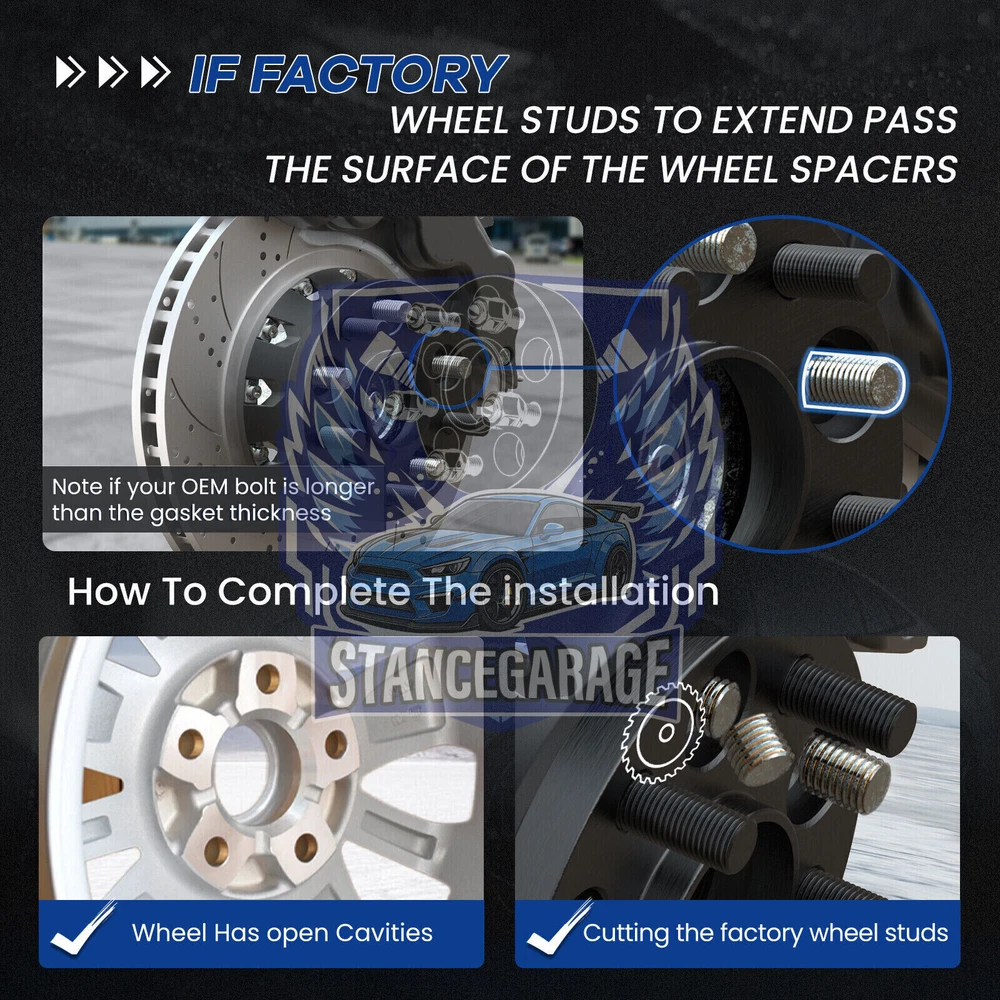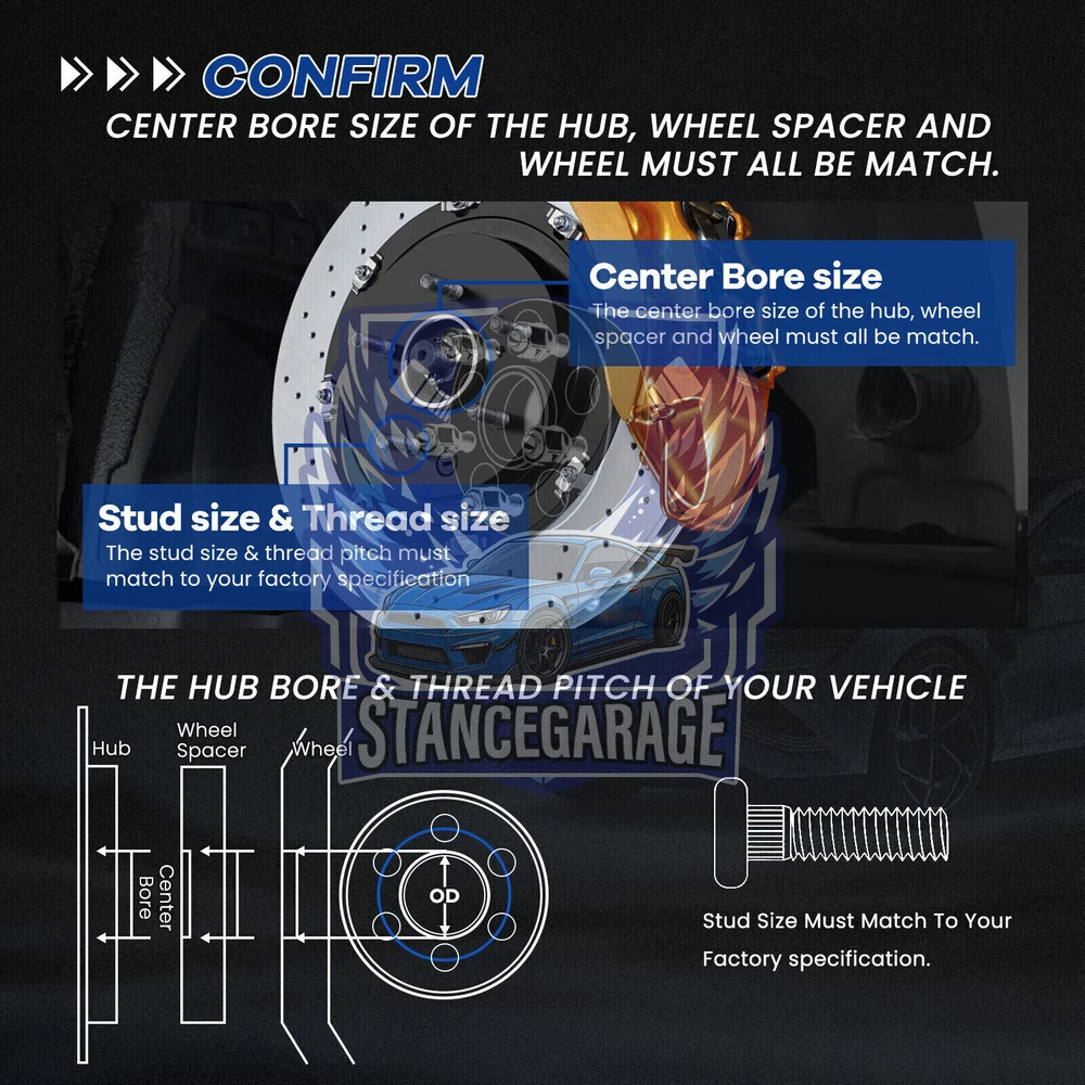 Adapter Width: 25mm (1 inch) each side Quantity: 4 Pieces Bolt Pattern: 5x108 Thread Pitch: 12x1.5 Center Bore: 65.1mm (Hub) to 63.4mm (Wheel Side) Adapter Type: Hub centric w/ Hub lip Wheel Lug Nuts in 12x1.5 Thread is Required, please use the wheel lug nuts with the matching seat type to the wheels (Conical seat or ball seat,,etc) Your Factory wheel studs may extend past the surface of the wheel adapters. In this case you will need to: 1. Fine-Tuning Stud Length: Modify the existing factory studs to the appropriate size, if necessary, to ensure a perfect fit with the added accessories. 2. Inspection for Adequate Wheel Clearance: Prioritize checking that your wheels have the required intervals or voids between each bolt hole to facilitate spacer use. 3. Opting for Compact Stud Solutions: In cases where it’s beneficial, make the transition to a custom shorter stud set, designed to supplant the standard factory studs, enhancing overall compatibility.