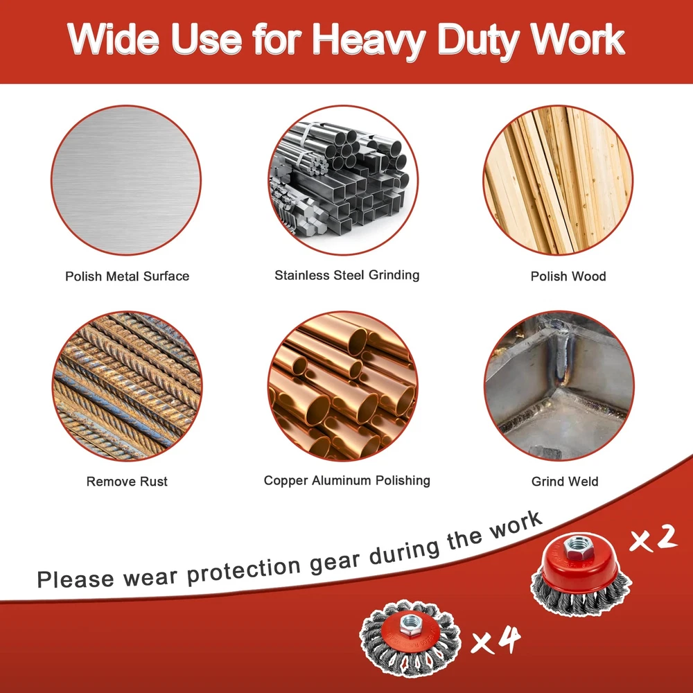 1.PACK INCLUDED: 4” knotted wire wheel*4, 3” knotted wire cup*2 2.HEAVY DUTY WORK: The wire wheel set is ideal for heavy duty work, it consisted of knotted carbon steel wire to perfectly remove rust,paint,burrs,spatters,corrosion and so on. The combination of 4” wire wheels and 3” wire cup can meet different requirements of the work. 3.PARAMETERS: This angle grinder wire brushes are constructed of 0.02” knotted high carbon steel wires, 5/8-11 UNC standard threaded arbor, running speed is up to RPM 12,500. 4.SAFETY AND STABILITY: The grinder wire brushes are coated with both sided hard steel plates to hold the wires better so as to prevent it from flying and falling. Carbon steel wires will secure a long durability to save the money. 5.IDEAL COMBINATION: This set of wire brushes provide 2 kinds of angle grinder brushes to meet different requirements of the heavy duty work. It will improve the grinding efficiency by using correct type of brush to increase the productivity.