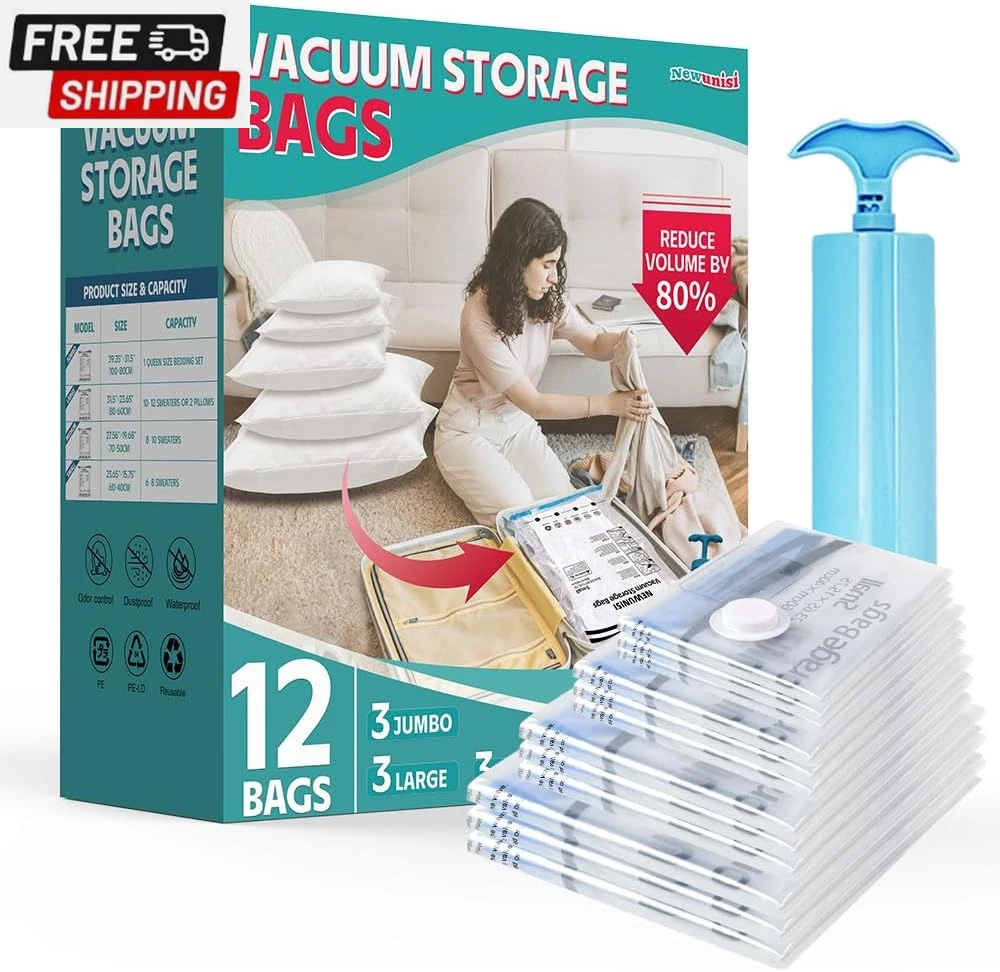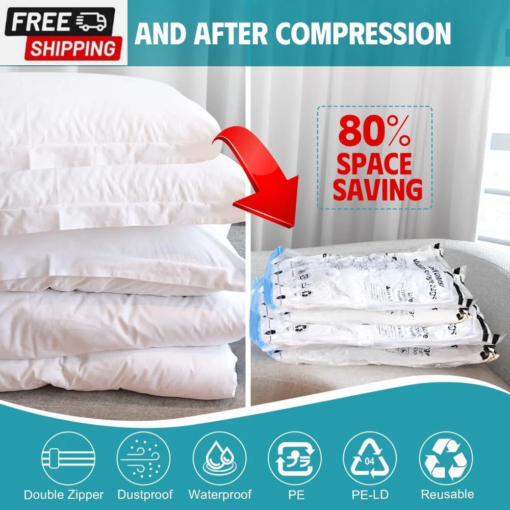 6 Pack Vacuum Storage Bags, Vacuum Seal Bags for Clothing, Comforters, Blankets, Space Saver Compression Bags with Hand Pump. (2×Jumbo, 2×Large, 2×Medium) Vacuum Seal Storage Bags: Variety sizes space saver vacuum storage bags for multiple sizes of items including clothes, comforters, pillows, and bedding. Volume reduction of 80%. Hand Pump Included for Easy Use: Works with a standard vacuum cleaner. Put the items in our storage vacuum bag, seal the zipper, suck out the air, and close the lid. 1 hand pump is included in the combo, which can be used during your trips. PA & PE: The compression bag is made of extra thick PA+PE, With a triple-seal turbo valve & double zipper seal design. Don’t worry about the long-term effects of storage in compression bags. Multi-use: Our vacuum storage bags are essentials for saving household space and organizing travel. It functions as a storage bag for clothes, comforters, and blankets. Package Included: 2×Jumbo(39.37” X27.5”); 2×Large: (31.5” X 26.65”); 2×Medium: (27.56” X 19.68”); 1×Hand Pump. Product Description Our vacuum storage bags combination is a must-have for you to save storage space! The compression bag is made of PA+PE material, which is highly flexible, durable, not easy to leak, and can be reused. Use our space-saver bags and store away various items including clothes, bedding clothes, blankets, pillows, plush toys, and more. What's more: you can use our compression bags to reduce larger and fluffier items such as vests and winter coats to minimal sizes with ease giving your clothing full protection and keeping your outfit dry. The package has vacuum storage bags of different sizes, suitable for various purposes: storage, travel, camping, moving, etc. 6 Pack Includes 2× Jumbo: 39.37” X 31.5”(100cm X 80cm) 2× Large: 31.5” X 23.65”(80cm X 60cm) 2× Medium: 27.56”X 19.68”(70cm X 50cm) 1× Hand Pump How To Use a Vacuum Storage Bag: PACK: Put the items inside our vacuum storage bag SEAL: Zip along the dual-zip 2-3 times and ensure the zipper is fully sealed VACUUM: Suck all the air out with a vacuum cleaner/hand pump included STORE: Close and secure the valve cap Usage Tips : Dehydrate all items before putting them away and storing them in vacuum bags. Avoid over-stuffing beyond the max volume line, use multiple bags instead. Double-check the zippers for full closure, and avoid stuff with sharp corners. Check leaking holes if there is a "hiss" sound, sticky tape should fix this problem. Re-vacuum the bags every 3-4 months for long-term storage. Vacuum storage is not suitable for down fibers and leather items. Shipping Fast shipping is very important for us. Our standard US shipping service is FREE. Your order will be shipped within 2-3 business days upon full payment received. Your order will be delivered within 2-3 business days after the handling time. We only ship to the confirmed PayPal address. We reserve the right to cancel any order for any reason at any time. We are not responsible for undeliverable addresses. Returns and payment We offer a 30 days return policy from checkout winning date. We allow only PayPal as payment method FeedBack Your feedback very important to us, after you get your package and you are satisfied with our service please leave us positive feedback If you have any problem with your order / any questions please before leave any type of feedback For any questions, using eBay contact system Please visit our eBay store to check out other items for sale! Thank you for shopping at our store.