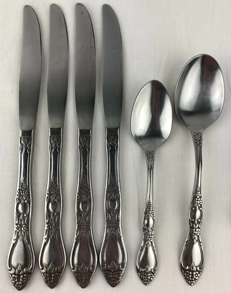 Wm A Rogers Oneida Flatware Lot includes: 4 dinner knives, 1 teaspoon and 1 tablespoons. Shows signs of light use and may need additional cleaning. Little spotting in places but no dishwasher or disposal damage. Overall very nice condition. Please see pictures for details as this is part of my description. Feel free to ask if you have any questions.