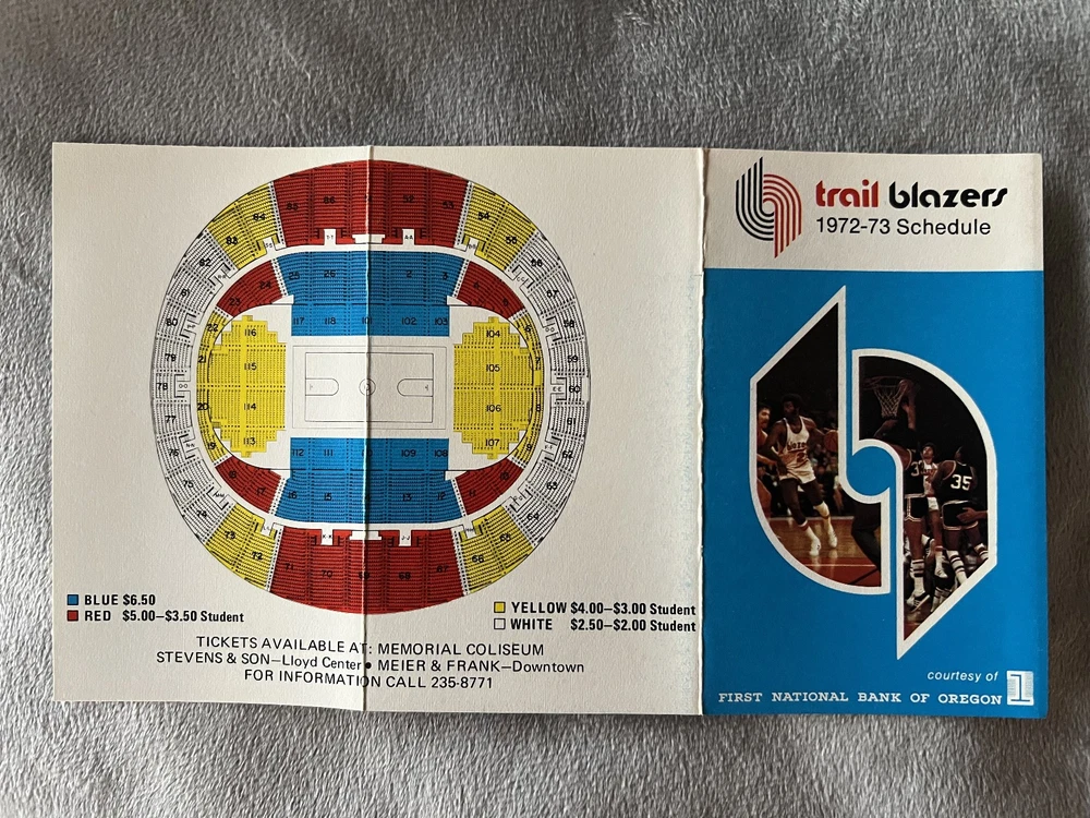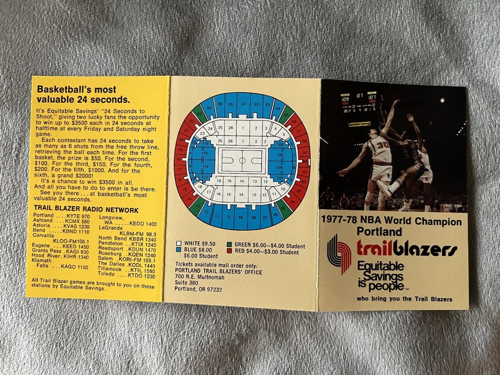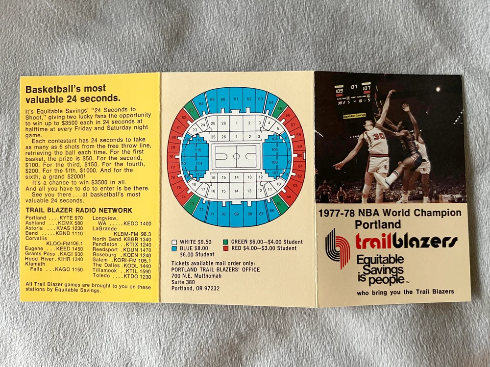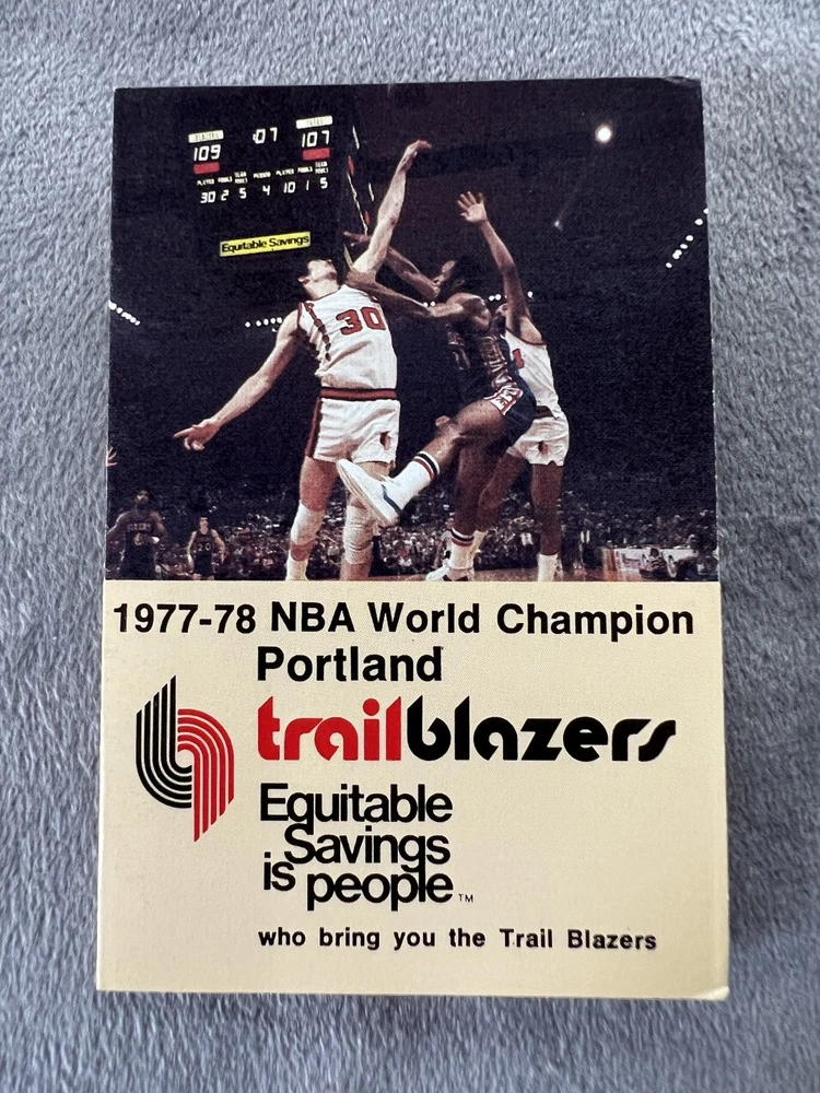 This "Buy it Now" offering includes six different original vintage Portland Trail Blazers NBA pocket schedules from the 1970s including the 1972-73 season through the 1977-78 season. The six schedules cover the time-period where the Trail Blazers went from a last place expansion team to becoming world champions, building their team on draft picks including Bill Walton, Lionel Hollins, and Maurice Lucas from the ABA. These six vintage pocket schedules are great pieces of NBA history and a key era in Portland Trail Blazers history. These schedules are offered at a low “Buy It Now” price and combined shipping discounts are offered with shipping fees waived (refunded at purchase) for additional schedule purchases after initial schedule purchase with buyer paid shipping, so see my listings for more! All schedules are carefully shipped in rigid packaging with tracking and insurance. Condition: The schedules are in excellent to near mint condition with only the slightest of edge and corner wear. The six schedules you will receive include: 1972-73 – Sidney Wicks and Geoff Petrie Lead the Team, Missing Out on Bob McAdoo in the Draft This is a beautifully graphic pocket schedule for the Trail Blazers' third year in the NBA. The photos on the schedule feature Sidney Wicks from UCLA, the Blazers first round draft pick in 1971; and Geoff Petrie from Princeton, the Blazers first round draft pick in 1970. The Season: After finishing a horrendous 18–64 the previous year, the Blazers had the number one draft pick in 1972 and hoped to choose Bob McAdoo, but the team could not come to terms with him prior to the draft and so selected LaRue Martin from Layola. McAdoo ended up in the basketball Hall of Fame after a 14-year career. Martin averaged seven points per game over his four-season NBA career. The Blazers only improved to 21-61 in the 1972-73 season. Schedule Details: The schedule is 2 5/8 X 4 3/8 inches, includes a seating chart of Portland's Memorial Coliseum and is sponsored by First National Bank of Oregon. 1973-74 – Sidney Wicks and Geoff Petrie are NBA All-Stars and the Blazers Draft UCLA’s Bill Walton This cover of this pocket schedule is dominated by a color photograph of the Blazer's first stars, Geoff Petrie and Sidney Wicks with Walt Frazier of the New York Knicks on defense. The Season: Both Petrie and Wicks earned all-star selection in 1974 but the Blazers still finished last in the Pacific Division with a record of 27–55, the worst record in the Western Division. Blazers' coach Jack McCloskey was fired at the end of the season. The Blazers poor performance won them one of the first two picks in the 1974 NBA draft and after a coin flip gave them the number one pick in the draft, they chose UCLA's Bill Walton. Walton's UCLA career playing under legendary coach John Wooden included two NCAA championships and 88 consecutive wins, smashing the 60-game streak set by Bill Russell's teams at the University of San Francisco. Walton was named the Naismith College Player of the Year as the top college basketball player in 1972, 1973 and 1974. Schedule Details: The schedule is 2 5/8 X 4 3/8, includes a seating chart of Portland's Memorial Coliseum and is sponsored by First National Bank of Oregon. 1974-75 – Lenny Wilkens as Playing Coach; Injuries Limit Bill Walton to 35 Games in His Rookie Year This schedule is dominated by a great photo of Bill Walton going to the rim in his rookie year in the NBA. The Season: Lenny Wilkens had joined the team as a playing coach and with Walton, the Blazers challenged for a playoff spot but ended up two games short with a 38–44 record. Injuries would limit Walton to just 35 games in his rookie year. Schedule Details: The schedule is 2 5/8 X 4 3/8, includes a seating chart of Portland's Memorial Coliseum and is sponsored by First National Bank of Oregon. 1975-76 – The Blazers’ add ASU’s Lionel Hollins and Long Beach State’s Bob Gross This schedule from the Blazers' sixth NBA season features an illustration on the cover. The season: The team featured rookie Lionel Hollins from Arizona State University, the Blazers' number one draft pick in 1975; and Bob Gross from Long Beach State, the draft's 25th overall pick. Hollins made the All-Rookie first team and both would go on to play a major role for the Blazers' championship season. For the season, the Blazers finished at 37–45, one game shy of their franchise high from the previous year and missing the playoffs again. Schedule Details: The schedule is 2 1/2 X 3 1/2, includes a seating chart of Portland's Memorial Coliseum and is sponsored by Equitable Savings. 1976-77 - The Blazers Championship Season! Four Straight Wins Over Dr. J and the 76ers After Dropping the First Two Games. The Season: The Blazers reached the playoffs for the first time in franchise history under new coach Jack Ramsey, finishing second in the Pacific Division behind the LA Lakers. Walton led the team in scoring (18.9 points per game), assists (5 per game) and rebounds (13.2 per game). Maurice Lucas had joined the team as part of the ABA disbursement draft and he added 16.4 points and 9.1 rebounds per game. Hollins at point guard added 15.9 points and 4.7 assists per game. In the Playoffs, the Blazers beat the Chicago Bulls in the short three-game first round of the playoffs. Lucas scored 29 in the Game 1 win and Bob Gross led the team with 26 in Game 3 to advance in the playoffs. In the conference semi-finals, it took six games to dispose of the Denver Nuggets. The team effort saw five different Blazers leading the scoring in their five wins (Game one Lucas with 23, Game 3 Walton with 26, Game 4 Gross with 25 and Game 6 rookie Johnny Davis with 25). In the Conference Finals, the Blazers did away with the Lakers with four straight wins led by Lucas, Walton and Hollins. In the finals, the Blazers faced the seemingly unbeatable Philadelphia 76er with Julius "Dr. J" Erving and the 76ers quickly took the first two games. T