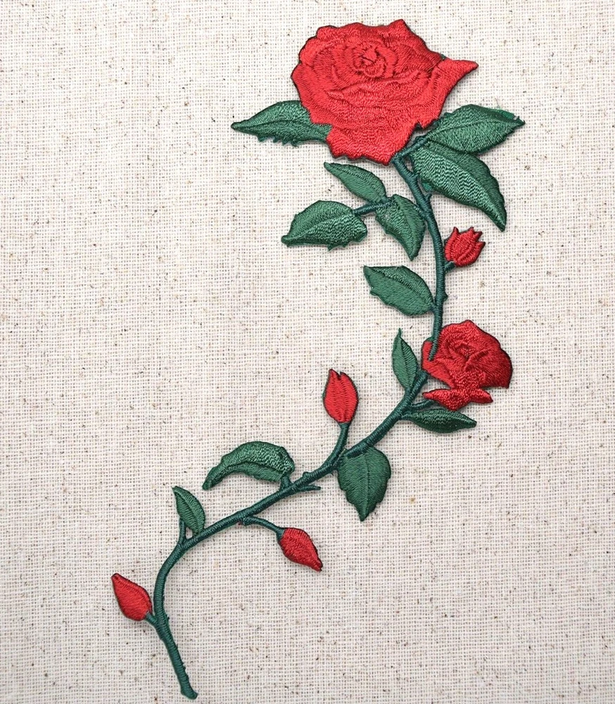 Red Rose Flower Iron on Applique Size is approx. 3-5/8" x 5-1/2" (9.21cm x 13.97cm) High quality, detailed embroidery applique. Can be sewn or ironed on. Great for hats, bags, clothing, and more!