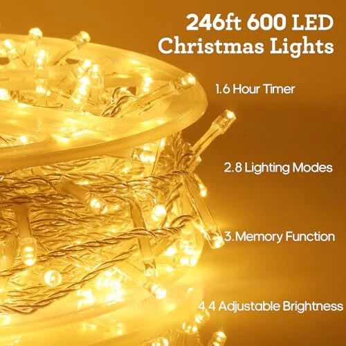 Menu 1. We require immediate payment. 2. We currently accept payment via eBay managed payments only. 3. Once payment is cleared, we will dispatch your shipment within 1-3 business days. Please refer to the "Shipping" tab for more information regarding shipping speed to your destination. 600 LED Christmas Lights, 246FT Outdoor Waterproof String Lights with Remote, Timer & Memory Function & 8 Modes, Twinkle Lights Plug in for Christmas Tree, Patio, Outside, Indoor, Bedroom Product description 【Upgraded Super Long & Bright Christmas Lights】 Christmas string lights have 600 warm white LEDs, 0.4ft per distance, total length 246ft (contain 10ft traction line), which is enough to encircle and decorate your living room or a 7.5FT Christmas tree. The upgraded super bright LED bulbs emit 360°light, which is soft and non-glare, adding a romantic atmosp for Christmas and other holiday decorations. 【Attentive Storage Wheel Design】Our Christmas string lights added storage wheel design, which can effectively prevent Christmas tree lights from getting tangled when unfolding a few feet, and very easy to organize, you can easily use them again next Christmas or party! 【8 Lighting Modes and 4 Adjustable Brightness】 Christmas tree lights have 8 different lighting modes: Waves, Combination, Fading, Fireflies, Chg, Twinkle, Fading slowly, and Steady-on. Simply control the different lighting modes by remote control to create different joyful atmosp for Christmas, birthday parties, family dinners or weddings, indoor and outdoor use! T is also a 6-hour timer function, memory function. 【Safety & IP65 Waterproof】Our Christmas lights have passed the authoritative UL588 safety certification and IP65 waterproof certification. Each LED bulb is filled with a hot melt adhesive layer, anti-freezing and IP65 waterproof can ensure a longer service life, no need to worry even in heavy rain or snow outdoors (Note: the plug is not waterproof). The output voltage is 30V, which is within the range of human body's safe voltage, no danger of electrocution. 【Packing List】Christmas lights includes 1x 600 warm white led string light, 1x storage wheel, 1x plug, 1x remote Control, instruction manual and 12 months after-sales service. Christmas lights are widely used in patios, walls, roofs, gardens, lawns, porches, restaurants, classrooms, commercial buildings, shopping centers etc. If you have any problems with our Christmas string lights, please feel free to contact us, we are always for 24 hours. PLEASE MESSAGE US IF YOU HAVE ANY OTHER QUESTIONS, AND MANY THANKS FOR READING ALL OF THIS. Copyright ©#. All Rights Reserved.