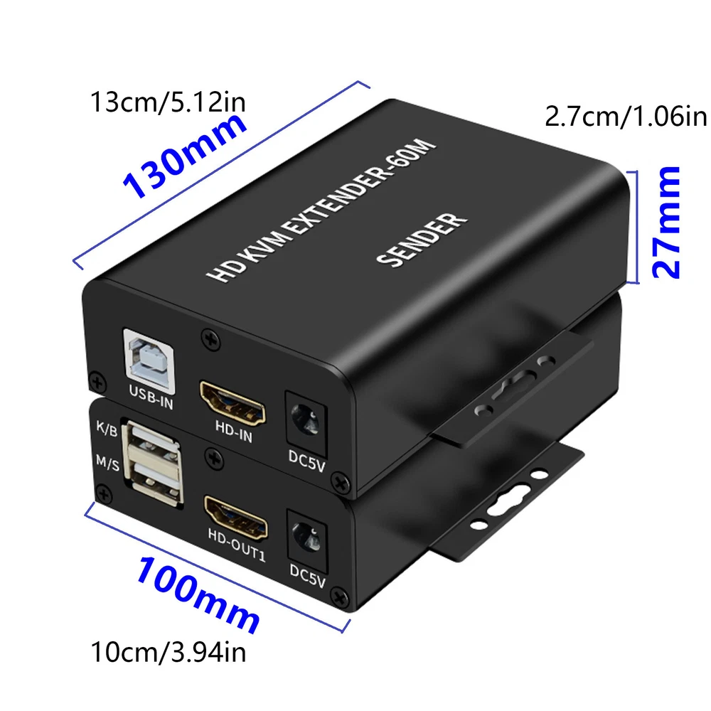 SAFE & SECURE SHOPPING 100% SATISFACTION GUARANTEED FAST SHIPPING Store Categories Store Categories You may also like 60M Video Extension Adapter HDMI KVM USB-A Keyboard RJ45 Lan Ethernet Extender C Product Description 1080P 60m USB HDMI KVM Extender with Dual HDMI Out Over Rj45 Ethernet Cable Video Converter Support HDMI Loop Laptop PC Keyboard Mouse Specifications: Maximum single link range: 1920*1080, 1080p Support output video: HDMI Support synchronous transmission of audio and video Mouse/Keyboard Interface: USB DTV/HDTV: 1080p/1080i/720p/576p/480p/576i/480i Transmission distance: Up to 60m(using CAT6 cable) Operating temperature: 0 ~ +70℃ Operating humidity: 10% ~ 85%RH(no condensation) Storage temperature: -10℃ ~ +80℃ Storage humidity: 5% ~ 95%RH(no condensation) External power supply: DC5V 1A Support POE function: Single ended power supply Color: Black Size: 130x100x27mm Features: This Extender has many features that enable it to perform in superior manner: 1. One pair as a full functional module, no need of setting. 2. CAT-5e/6 cable can substitute HDMI cable to achieve long distance transmission. 3. CAT-5e/6 follow the standard of IEEE-568B 4. Transmission distance can be up to 60 meters for 1080p while using CAT6 cable. 5. Support USB Keyboard/mouse extension,more convenient 6. One HDMI output in the sender side. 7. Two channel HDMI output from the receiver,so,in total 3 monitor can be displayed at the same time 8. HDCP1.2 1.2 compatible 9. Plug and play,easy to use Package Content: 1x Sender 1x Receiver 2x Selecteable Power Adapter 1x USB A-B cable 1x User Guide Shipping Returns Contact Us Payment Shipping We ship most of our orders within 24 hours, and may up to 48 hours. If you want faster shipping way, please contact us before making a payment. Sometimes due to problems with our transportation company system, your shipping information may be delayed to update. We recommend that you try again after 3-4 days. If you still haven't checked the shipping information, you can contact us via ebay message. Returns 1. 30 days warranty from the purchased date. Please contact us via email before returning the defective item. 2.Our warranty does not extended to any product that are physically damaged or that are not under normal operating conditions as result of misuse or improper installation on the buyer/user's part. 3.Return items should include the original packaging and all accessories. buyers MUST contact us for the returning address. 4.In all cases, buyers pay shipping fees at their own cost to return products for exchange or refund. We will be responsible for the postage of replacements. Refund will be made upon receipt of the returned item. Contact Us Pls contact us if you have any problems,we will try our best to solve for you Payment We accept all verified payment from eBay. Copyright © 2022 Tongtool