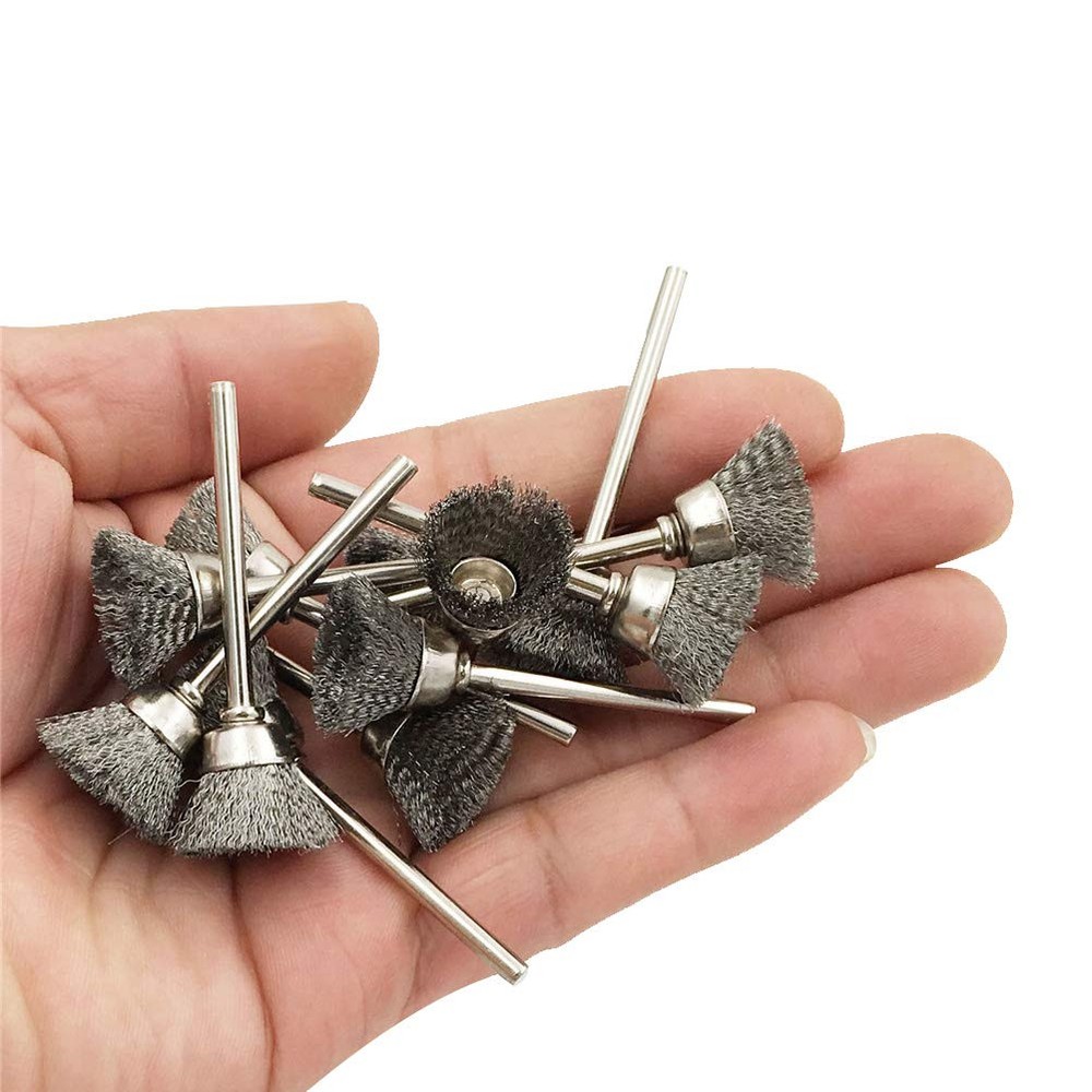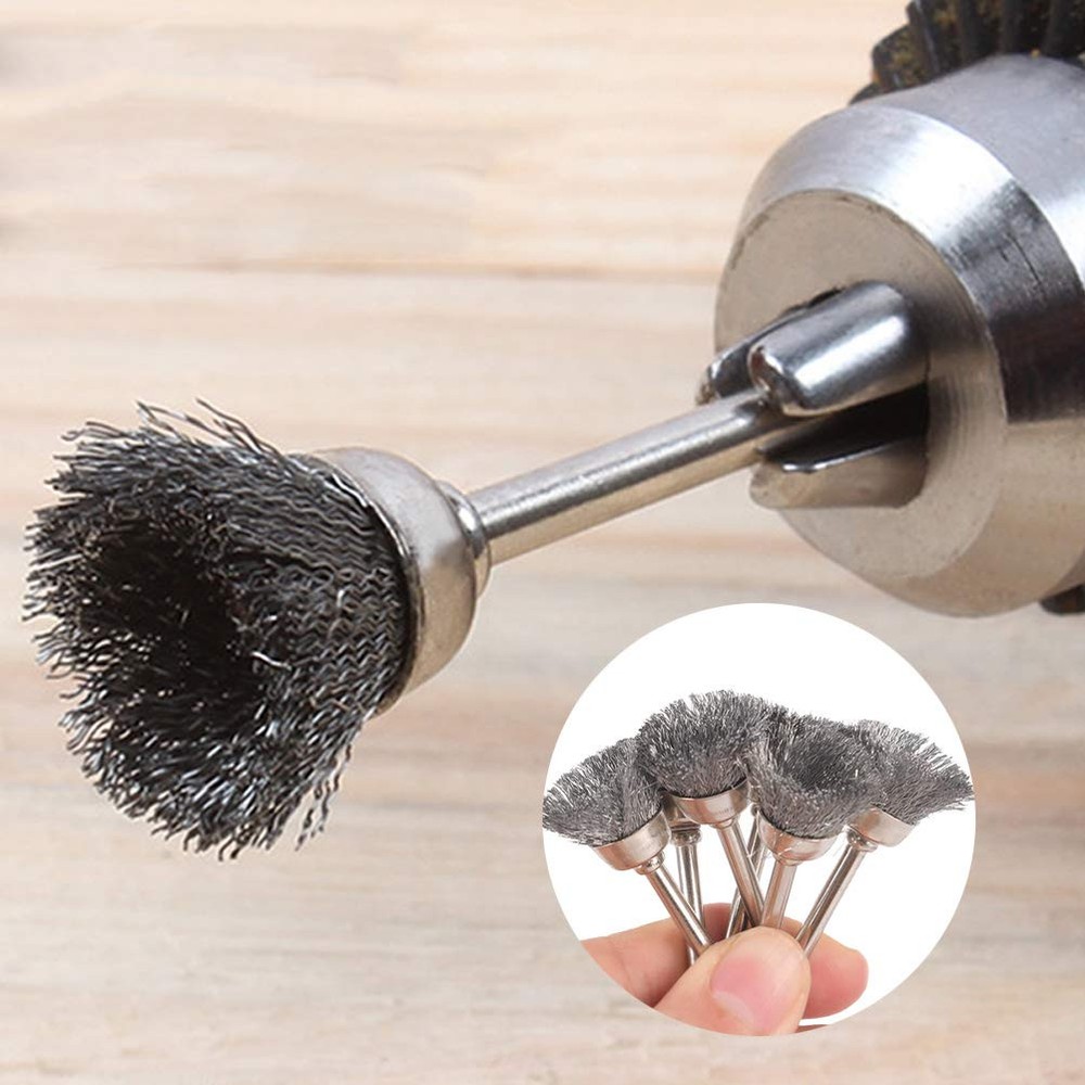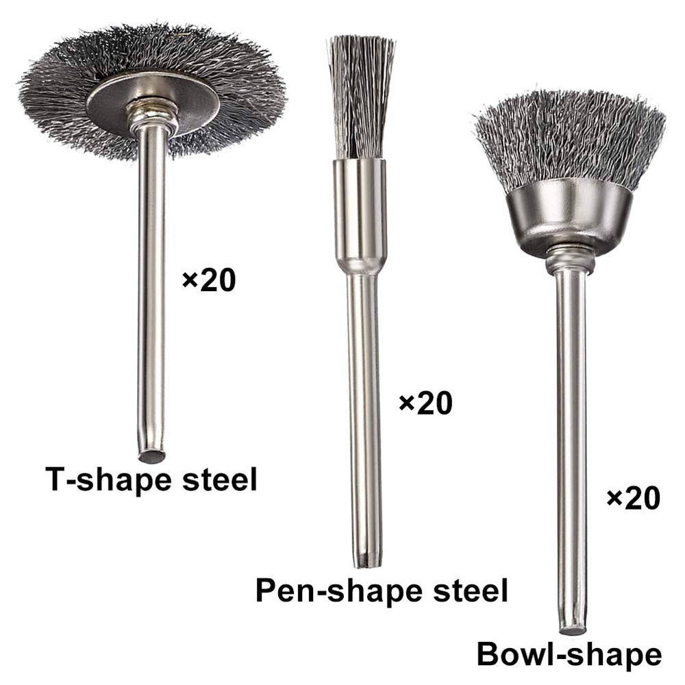 Warm Tips: We recommend working with safety glasses and other protective equipment. Material: Stainless steel Color: Silver Diameter of shank: 0.12'' / 3 mm Diameter of brush: 0.2''/ 5 mm, 0.59'' / 15 mm ,0.98'' / 25 mm Length: About 1.57'' / 40mm Package Included: 20 X 5mm pen-shape wire brush set 20 X 15mm bowl-shape wire brush set 20 X 25mm T-shape wire brush set 1 X plastic case Sturdy material:Made of stainless steel, durable for a long service life, steel wire brush set can use for many different types of wood, metal materials,polishing,castings,structural steel,sheet metal and grinding all kinds of rough surface. Suitable for Various Surface:Designed for easy access into narrow holes and confined areas. crimped style for light to medium duty applications, removes rust, scale and paint in hard to reach areas.hardened wire cleaning brush for reducing wire breakage. Applications: These wire wheel for drill can remove brass, copper, gold burrs, rust, dust, removing the oxide layer, scale and paint in hard to reach areas,so great for cleaning your car, garage, office kitchen and ect. Use for many types of drill: Wire brush for drill is ideal for Dremel and Foredom tool, angle grinder, electric drill, door knobs, automobile parts and die grinders ect. Package Included: 20 Pcs bowl-shape wire brush set, 20 Pcs pen-shape wire brush set, 20 Pcs T-shape wire brush set. Also comes with a durable plastic case for easy storage of these mini Wire Brush Wheels.