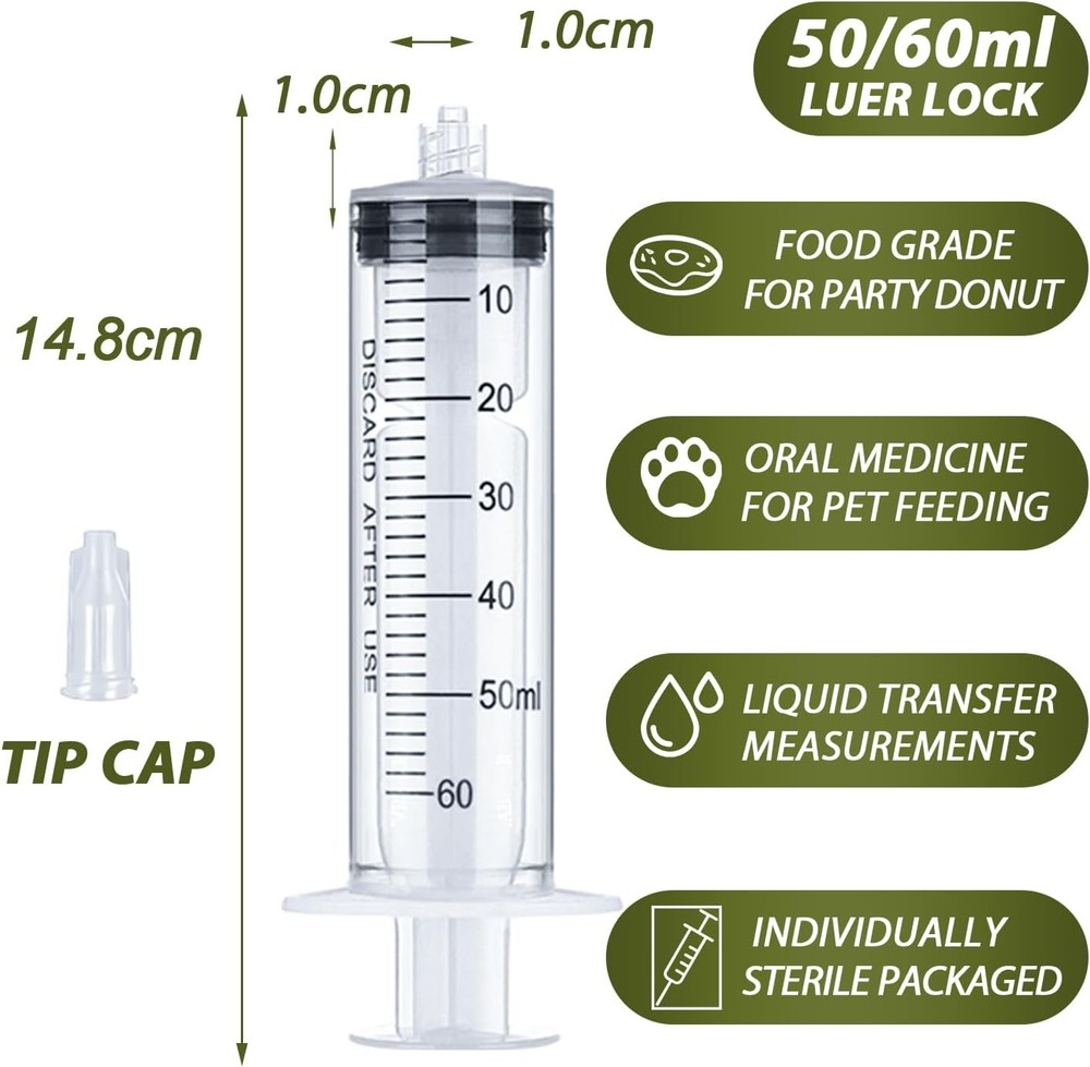 60mL Luer Lock Syringe 4 Pack Large Plastic Sterile Syringes without Needle, for Liquid, Oral, Measurement, Dispensing, with Cap 50mL/60cc Product Details Package Dimensions : 6.26 x 6.14 x 1.34 inches; 4.16 ounces Manufacturer : HiMo Brand: HiMo Material: Plastic Item Volume: 60 Milliliters Sterility Rating: Sterile Unit Count: 4.0 Count 4 Pack 60mL Luer Lock Syringes with standard luer lock tip for all needle.( No needles are included) enough for use or replacement. Each large syringe is made with the same high quality, non-toxic, and pyrogen free material. Each luer lock syringe is individually steriled sealed, clean, safe and sterile, and can be applied for hobby crafts, home, experimental or industrial use Each Syringe with cap can be easy to use and storage liquid. Warm note: the syringes are for industrial use only. 60mL Luer Lock Syringe 4 Pack Large Plastic Syringes without Needle, for Liquid, Oral, Measurement, Dispensing, with Cap