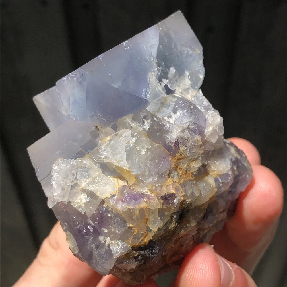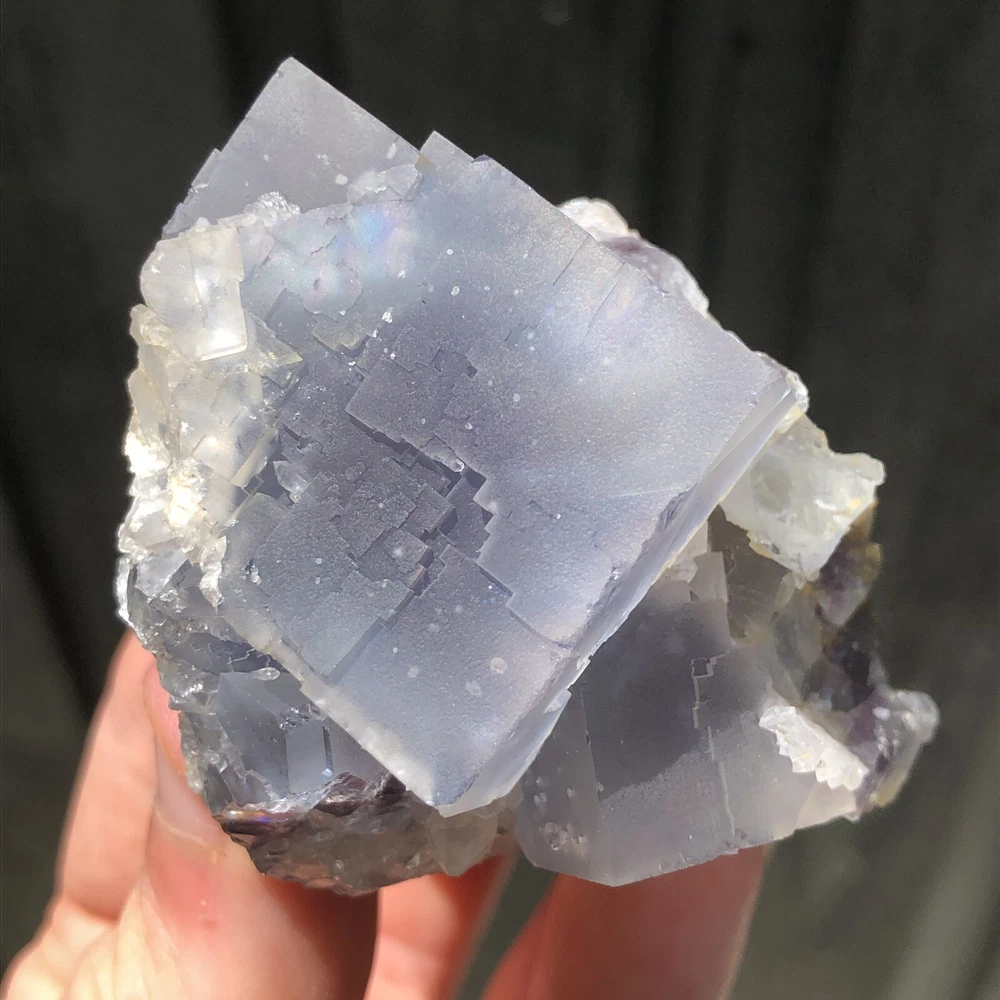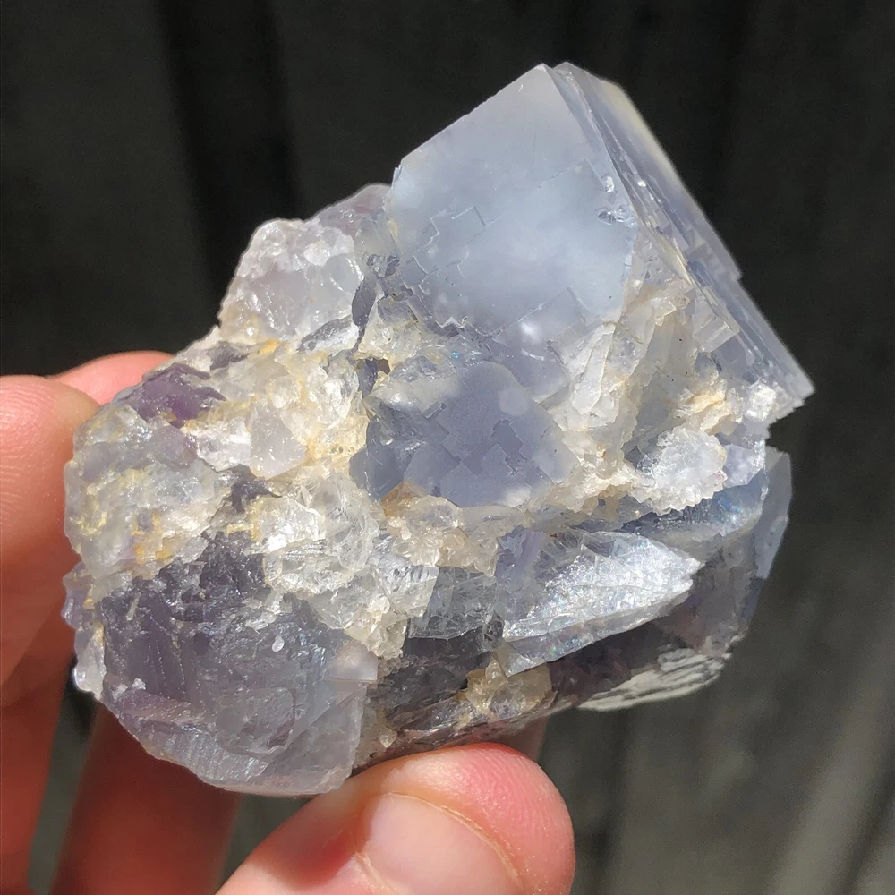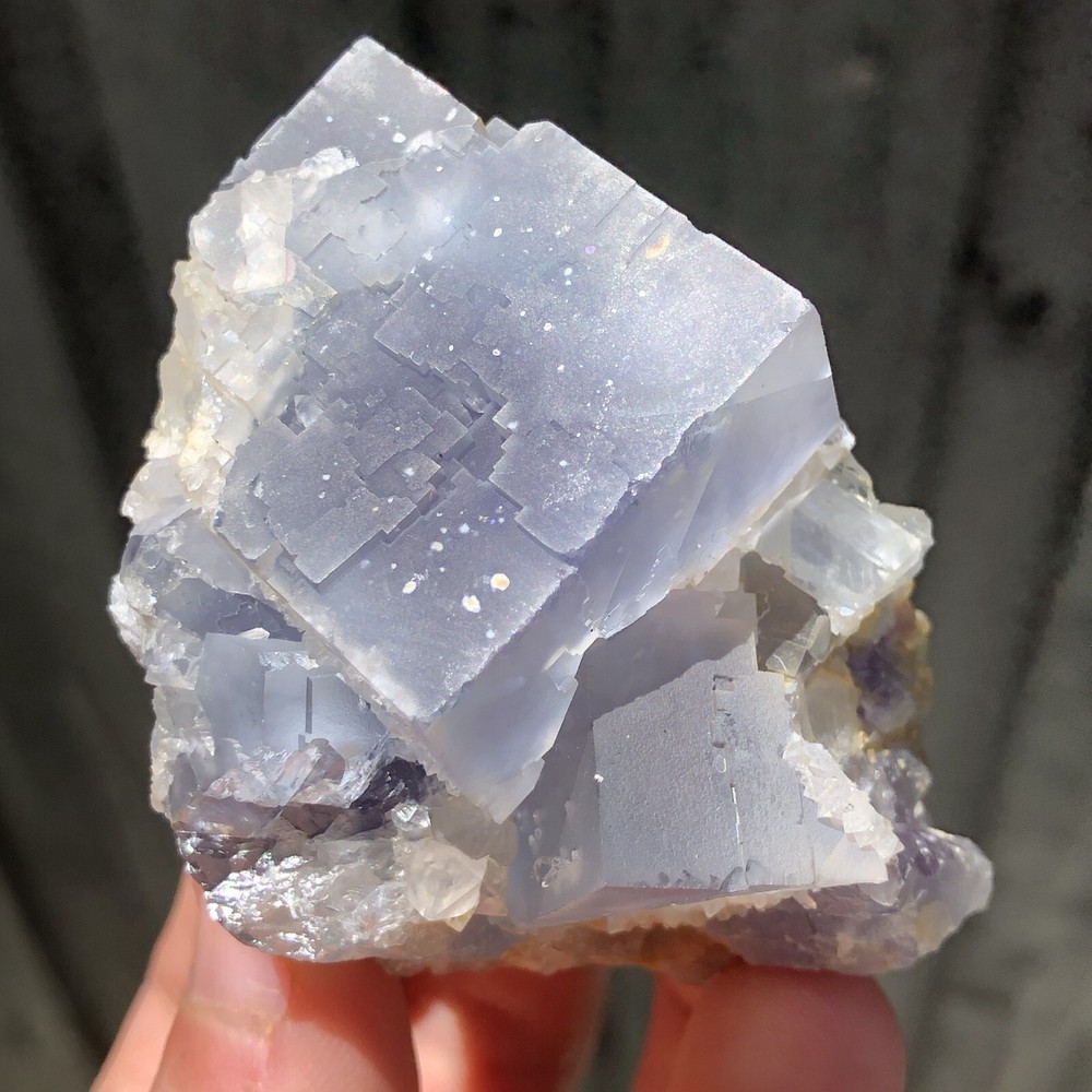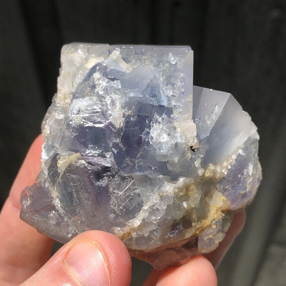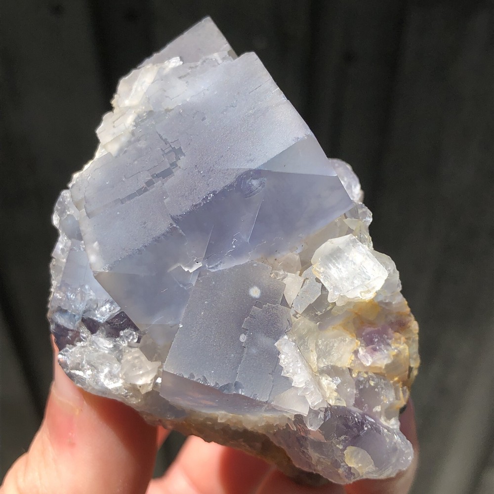 Mineral: Fluorite with Quartz Locality: Mont-Roc Mine, Mont-Roc, Castres, Tarn, Occitanie, France Measurements: 6.1cm x 6.0cm x 4.6cm Weight: 237g A cluster of pale, denim-blue fluorite cubes from the Montroc Mine in France. Please note this specimen is NOT from the more common French specimen-producing localities such as La Barre or Le Beix. Pieces from this locality come to market at a much lower rate than the previously mentioned French fluorite-producing localities. In fact, there are only 19 photos of fluorites from this locality listed on Mindat. The crystals are relatively large and uniquely denim-blue with slightly purple cores. There is a second generation of small white quartz crystals for accent. I acquired this specimen directly from a French collector. ID: 428