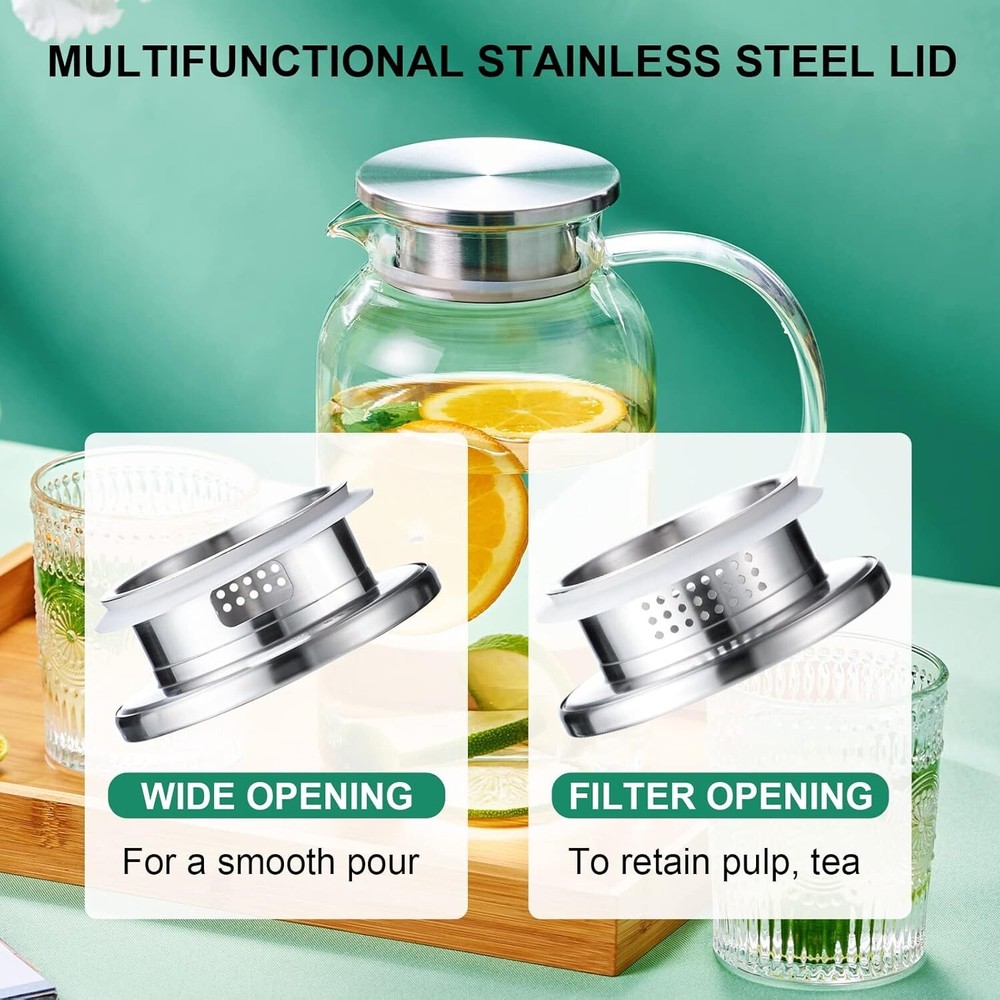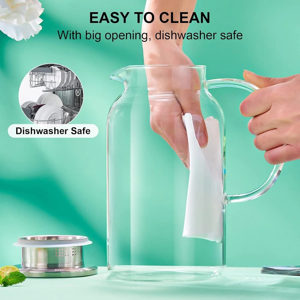 About this item 【High Borosilicate Glass】This glass pitcher is made of thickened lead-free high borosilicate material, which is heat and cold resistant and can withstand temperatures from -40 degrees Fahrenheit to 320 degrees Fahrenheit. The glass water pitcher can be directly heated with an open flame or an induction cooker, or directly placed in the refrigerator for refrigeration. 【Two Different Pour Functions】This glass pitcher has two ports, the small hole for straining the tea leaves to keep the pulp iced, and the large hole for pouring out the pulp. The lid of this glass water pitcher is made of 18/8 stainless steel, which is durable and rust-resistant. The lid features a food-grade silicone ring for a tight seal, preventing leaks or accidental spills when the jug is tilted. 【Enjoy Your Drink】The capacity of this glass pitcher is 61oz/ 1.8L, which is very suitable for parties or daily use. It can be used for hot and cold juices, lemonade, coffee, iced tea, milk, wine, cocktails and other beverages. 【Wide Mouth Opening for Easy Cleaning】The wide opening of this glass water pitcher allows your hands to easily reach the bottom, making it easy to clean the inside of the pitcher. Dishwasher safe. Its smooth surface is less prone to stains than other materials, so you just need to rinse with water to keep it looking like new. 【Wonderful Gift Ideal】The glass water pitcher comes with beautiful gift boxes which is a perfect gift for family and friends! (such as Mother's Day, Father's Day, Thanksgiving, Christmas, Thanksgiving). If you have received a defective product or are not satisfied with our glass pitcher, please feel free to contact us. Wide Opening This glass pitcher is designed with a wide opening for pouring out pulp, water. Filter Opening This glass water pitcher is designed with a fine mesh filter, which can be used to filter tea, fruit pulp and ice cubes. Thick Glass And Handle The body and handle of this glass jug have been upgraded and thickened for durability.