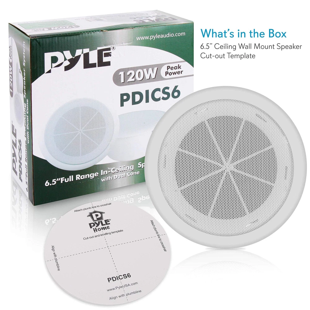 6.5” Ceiling Wall Mount Speaker - Full Range Woofer Speaker System 1.5'' Tweeter Cup Flush Design w/ 60Hz-16kHz Frequency Response 120 Watts Peak & Template for Easy Installation - Pyle PDICS6 White 6.5” SPEAKER SYSTEM: Pyle ceiling wall mount speaker is a full range woofer speaker. This unit measures 6.5” round, equipped with a 1 inch high temperature voice coil and 1.5” tweeter cup. Perfect to any room without cluttering floor space 60Hz - 16kHz FREQUENCY RESPONSE: Pyle 6.5” speaker system has a 1.5" tweeter cup and frequency response. This flush mount speaker is pack with exceptional 8 ohm impedance rating and impressive 120 watts power handling capability FLUSH MOUNT DESIGN: A flush mount design midbass stereo sound speaker for simple and easy in-wall / in-ceiling installation. The product features 1'' high temperature voice coil to produce powerful sound or quiet background music 120 WATTS PEAK: Pyle in-wall speaker system reproduce sound clearly with outstanding responsiveness. It has 89 dB that can achieve wide-ranged sound performance speakers secure as well as extending the life of the product EASY INSTALLATION: The product includes cut-out and overall templates for easy installation. The measurement for cut-out dimensions 6 3/4" in diameter x 3 1/2'' in depth while the overall dimensions measures 9'' in diameter x 3 1/2'' in depth
