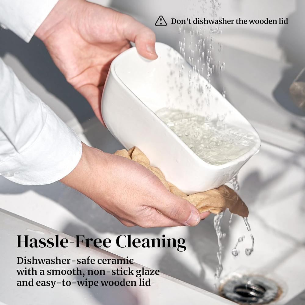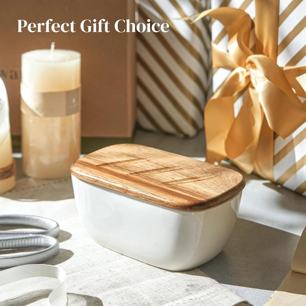 Large Butter Dish Holds Up to 3 Sticks : The inside dimensions of the lid are approximately 6.5" by 4", so it can hold 3 sticks of eastern-style butter stick (4.75" x 1.25") or a standard western-style butter stick (3.5" x 1.5"). Suitable for the whole family to use. Keep Butter Fresh for Longer: The butter dish with lid features a high-quality sealing silicone ring that helps keep butter fresher and longer and won't absorb the flavors of other foods in the refrigerator. Decorate Your Kitchen:The DOWAN butter dish with lid for countertop comes in six stylish colors and the natural acacia wood lid adds a rich texture, making it the perfect addition to any kitchen that will never go out of style. Healthy and Durable Ceramic: Ceramic butter dishes are the safest to use because they don't contain leachable lead or cadmium. DOWAN Butter dish is made with high-quality ceramic that has been fired at high temperatures, ensuring it's safe for dishwasher and long-lasting. Perfect Gift Choice: The DOWAN Butter holder comes carefully packaged in a box and is ready for gift-giving, whether to yourself or someone you love at Father's Day. Plus, it's dishwasher safe, making for easy cleaning. Product Description This beautiful enamel butter dish with wooden lid is perfect for keeping the butter in. The natural solid beech lid keeps the butter covered as well as keeping out air and light which spoils the butter. Stylish enough to keep on the kitchen side ready to spread over a slice of toast. DOWAN Porcelain Butter Dish Perfect for your Countertop Durable and non-stick porcelain: DOWAN insists on adopting good porcelain material, which can greatly prevent the crack, the chip, the fade, etc. Upgraded Silicone Seal: DOWAN constantly upgraded the silicone seal dozen of times, aims to provide the BEST storage room for the butter. Large Capacity & Universal Size: Suitable for most brands’ butter, which is wide and deep enough to hold 8 oz or two 4 oz sticks of butter. Dimensions: 6.5"L x 4"W x 3.1"H Accommodates all short and long butter sticks Lid helps keeps butter fresh and protected Premium porcelain material & BPA free A must-have accessory for butter lovers Why choose the DOWAN Porcelain Butter Dish with Lid? They are safe for freezer, microwave, dishwasher and oven as well (EXCEPT the wooden lid). The wooden Lid is Hand-wash only, Keep it dry after cleaning. Works great With sugar, coffee, salt, spices, seasoning, and cookie jars. The most ideal gift for your family, lover and friends to neaten kitchen counter easily. This dish is as practical as it is attractive, as it keeps your butter fresh while allowing it to soften up for easy spreading. Notes Dishwasher safe only for dish not the lid, the lid only wash by hands. Please do not clean with steel wool as it may cause abrasions over time. Please do not soak the lid in water for a long length of time as this will cause the wood to expand. Premium Material & BPA Free Made of premium AB porcelain, Chemical free so you won’t worry about BPA or harmful substance getting into your body. The butter will not be tainted by other odour, keep fresh and tasted. You have no trouble to handle greasy wrappers and to wipe off spilled butter. Upgraded Silicone Seal Sealed lid allows you to keep butter, margarine, and other shelf-stable condiments on counters and tables instead of inside the refrigerator so it stays soft and easily spreadable at room-temperature Durable and Non-stick Porcelain Durable porcelain and silicone seal can effectively prevent the spoilage of foods. Airtight lid keeps butter fresh in the fridge without mixing other foods’ taste.