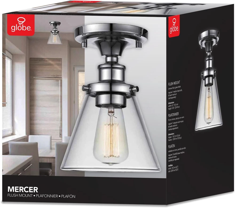 Store New Arrivals Add to Favorite View Feedback Contact 65726 1-Light Flush Mount Ceiling Light, Clear Glass Shade, Chrome Finish, E26 Bulb, Ceiling Light Fixture, Bedroom Lights for Ceiling, Dining Light Fixture, Bulb Not Included Description Item model number 65726 Light Source Type LED Style Retro Number of Items 1 Power Source Corded Electric Fixture Type Non Removable Number of Light Sources 1 Control Method App Embellishment Crystal Theme Vintage Bulb Base E26 Lighting Method Downlight Specification Met cULus Listed Assembled Height 9.25 inches Controller Type Push Button Unit Count 1.0 Count Room Type Kitchen, Living Room Assembly Required No Switch Type Dimmer Product Dimensions 6.5 x 6.5 x 9.25 inches Material Glass Assembled Width 6.5 inches Installation Type Flush Mount Model Name Mercer Finish Type Chrome Finish Specific Uses For Product Indoor Indoor/Outdoor Usage Indoor Brightness 60 lumen Country of Origin China Light Color Warm White Batteries Required? No Warranty Type Limited Item Weight 2 pounds Shade Material Glass Light fixture form Ceiling Special Features Dimmable Special Feature Dimmable Part Number 65726 Shade Color Clear Mounting Type Ceiling Mount Color Chrome Wattage 60 Watts Global Trade Identification Number 00058219657263 Voltage 120 Volts Plug Format A- US style Assembled Length 6.5 inches Finish types Chrome Finish Included Components Instruction Sheet, Light Fixture Size 9.25" FLUSH MOUNT: this vintage flush mount ceiling light sits just off the ceiling making it a beautiful center piece VINTAGE INSPIRED: fashioned after vintage inspired lighting this flush mount is perfect for bringing a vintage but elegant look to any area DIMMABLE: fully dimmable with compatible dimmer switch to create the perfect atmosphere (dimmer switch sold separately) EASY INSTALL: includes all mounting hardware for quick and easy installation BULB REQUIREMENTS: 1x E26/Medium Base 60W Bulb, LED Compatible Fashioned after vintage inspired lighting, Globe Electric’s Mercer 1-Light Flush Mount Ceiling Light adds an authentic vintage feel to any room. Sitting close to the ceiling the clear glass shade and exposed bulb bring your eye upward to easily update your space. Add a Globe Electric vintage inspired Edison bulb to create a look that is truly unique and eye catching. The chrome finish and vintage look socket complements any decor with ease. Fully compatible with dimmable LED bulbs and dimmer switch, this fixture can match any mood or application. Ideal for use in kitchens, restaurants, bars, living rooms, dining rooms and more. Includes all mounting hardware for quick and easy installation and requires one 60W max medium base bulb (sold separately). ABOUT US We offer the best prices around on high quality products. Our E-store includes media such as books, movies, music and games while offering electronics, toys, sporting apparel, clothing, tools, general home, garden items and more. SHIPPING We are always working hard to ensure your package arrives as soon as possible. Please understand that some factors like weather, high postal traffic, and the performance of shipping companies are outside of our control. We offer free shipping to the lower 48 states and ship within 2 business days of payment, usually sooner. We do not accept P.O. Boxes. Please provide a physical address. For shipping outside of the continental USA, we only use eBay's Global Shipping Program.The item is shipped to KY and then sent to the rest of the world. International customers are responsible for all duties and taxes. Continue to check out in order to calculate costs for shipping the item to your country. Messages regarding eBay's Global Shipping Program MUST be directed at eBay EXCLUSIVELY. RETURNS We offer a 30-Day Return Policy on items which you are not completely satisfied with. You have the option for a full-refund or an exchange of the item. No returns are available on items shipped outside of the USA. PAYMENT We accept PayPal. CONTACT US This page content is yet to come Please ad us to your favorite seller and visit again later Thank You CUSTOMER SATISFACTION We try our very best to make sure every customer is completely satisfied. If there's a problem, message us! We're happy to help. WE ACCEPT Copyright © 2021 AutoDS. | All Rights Reserved