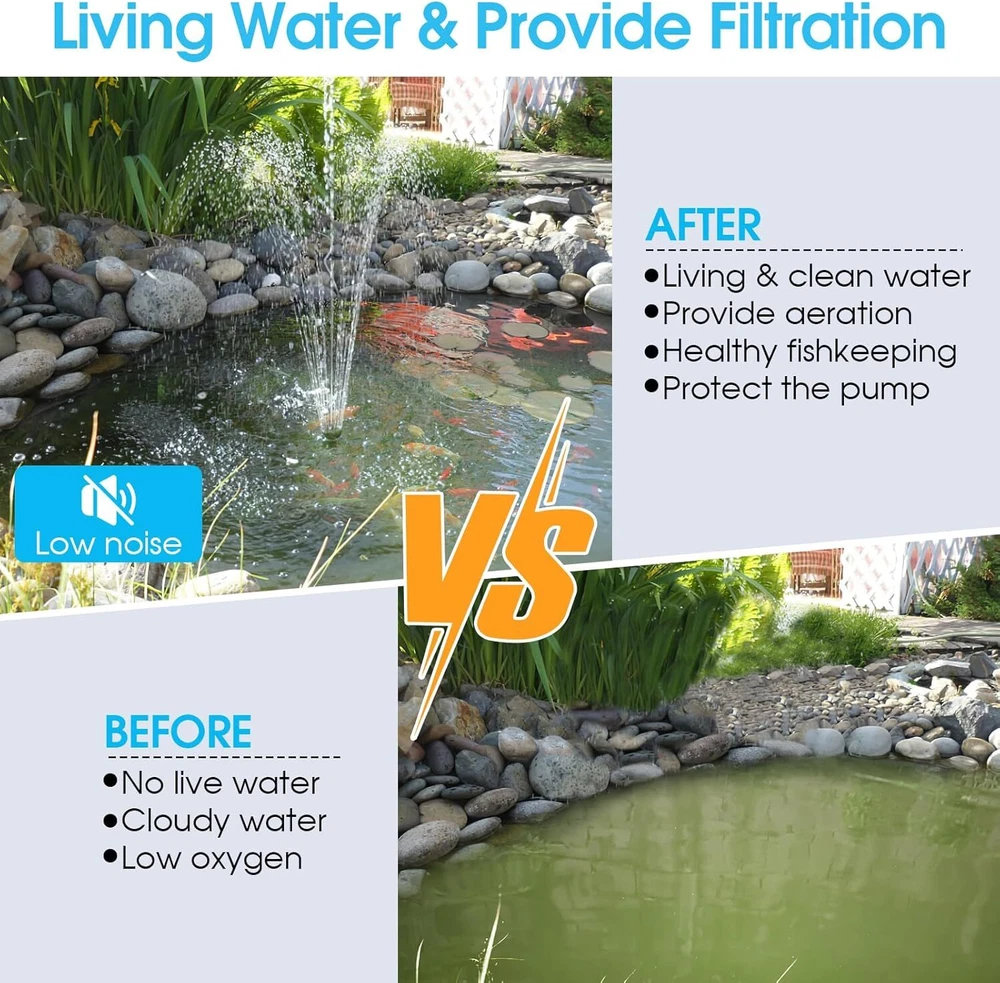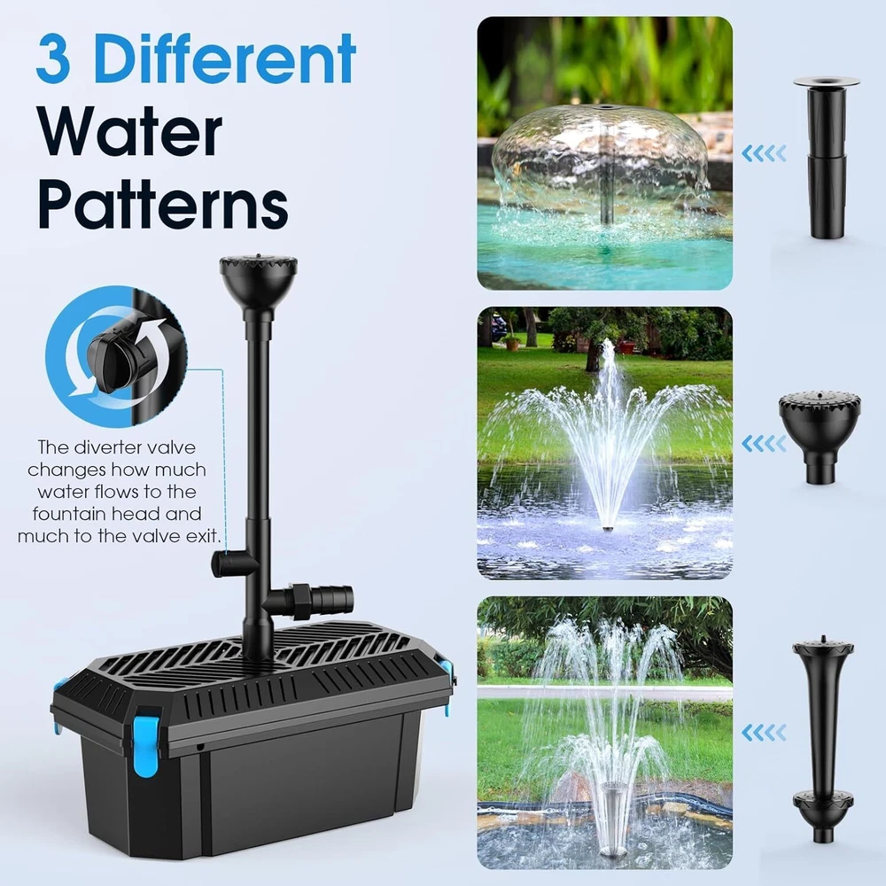 đăIntegrated Filtration SystemăThe multi-functional compact pond filter combines everything required to run a healthy small pond. It is designed to help keep water healthy balanced and crystal clear, and protect the pump from being clogged with debris, also protects fish from the pump's impeller. â˛ăBuilt-in Pond Pump & Fountain KităOur filter box includes 660 GPH energy efficient & low noise water pump which suitable for ponds of 1180 gallons. Also includes a fountain kit with 3 waterspray nozzles that creates a beautiful display, while adding oxygen to pond water. đăRuns Two Water FeaturesăYou can choice of fountain or waterfall, the filter kit includes with 3 additional inlets to attach hose for a second water feature. And a diverter valve which allows simultaneous running of the fountain and a secondary outlet. Both are fully adjustable thanks to the built in flow control vales. â˛ăEasy Access & MaintenanceăThis filter kit designed as a single smart unit allows for a much easier installation compared to a standard pond set up. Filter maintenance is straightforward thanks to the easy access clips which allow quick removal of the lid for easy cleaning. đăPremium Filter MaterialsăThe filter sponges and filter-balls will make a double filter area per unit volume, which help improve water clarity in water gardens and reduce maintenance. Maintaining excellent water quality for healthy fishkeeping. âăPackaging & GuaranteeăThis pond filters for outdoor ponds includes: 1* Filter box, 1* 660 GPH pond pump, 1* Fountain kit with nozzles & diverter valve, 2* Filter Pads, 20* Filter-Balls, 3* Outlet and 1* Manual. 1-Year Warranty and 100% Satisfaction Guarantee. Product Description POPOSOAP Multi-Functional Small Garden Pond Filter Box The video showcases the product in use. The video guides you through product setup. The video compares multiple products. The video shows the product being unpacked. The pond pump and filter kit is a fully integrated unit that is perfect for ponds up to 1,180 gallon and provides beautiful, clear and healthy water and an attractive and reliable fountain and waterfall display, it also keeps the pump intake from being clogged with debris. Completely Versatile Pond Filters for Outdoor Ponds The pond filters for outdoor ponds is widely used in water design scenarios, such as garden fountains, courtyard waterfall landscaping, pond circulation purification, fish pond oxygenation, etc. 3 Usage Methods Pond Filter Interchangeable fountain heads enable 3 different attractive water displays. Can supply a stream or waterfall by connecting a hose pipe to the outlet. With the included diverter, you can choose to run a fountain display, waterfall or both at the same time. 3 Different Fountain Nozzles and Adjustable Flow Rate Includes three attractive fountain attachments enabling different water displays. The fountain attachment is height-adjustable and can be adapted to different usage scenario.