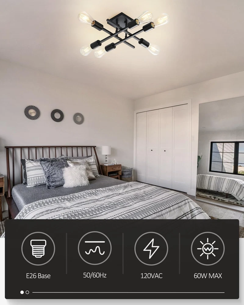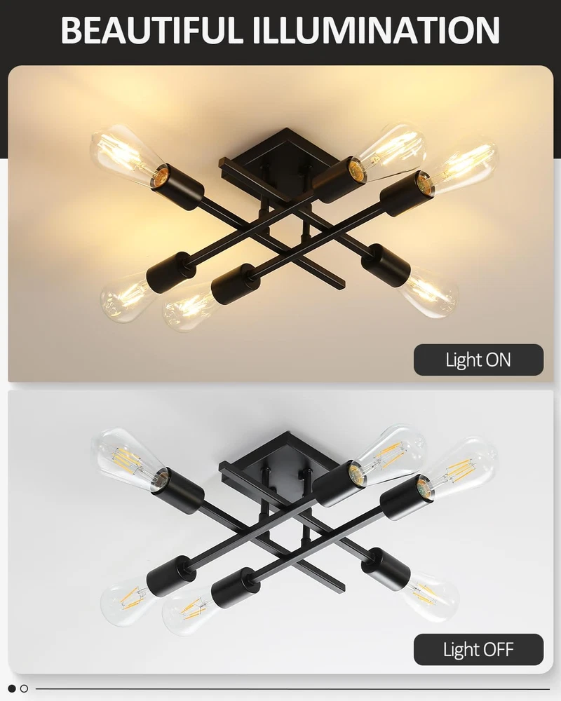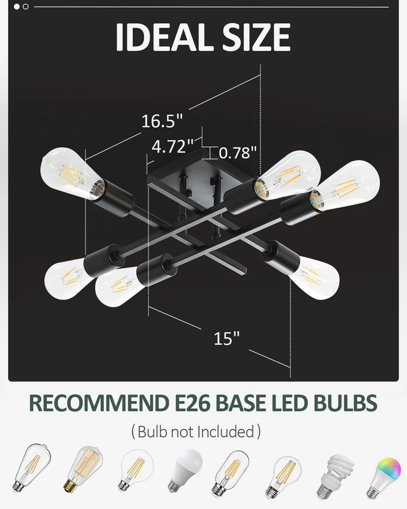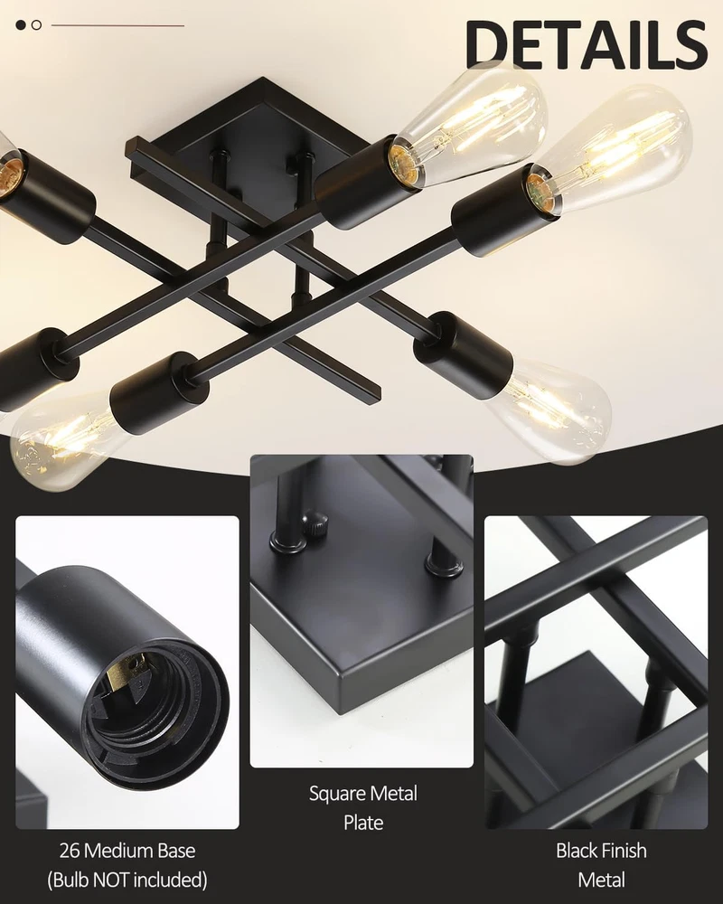 Store New Arrivals Add to Favorite View Feedback Contact 6-Light Semi Flush Mount Ceiling Light Fixture, Modern Black Sputnik Chandelier Lighting, Farmhouse E26 Stock Ceiling Lamp Kitchen Bedroom Living Room Entryway, Bulbs Not Included Description Item model number EICL002-BL1P Light Source Type LED Style Farmhouse Number of Items 1 Power Source Corded Electric Number of Light Sources 6 Control Method App Warranty Type 1 year limited warranty Lighting Method Adjustable Finish Types Painted Country of Origin China Controller Type Push Button Unit Count 1.0 Count Room Type Bedroom, Dining Room, Living Room, Study Room, Bathroom, Laundry Room, Entrances, Hallway, Entryway Switch Type Push Button Product Dimensions 1 x 1 x 1 inches; 2.84 Pounds Material Metal Model Number EICL002-BL1P Installation Type Semi Flush Mount Additional Features E26 Medium Base, 120VAC, Maximum Wattage-60W/Light, Bulbs Not Included Specific Uses For Product Cabinet Fixture Type Non Removable Material Type Metal Light Color Black Item Weight 1.29 Kilograms Light Fixture Form Close to Ceiling Light fixture form Close to Ceiling Bulb Base E26 Item Dimensions L x W x H 1"L x 1"W x 1"H Shade Color Black Mounting Type Ceiling Mount Color Black Indoor Outdoor Usage Indoor Voltage 120 Volts Shade Material Metal Included Components Mounting Hardware Style Name Farmhouse Size 1 Count (Pack of 1) Farmhouse Ceiling Mount Light Fixture: Designed with a classic black finish metal, this black close-to-ceiling lighting with an elegant and modern looking. Perfect for your home lighting and decoration Recommended Bulbs: Our semi-flush mount lamp with standard USA sockets, this sputnik ceiling lighting fixture requires 6 x E26 base bulbs (Max 60W). Compatible with LED bulbs, Incandescent or CFL bulbs. Easy to install, just screw the E26 bulbs you desired into the ceiling mount. If dimming is required, please use dimmable bulbs and compatible dimmer switches Wide Application: This light fixture ceiling mount combines modern and industrial styles. Perfect for bedroom, dining room, living room, study room, bathroom, laundry room, entrances, hallway, entryway, stairwells, balcony, porch, etc, also ideal for commercial areas: bars, cafes, offices, hotels and restaurants High-quality Metal: Crafted from high-quality metal, which makes this industrial chandelier pendant lighting is anti-rust, anti-corrosion and anti-faded. The retro stylish of the ceiling lamp is suitable for the middle ages, modern, farmhouse, country different decoration styles Easy Installation: This modern indoor flush mount ceiling lamp comes with all hardware. Just take a few minutes you can finish the installation Product Description Modern 6-Light Semi Flush Mount Ceiling Light Fixture- Suited for Any Decoration Style! Farmhouse Black Sputnik Chandelier Lighting Industrial E26 Stock Close-to-ceiling Lamp ABOUT US We offer the best prices around on high quality products. Our E-store includes media such as books, movies, music and games while offering electronics, toys, sporting apparel, clothing, tools, general home, garden items and more. SHIPPING We are always working hard to ensure your package arrives as soon as possible. Please understand that some factors like weather, high postal traffic, and the performance of shipping companies are outside of our control. We offer free shipping to the lower 48 states and ship within 2 business days of payment, usually sooner. We do not accept P.O. Boxes. Please provide a physical address. For shipping outside of the continental USA, we only use eBay's Global Shipping Program.The item is shipped to KY and then sent to the rest of the world. International customers are responsible for all duties and taxes. Continue to check out in order to calculate costs for shipping the item to your country. Messages regarding eBay's Global Shipping Program MUST be directed at eBay EXCLUSIVELY. RETURNS We offer a 30-Day Return Policy on items which you are not completely satisfied with. You have the option for a full-refund or an exchange of the item. No returns are available on items shipped outside of the USA. PAYMENT We accept PayPal. CONTACT US This page content is yet to come Please ad us to your favorite seller and visit again later Thank You CUSTOMER SATISFACTION We try our very best to make sure every customer is completely satisfied. If there's a problem, message us! We're happy to help. WE ACCEPT Copyright © 2021 AutoDS. | All Rights Reserved