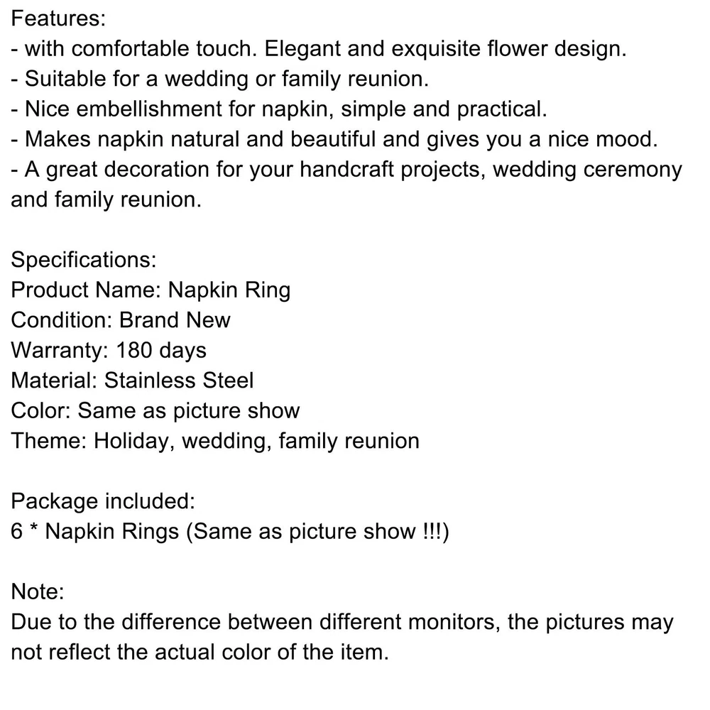 You may also like 12PCS Napkin Rings Leaf Napkin Holder Adornmen Alloy Golden 20.85 USD Free shipping 6PCS Napkin Rings Leaf Napkin Holder Adornmen Alloy Golden 13.85 USD Free shipping 6PCS Silver Napkin Rings Leaf Napkin Holder Adornmen Alloy 14.85 USD Free shipping Features: - with comfortable touch. Elegant and exquisite flower design. - Suitable for a wedding or family reunion. - Nice embellishment for napkin, simple and practical. - Makes napkin natural and beautiful and gives you a nice mood. - A great decoration for your handcraft projects, wedding ceremony and family reunion. Specifications: Product Name: Napkin Ring Condition: Brand New Warranty: 180 days Material: Stainless Steel Color: Same as picture show Theme: Holiday, wedding, family reunion Package included: 6 * Napkin Rings (Same as picture show !!!) Note: Due to the difference between different monitors, the pictures may not reflect the actual color of the item. -About US Founded in 2012, VIPJQ have professional development and sales, and are involved in various products, providing customers with various high-quality products. Since its establishment, VIPJQ has always adhered to the service concept of "customer first" and the management concept of "pursuit of quality", and is committed to providing customers with high-quality original designs. We commit to provide you the best innovative, quality products & professional services with competitive prices. We value every customer, and we look forward to providing solutions for your business needs to help your business achieve its goals, please contact us immediately! We are all about you! We are a Japanese seller,but with large warehouse in USA. We are profesional on Auto Parts,Car Parts,Motorcycle Parts,3C,other hot sale items and so on. We aim to provide to customers high quality product and best service. -About Shipment&Returns The item usually will be dispatched within 3 days after you ordered.All are free shipping. And it usually takes 3-10 working days to delivery depends on buyers' address or other majeure on the way. If you are not satisfied with the items and want to return the item,we hope you could message us first,we will give you the return details, we think we could give you the best service to save your time and money.Thank you. -About Feedback&Customer Service If you are enjoy your shopping here,not only enjoy the items but also the service,we are appreciate you could give us a 5-star feedback. If you are not satisfied with the item,before you give us the negative feedback,we hope we could give you the best solution through our commutication. We think we could do it if you give us the chance.Thank you.