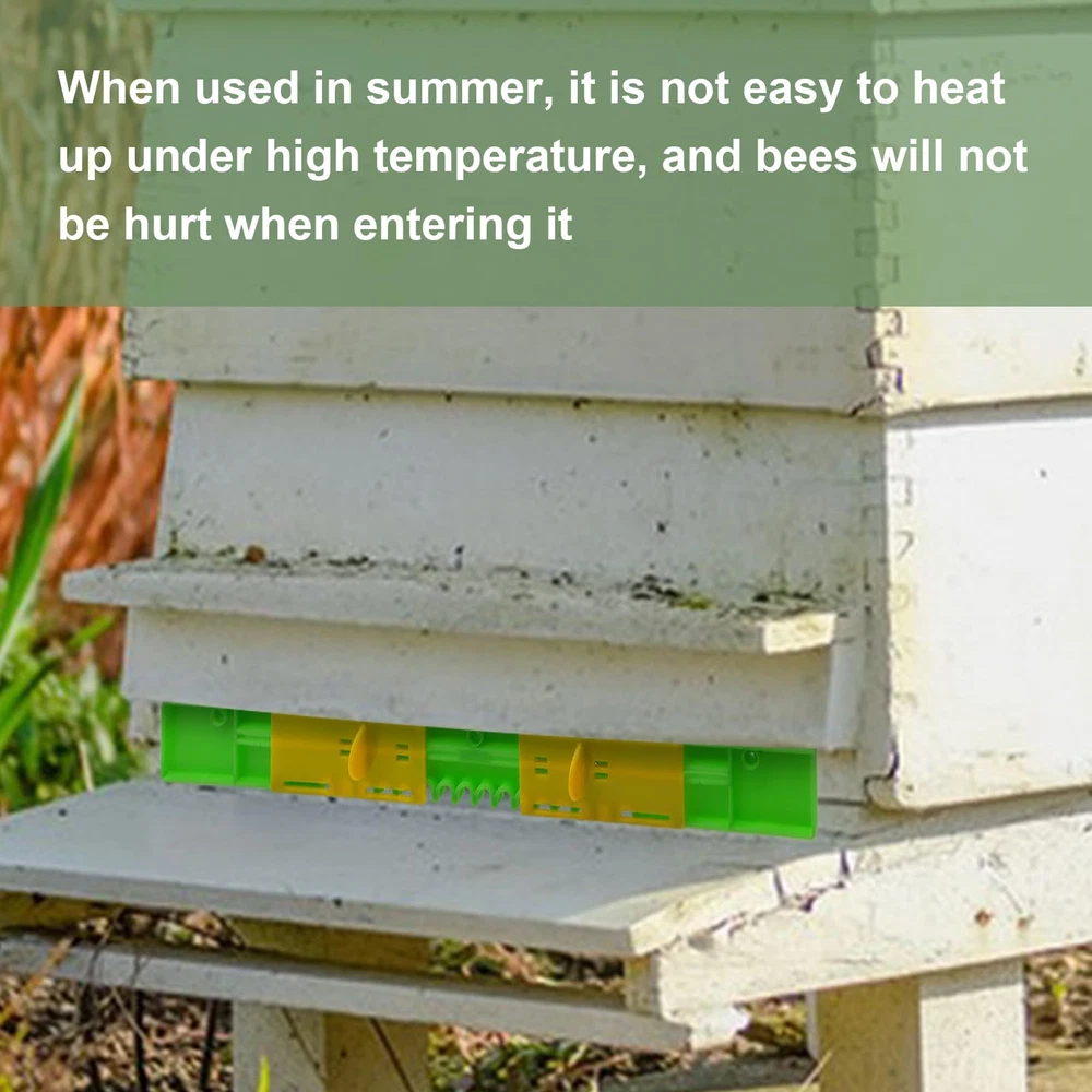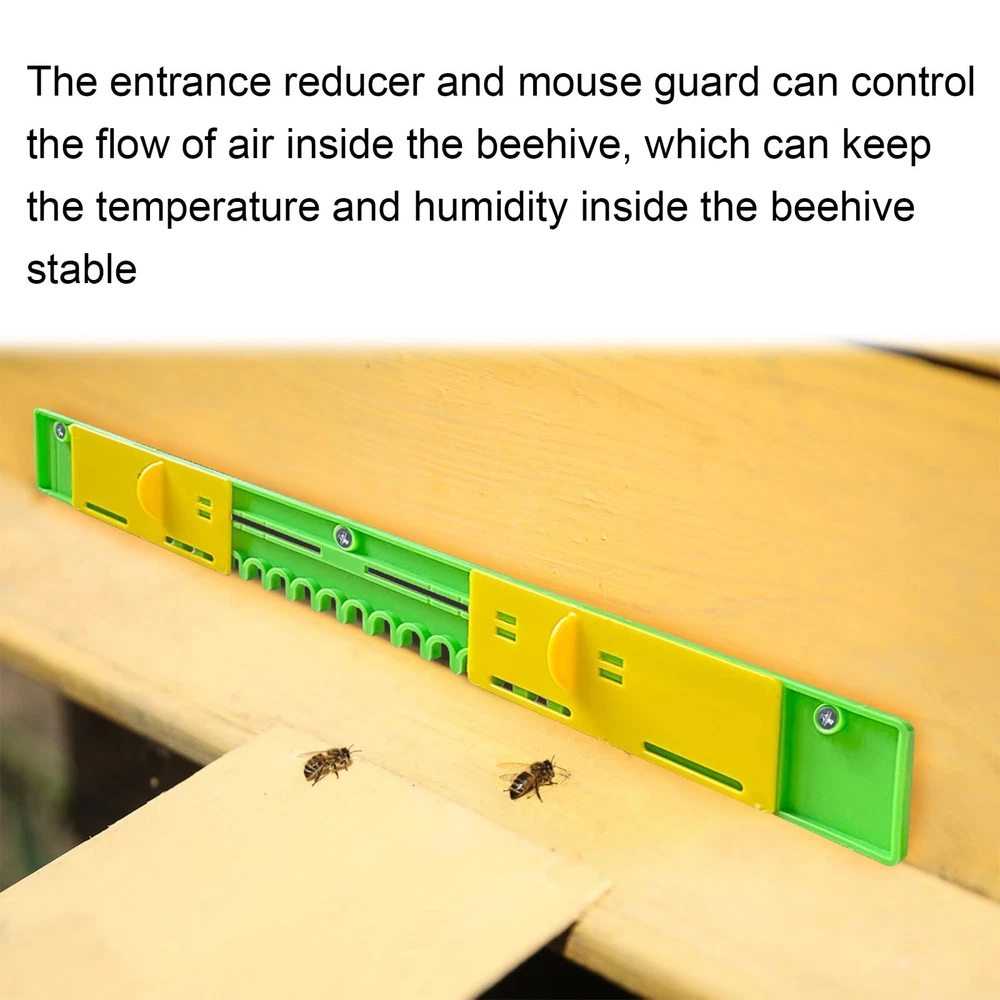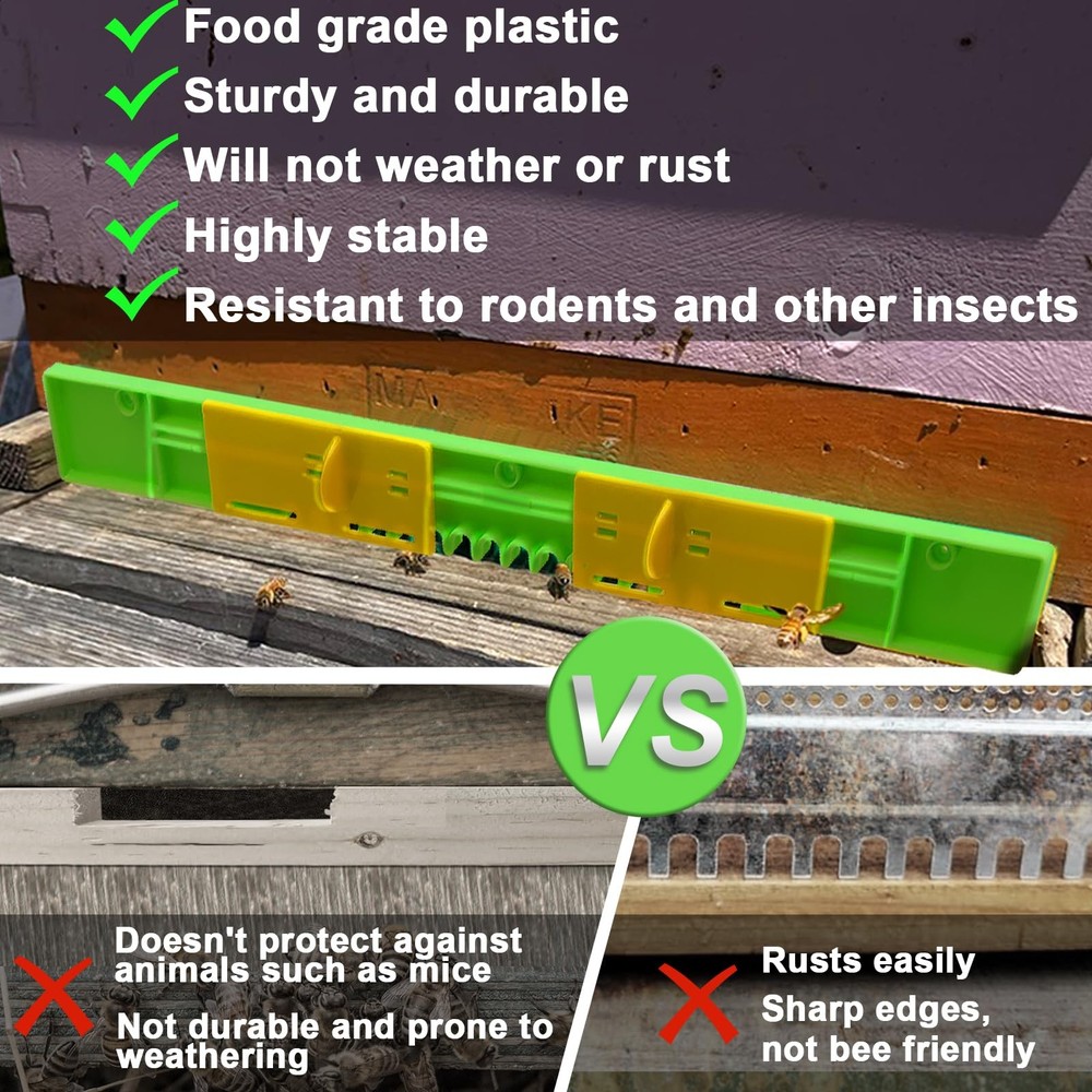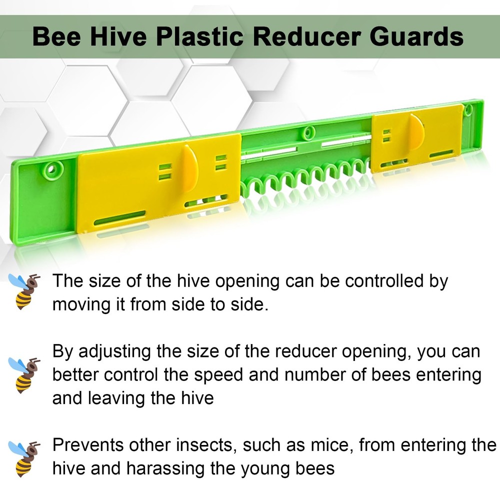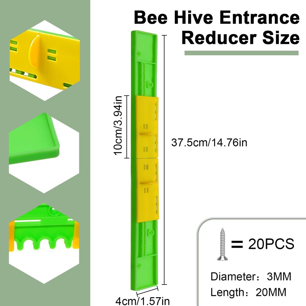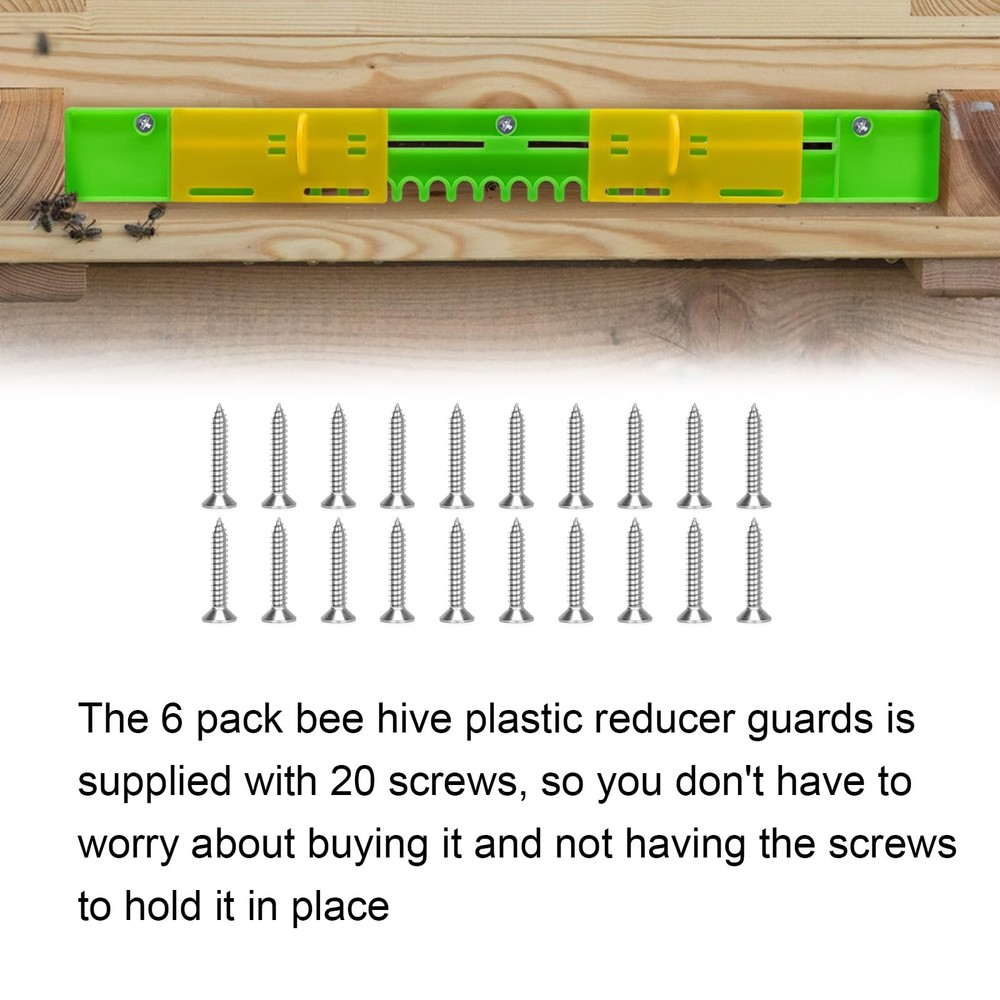 The entrance protector beekeeping can be moved from side to side to control the size of the hive opening. This is a very flexible entrance reducers for bee hive Specification: Product type: Bee Hive Entrance Reducer Material: Plastic Color: Green+Yellow Length: 37.5cm/14.76in Feature: 1. This bee hive entrance reducer of ours is made of food-grade plastic, which is safe to use 2. The 6 pack bee hive plastic reducer guards is supplied with 20 screws, so you don't have to worry about buying it and not having the screws to hold it in place 3. The hive door is set in yellow and green, bees can easily identify and quickly enter the hive 4. The entrance reducers can reduce the flow of air inside the hive and keep the temperature and humidity stable inside the hive 5. By adjusting the size of the reducer opening the beekeeper can better control the speed and number of bees coming in and out, and also prevent other insects such as rats from entering and harassing the small bees Package: Beehive Entrance Gates * 6 【Plastic Reducers】This bee hive entrance reducer of ours is made of food-grade plastic, which is safe to use. The plastic of this mouse guard for beehive is sturdy, won't weather or rust, high stability, good corrosion and abrasion resistance, not easy to be damaged. When used in summer, it is not easy to heat up under high temperature, and bees will not be hurt when entering it 【Equipped with Screws】The 6 pack bee hive plastic reducer guards is supplied with 20 screws, so you don't have to worry about buying it and not having the screws to hold it in place. Our adjustable beehive entrance gate is very simple to install and easy to use. All you need to do is to put it on the corresponding hive entrance and fix it with screws. It's easy to use even for novices 【Adjustable Beehive Mouse Guard】The entrance protector beekeeping can be moved from side to side to control the size of the hive opening. By adjusting the size of the reducer opening the beekeeper can better control the speed and number of bees coming in and out, and also prevent other insects such as rats from entering and harassing the small bees. This is a very flexible entrance reducers for bee hive 【Multi Purpose】The entrance reducer and mouse guard can control the flow of air inside the beehive, which can keep the temperature and humidity inside the beehive stable, and also let the little bees breathe some fresh air, which can help the healthy growth of the bees. The bee hive plastic reducer guards also prevents bee robbers from entering the hive and protects the bees from outside interference 【Multi Size】We have 6 Pack beehive sliding mouse guards per serving so you can use and replace them in multiple hives. We have two sizes for you to choose from. One length is 14.76in and one length is 16.14in. You can choose the right beehive entrance reducer for your needs