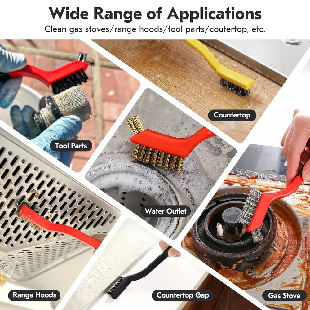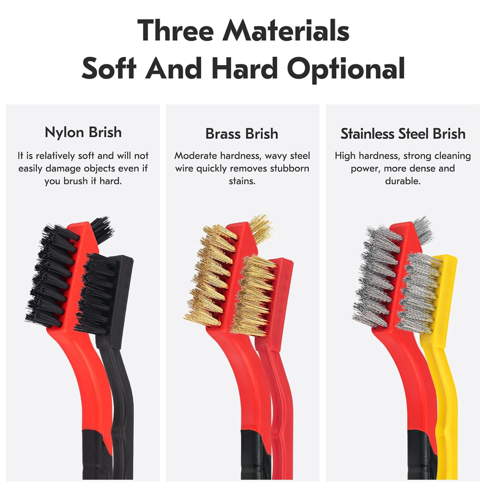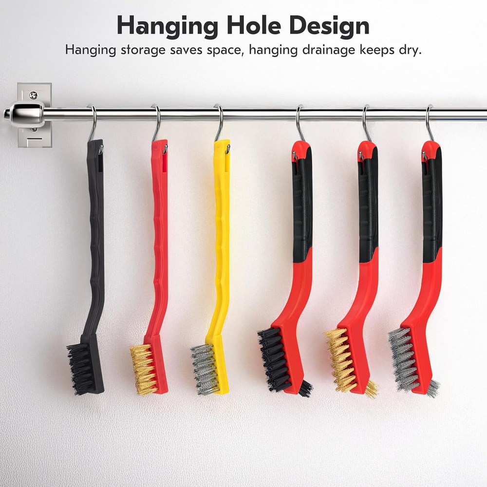 Small Wire Brush Type: This package includes metal, brass, and nylon brushes that can be applied to different surfaces. Stainless steel metal brushes clean rust and hard stains, brass brushes are effective without scratching metal surfaces, and nylon brushes are perfect for cleaning delicate surfaces Mini Wire Brushes for Cleaning Material: Stainless steel/brass/nylon. Our wire brushes material is made of high quality bristles and plastic, which are not easily damaged and more durable Ergonomic Design of Wire Brushes: Each wire brush handle used for cleaning is ergonomically designed to be easy to grip, comfortable to hold, and increase efficiency during use. In addition, the small wire brush is specially designed to clean narrow spaces and cracks Wire Brush Set: includes 3 large wire brushes (stainless steel, brass, nylon) and 3 small wire brushes, neatly packaged, 7 inches long, with a tail hook design at the bottom for easy organization and storage, making it a good helper in your life Wide Use: Our wire brush set can meet your cleaning needs in a variety of scenarios, whether in the kitchen, bathroom, garage, or workshop, providing you with a clean and comfortable environment Product Description Wire Brush Set 6Pcs, Stainless Steel/Brass/Nylon/Bristle Brushes for Cleaning Rust, Scrub Removal Paint and Grout Brass Brushes: brass bristles clean unfinished metal parts, without damaging surfaces or fine features. Stainless Steel Brushes: Stiff and aggressive, stainless steel bristles deliver scrubbing power for removing loose paint, scale, and rust from metal parts. Nylon Brushes: Nylon bristles are easy on finished surfaces making them ideal for sweeping interior door panels, trim pieces, dashboards, and crevices where panels meet. Quality Wire Brush Comfortable Grip Hanging Hole