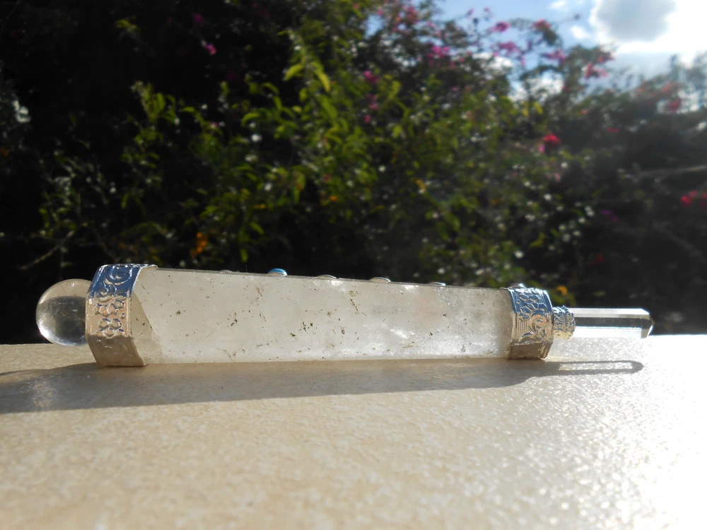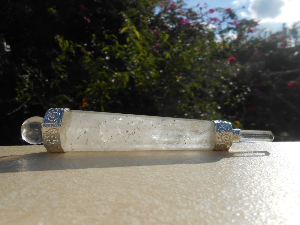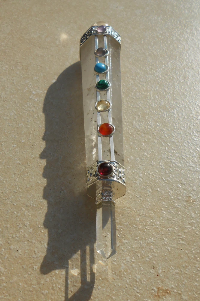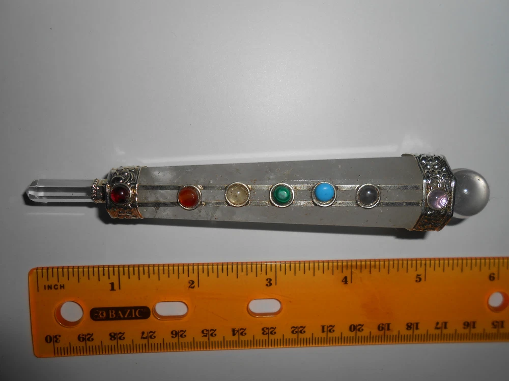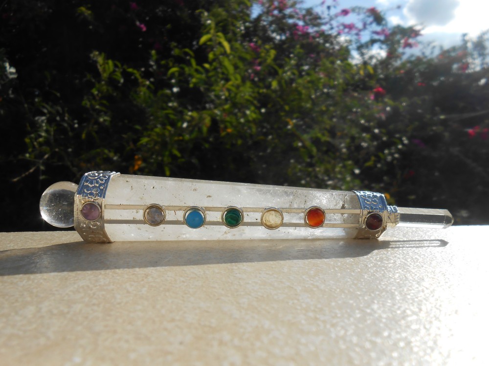 The pictures exposed are representing the actual item for this offer. Depending of the calibration of your monitor, the colors may vary. Please zoom each pictures to look its crystal details. Brand-new, unused item. ------- 7 CHAKRA FACETED CRYSTAL QUARTZ HEALING AURA WAND WITH CRYSTAL BALL AND CRYSTAL FACETED POINT. #22. Gorgeous, pure and powerful 7 chakra Crystal Quartz Healing Faceted Wand “stick”. It has a nice Crystal Quartz Ball on the top and a Crystal Quartz 6 Facetted Point at the end. Chakra Cab stone: Garnet, Cornelian, Citrine, Malakite, Tourquoise, Iolite & Amethyst. It measures overall: 5.43 " long. Its largest part measures: 0.94". Its mounting is Silver Plated Copper. ------- Thank you for visiting and good luck! Save on shipping: I offer FREE combined invoice up to 40 items . Visit My eBay Store: CAVERNA UNIVERSAL ******* Thank you for visiting. Save on shipping: I offer combined invoice up to 40 items .