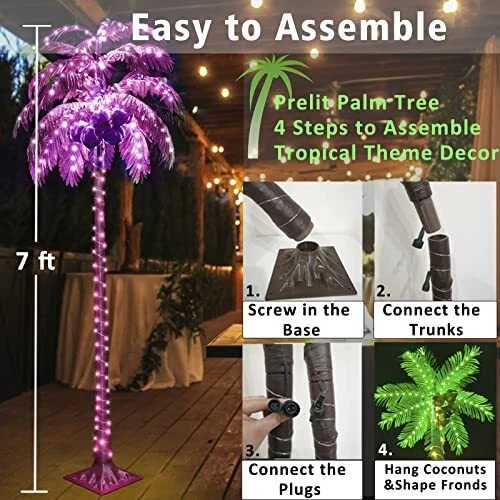 Return Policy Fast Delivery Trusted seller 7 FT Color Changing LED Palm Tree with Coconuts, Remote Control - for Pool, Beach, Yard, Party Decor Product Description Color Changing Palm Tree with 5 Coconuts: The multicolor coconut tree is designed by brown straight trunk and green palm fronds with color changing LED lights, can add some tropical style to your patio, pool, Hawaiian jungle party, Tiki bar, etc Updated 32 Keys Remote Control: The colorful palm tree lights can be controlled with remote. You can customize the color of the LED tropical palm tree, set up the time(4 hours on, 6 hours on, 8 hours on) and control the brightness of the lights 18 Colors and 7 Lighting Modes: 16 different solid single color, 2 combination colors (Red White Blue & Colorful), and 7 dynamic lighting modes (twinkling and flashing). You can switch the led lights from cozy to cheerful blinking Artificial palm tree Outdoor Decoration: The package contains ground nails that can make the palm tree stand steadily outdoors. IP44 waterproof functions make it more suitable for outside use Widely Application: Wver on the beach, swimming pool, yard, garden, party, home, office, indoor or outdoor, and whenever winter or summer, daytime or holiday, always bring you the Hawaiian tropical happiness Easy to Assemble: The palm tree is prelit. You just need screw the trunk into the base, and separately connect 2 trunks and the male & female plug. Then shape the leaves as you want. You can use it to decorate your room and luau aloha party Specification: The faux palm tree with lights is 6 FT height, designed with 170 long life span LED lights, powered by 29 V low voltage adaptor, which is more save-energy Shipping Returns Payment Shipping Shipping is FREE to all addresses other than APO/PO boxes in the lower 48 states. All our stock ships from US-based warehouses. Shipped via USPS or UPS (depending on location and package weight) Unless stated otherwise, all orders will ship within 24-72 hours of your payment being processed. Check our feedback to see the great reviews of FAST shipping we offer. Returns Seller does not accept returns Payment We currently accept payment via eBay managed payments only. Once payment is cleared, we will dispatch your shipment within 1-3 business days. Please refer to the "Shipping" tab for more information regarding shipping speed to your destination.