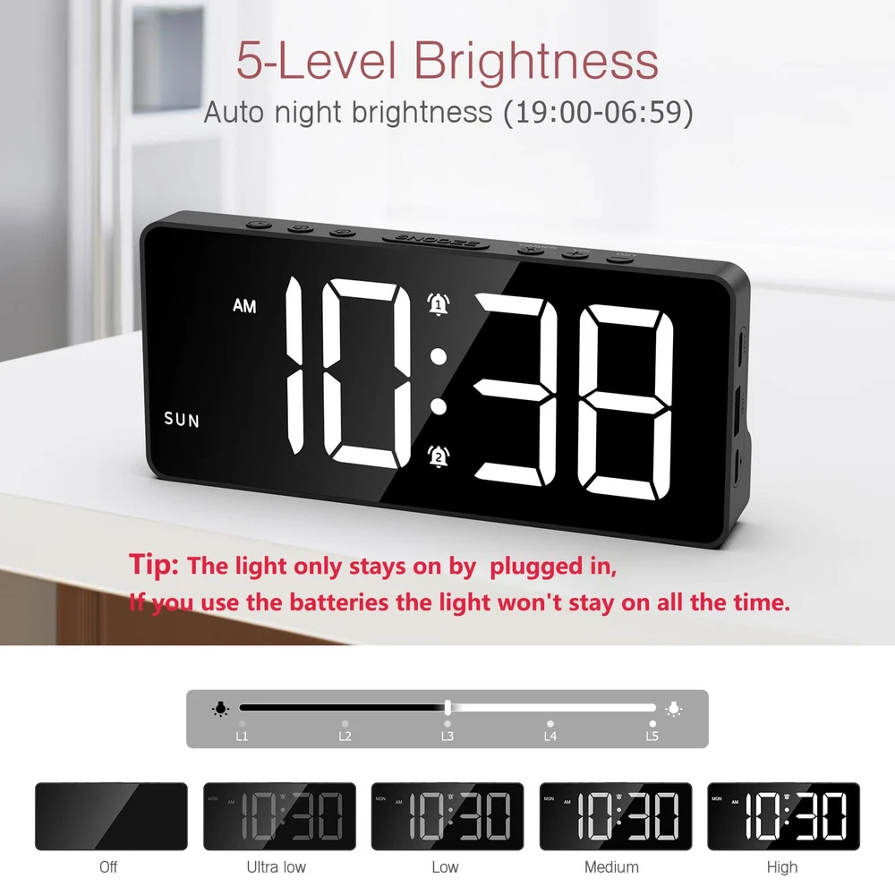 【Large LED Screen & Multifunctional Display】This digital alarm clock uses a 7-inch LED display and supports displaying time and day of the week on the same screen. You can also set the date, 12/24H format and DST. 【Dual Alarms & Adjustable Volume】It has 2 sets of independent alarms, 4 alarm modes: MON-FRI/MON-SAT/MON-SUN/SAT-SUN. The default snooze time is 9 minutes, and the alarm has 3 levels of volume that can be adjusted. This large display alarm clock is great for seniors and deep sleepers. 【Adjustable Brightness & Power Saving Mode】5 levels of brightness adjustable: 100%-60%-30%-3%-0%. In power saving mode (only when powered by batteries), the colon between the clock minutes will not flash, and the screen will turn off after 10 seconds of no operation. 【2 Power Supply Methods & Dual Port】Comes with Type-C charging cable(Adapter is not included) for long-term use(main power supply). In normal use process of the product, USB port allows you to charge (slow charging) or power external devices such as phones. It can also be powered by 3*AAA battery. BUT PLS NOTE: The screen only stays on by plugged in, If you use the batteries the light won't stay on all the time. 【Night Mode】The LED alarm clock also allows you to set night mode if needed. Hold and press the DIMMER button for 3 seconds, the moon symbol will appear on the screen, the night mode is activated. The backlight brightness would be dimmed automatically during PM7:00 to AM7:00.