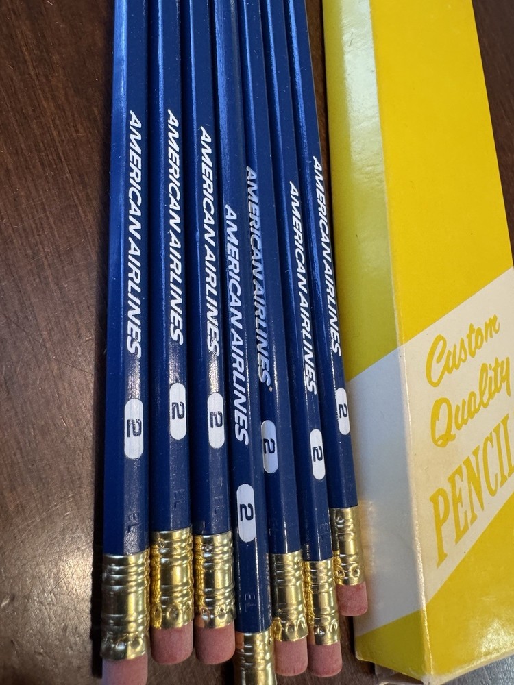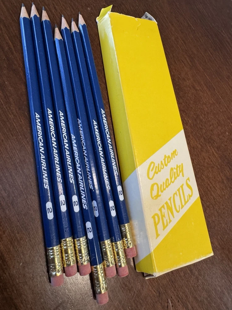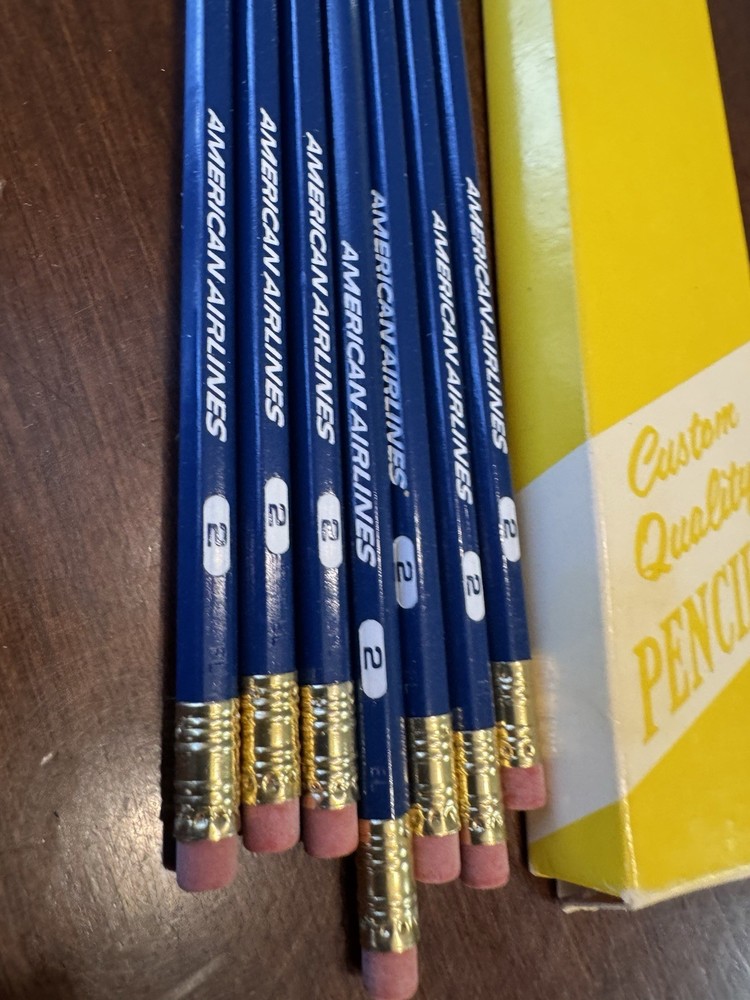 This product is a set of 7 vintage American Airlines #2 blue wood pencils in their original box. The pencils feature the airline's logo advertising and are made in the United States. Collectors of aviation and transportation memorabilia may find these pencils to be a unique and nostalgic addition to their collection. The classic design and country of origin add to the charm and authenticity of these vintage pencils. Please see all photos SMOKE FREE HOME Always happy to combine for real shipping savings, you can include all in your cart and request a combined postage invoice If you make offers and have to pay immediately, I just refund the overage Easy Peasy...thanks!
