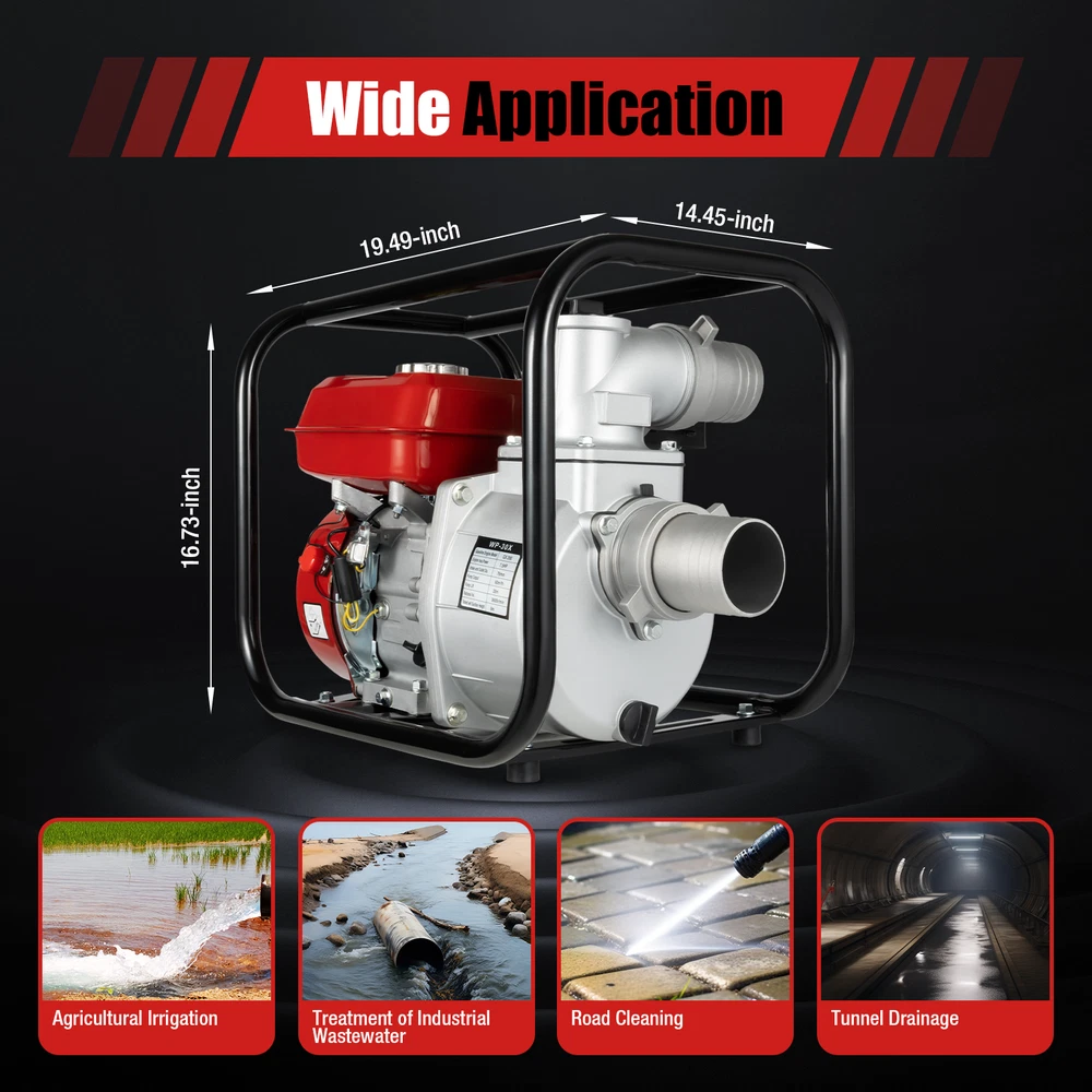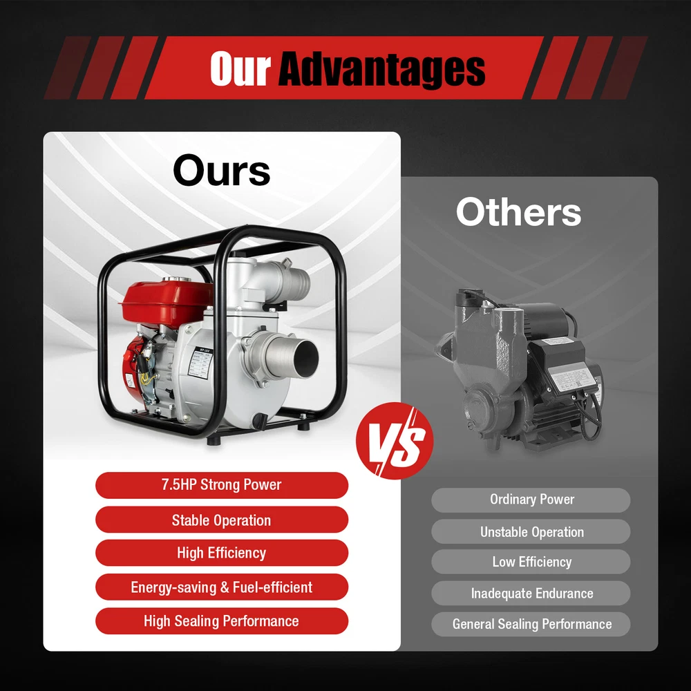 Specifications Model: WP-30X Material: Aluminum, Ferroalloy Color: Red Engine Type: Single-cylinder, 4-stroke, Air-cooled Starting Mode: Manual Engine Max Power: 7.5hp Gasoline Engine Model: GX200 Fuel Type: Gasoline Fuel Tank Capacity: 3.6L/0.95Gal Machine Oil Capacity: 0.6L/0.16Gal Oil Consumption Rate: ≤395g/Kw.h Displacement: 196cc Bore Stroke: 68*54mm/2.56*2.13inch Compression Ratio: 8.5:1 Rational Vel: 3600r/min Intake and Outlet Diameter: 7.6cm/3inch Pump Lift: 28m/91.86ft Pump Output: 60m³/h/2118.88ft³/h Rated Self-suction Height: 8m/26.25ft Product Size: 49.5x36.7x42.5cm/19.49*14.45*16.73inch Package Size: 51.5*43.3*39.8cm/20.28*17.05*15.67inch Net Weight: 20.85kg/45.97lbs Gross Weight: 21.95kg/48.39lbs 7.5 HP 3" Gasoline Water Pump 3000W Portable Gas-Powered Garden Irrigation Pump Description Are you still worried about watering your farm too slowly? This 7.5HP irrigation water pump will help you get your watering done very quickly and well. It has an aluminum pump body for greater durability and long service life. The extra power and large flow rate will allow you to work more efficiently. Great Durability: It is made of high-quality aluminum and ferroalloy, which is very tough and durable and has a long service life. Specifications Model: WP-30X Material: Aluminum, Ferroalloy Color: Red Engine Type: Single-cylinder, 4-stroke, Air-cooled Starting Mode: Manual Bore Stroke: 68*54mm/2.56*2.13inch Compression Ratio: 8.5:1 Rational Vel: 3600r/min Intake and Outlet Diameter: 7.6cm/3inch Pump Lift: 28m/91.86ft Pump Output: 60m³/h/2118.88 ft³/h Rated Self-suction Height: 8m/26.25ft Product Size: 49.5x36.7x42.5cm/19.49*14.45*16.73inch Package Size: 51.5*43.3*39.8cm/20.28*17.05*15.67inch Net Weight: 20.85kg/45.97lbs Gross Weight: 21.95kg/48.39lbs Long-term Endurance & Energy Saving: The 0.95gal fuel tank allows you to work for a longer time at once, saving you time and effort. A high-quality carburetor allows for better fuel combustion, ensuring a 395g/Kw.h of fuel rate, and reducing fuel consumption. Engine Max Power: 7.5hp Gasoline Engine Model: GX200 Fuel Type: Gasoline Fuel Tank Capacity: 3.6L/0.95Gal Machine Oil Capacity: 0.6L/0.16Gal Oil Consumption Rate: ≤395g/Kw.h Displacement: 196cc Application: It is suitable for agricultural irrigation, treatment of industrial wastewater, tunnel drainage, road cleaning, mountain water transport, and more. User-friendly Design: The design of manual start, one-click shutdown, and controllable speed simplifies various operations while ensuring safety, making it easier and more reassuring for you to use. Good Heat Dissipation: The forced air-cooling system and the dense cooling holes in the casing dissipate heat quickly and promptly, which not only prolongs the engine's service life but also ensures that the engine will not stall even after a long period of operation. High Efficiency: It adopts a powerful four-stroke OHV engine, which can generate more power. The 7.5hp, 196cc engine has a high speed of 3600r/min, achieving a 2118.88 ft³ hourly flow rate, 26.25ft rated self suction height, and 91.86 ft lift. With its help, you can efficiently complete various irrigation and drainage tasks in a shorter amount of time. Package Included 1* Water Pump 1* Inlet Pipe Connection 1* Outlet Pipe Connection 1* Sleeve Rod 1* Filter 4* Foot Pads 1* English Manual Other Accessories for Assembly Details Enlarged Inlet and Outlet: Its inlet and outlet have been enlarged to a diameter of 2.99 inches, which allows for a larger flow rate for a wider range of watering and suction. Air & Water Filters: The filters can effectively isolate impurities in water and air, prevent blockage of water pipes and water pumps, and improve working efficiency. Quality Silencer: It can effectively alleviate the noise generated during the operation process, control the noise within an acceptable range, and provide a comfortable working environment. Snap-on Fuel Tank Cap : It makes the fuel tank seal better, reduces evaporation, and saves fuel. Protective Package: To prevent the product from being damaged and bumped during transportation, we packed it with bubble bags, plastic bags and carton to protect your products to the maximum extent possible. Notes Please allow the slight color difference caused by the shooting light and 1-3cm error due to manual measurement, and make sure you do not mind before you order. Welcome to yywholesales !!???? Thank you for your support! If you have any questions,please feel free to contact us!!! Payment Delivery details Terms of sales About us Contact us Payment We accept ebay payment 。 Fees such as import duties, taxes are not included in the item price or shipping costs. These charges are the buyer's responsibility. Delivery details Shipping: 2-9 working days to: USA Terms of sales We maintain high standards of excellence and strive for hundred percent customer satisfaction. Feedback is very important to us. We hope that you contact us immediately before you give neutral or negative feedback, so that we can address your concerns. It is impossible to address issues if we do not know about them! About us Your satis faction is our ultimate goal. We work hard to earn your trust and future business. Our certified technicians have tested each item before shipping. The unit comes with 1 year limited warranty on all manufacturing defects. a) If you receive a defective item, you may return it or ask for a discount. Please contact us within 14 days after you receive the package. b) What you returned must be intact and in its original packaging as re? u. Customer is responsible for shipping costs of the returned item. c) We will cover the cost of shipping back t with the shipping rate indicated in the registration page. We will send you a new unit or refund the full payment you paid. Thank you. Contact us Business Hour Business Hour: Monday To Friday: 8:30 AM to 5:00 PM (Beijing China time) Due to time zones, our reply to your questions may not be i