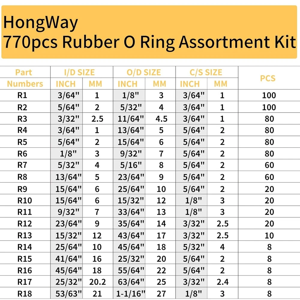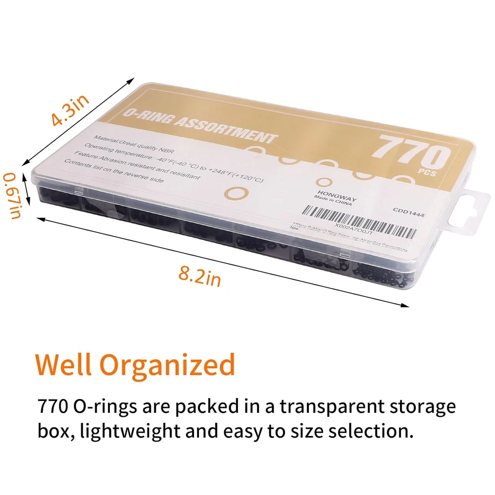Neighborhood service 770Pcs Rubber O Ring Assortment Kits 18 Sizes Sealing NBR Gasket Washers for Car Auto Vehicle Repair, Professional Plumbing, Air or Gas Connections ENJOY THE FEATURES 【PACKAGE INCLUDING】 This o ring assortment kit contains 770 o-rings in 18 sizes. A wide range of sizes and quantities will meet your needs. 【PRODUCT MAKINGS】Our o ring kit is made of premium nitrile rubber(NBR). The applicable temperature range of the rubber O-ring is from -40℉ (-40℃) to +248℉ (+120℃). 【WIDE APPLICATION】 The rubber o ring assortment is suitable for the leak repair of resist oils, hydraulic fluid, water and abrasion in kitchen, bathroom, auto engines, pressure washer and plumbing . 【EASY STORAGE】Comes in a Handy Plastic Organizer Case with Sized Compartments. Each size comes with a label for easy picking and storage. 【QUALITY SERVICE】We Take Pride in Delivering a Quality Product. If you are Unhappy with This Product, We would Return Your Kit for Free with No Reason. Product Description Hongway, with the vision of allowing everyone to do home fix in an easy way, has been devoting into manufacturing and supplying tools for over 10 years. We are in business to bring affordable and reliable tools worldwide. Whether it’s your first Hongway purchase or you’re back for more. We're committed to creating great products backed by friendly, responsive service to delight our loyal customers. HongWay 770PCS O Ring Assortment Kits HongWay O Rings have good tensile strength and strong torsional strength, and can work at high strength without breaking, and be able to work stably in different temperatures (-40ㄈ (-40℃) to +248ㄈ (+120℃)). There are 18 sizes black O Rings for you to choose from, from small ones to large ones,which will certainly meet all your needs. Quantity:770PCS PRODUCT MAKINGS:High Quality Nitrile Rubber(NBR) Type: 18 Sizes Professional term brings you a good shopping experience Specification:Metric 100PCS:3.0x1.0mm/4.0x1.0mm 80PCS : 5.0x2.0mm/6.0x2.0mm/7.0x2.0m 60PCS:8.0x2.0mm/9.0x2.0mm 20PCS:10.0x2.0mm/12.0x3.0mm13.0x3.0mm/14.0x2.5mm 10PCS:17.0x2.5mm 8PCS:18.0x4.0mm/20.0x2.0mm/22.0x2.0mm/25.0x2.4mm/27.0x3.0mm Professional term brings you a good shopping experience Specification:Metric 100PCS:3.0x1.0mm/4.0x1.0mm 80PCS : 5.0x2.0mm/6.0x2.0mm/7.0x2.0m 60PCS:8.0x2.0mm/9.0x2.0mm 20PCS:10.0x2.0mm/12.0x3.0mm13.0x3.0mm/14.0x2.5mm 10PCS:17.0x2.5mm 8PCS:18.0x4.0mm/20.0x2.0mm/22.0x2.0mm/25.0x2.4mm/27.0x3.0mm Professional term brings you a good shopping experience Specification:Metric 100PCS:3.0x1.0mm/4.0x1.0mm 80PCS : 5.0x2.0mm/6.0x2.0mm/7.0x2.0m 60PCS:8.0x2.0mm/9.0x2.0mm 20PCS:10.0x2.0mm/12.0x3.0mm13.0x3.0mm/14.0x2.5mm 10PCS:17.0x2.5mm 8PCS:18.0x4.0mm/20.0x2.0mm/22.0x2.0mm/25.0x2.4mm/27.0x3.0mm Professional term brings you a good shopping experience Specification:Metric 100PCS:3.0x1.0mm/4.0x1.0mm 80PCS : 5.0x2.0mm/6.0x2.0mm/7.0x2.0m 60PCS:8.0x2.0mm/9.0x2.0mm 20PCS:10.0x2.0mm/12.0x3.0mm13.0x3.0mm/14.0x2.5mm 10PCS:17.0x2.5mm 8PCS:18.0x4.0mm/20.0x2.0mm/22.0x2.0mm/25.0x2.4mm/27.0x3.0mm Item model number 20190820236320 Material Nitrile rubber Color Black Item Diameter 3 Millimeters Nominal Inside Diameter 1 Millimeters Package Dimensions 8.15 x 4.33 x 0.67 inches; 4.97 ounces 4.33 inches x 8.15 inches x 0.67 inches. Weight: 4.97 oz PAYMENT We accept all payments via Ebay using Credit Cards , PAYPAL , Apple Pay and many others SHIPPING We are always working hard to ensure your package arrives as soon as possible. Please understand that some factors like weather, high postal traffic, and the performance of shipping companies are outside of our control. We offer free shipping to the lower 48 states and ship within 3-5 business days of payment, usually sooner. We do not accept P.O. Boxes. Please provide a physical address. We do not ship internationally at this time. DELIVERY & RETURN POLICY We do not offer returns unless the item violates eBay policies. Please be aware these polices only make sellers accept returns if the item violates eBay's Buyer Guarantee. If you would like to learn more about this please visit eBay's Help Page. Thank you for your business
