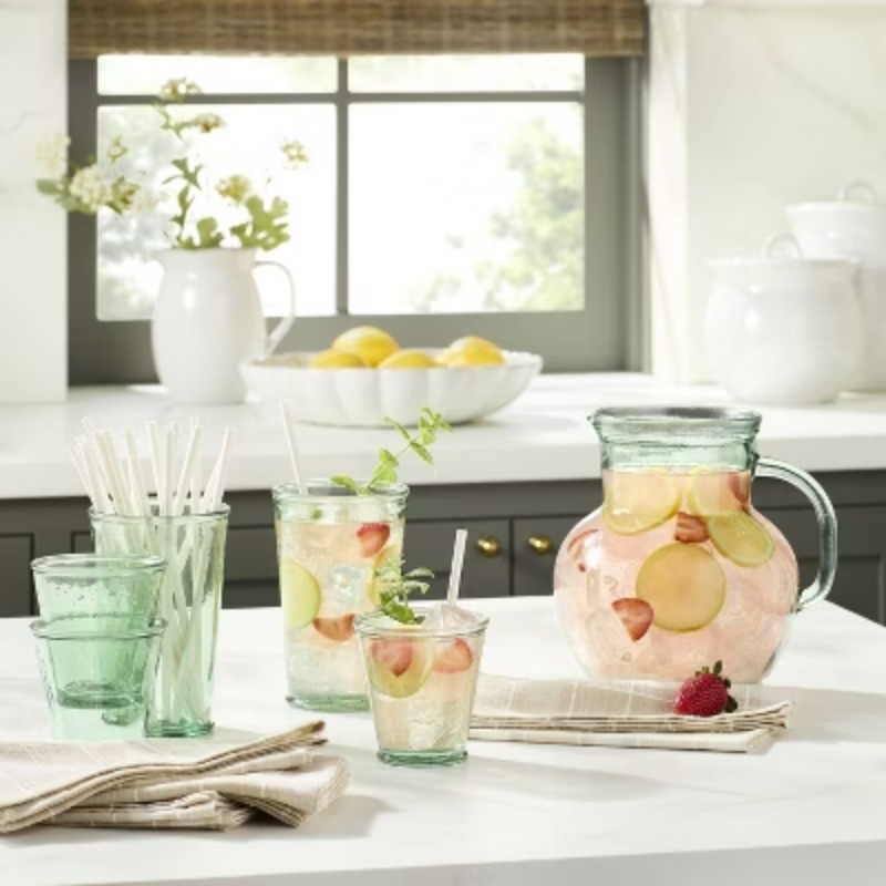 Description Serve your drinks effortlessly with this Recycled Glass Beverage Pitcher from Hearth & Hand™ with Magnolia. Made of 100% recycled glass, this green beverage pitcher features a handle and spout to easily pour the drinks. With a capacity of 77 ounces, it's ideal for serving a range of cold beverages, ranging from juices and lemonade to basil water and other mocktails. Hearth & Hand™ with Magnolia: Gather • Create • Enjoy highlights Beverage pitcher in green hue Made of 100% recycled glass Features a handle and spout 77oz capacity Ideal for cold beverages