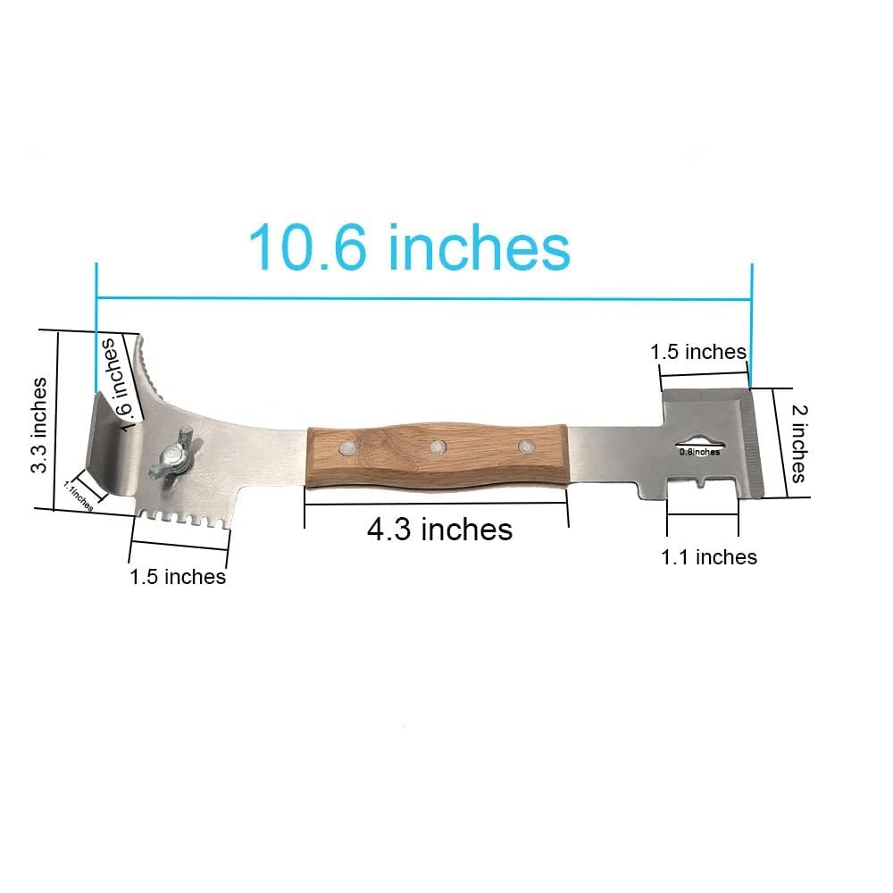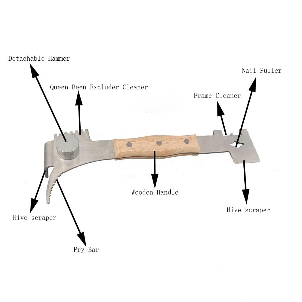 This beekeeping hive tool can be a pry bar, hive scraper tool, frame shovel, queen exclude shovel,nail puller and detachable hammer. It used for separating hive boxes, prying out frames, and scraping wax and propolis off of your bee boxes and frames. This multiuse hive tool with wooden handle has is the long nrrow prying wedge,it allows for a longer length of material to enter below your frame, and gives you great leverage when you pry up in a manner .This hive tool has a wonderful hook for lifting the tabs on the sides of frames. A cool hammer for tapping that mouse guard in and down and other uses right then and there no walking off for a second tool. Has an easy to hold grip that is so much better than standard hive tools,It's a great bee keepers gift. BRAND: Material :Stainless Steel,Wood Size : length:10.8inch(27.5cm) ,width:3.34inch(8.5cm) ,thickness:0.11inch(0.3cm). Weight: 0.69lb(315g). Feature: Ⅰ. Multifunction hive scraper tool can be used as J hook, flat head scraper, elbow lifter, metal removal cleaner, frame cleaner, nail puller, detachable hammer,which is a ideal beekeeping equipment for beekeepers. Ⅱ. stainless steel material which is durable and convenient,high strength and reliability ,don't worry about bent due to hard work. Wood handle grip,you can hold the hive tool more safely and comfortably.. Ⅲ. Easy to use,used for separating hive boxes, prying out frames, and scraping wax and propolis off of your bee boxes and frames etc,this beekeeping tool can improve beekeepers' efficiency.. ALL-IN-ONE HIVE TOOL: Replace multiple beekeeping tools with 's 7-in-1 bee hive tool, including a scraper, J hook, frame lifter, and more. Save time and improve efficiency. VERSATILE DESIGN: With four functions on one end and three on the other, this multipurpose steel hive tools is perfect for any beekeeping task. Use it to pry, scrape, clean, and more. DURABLE MATERIAL: Made of high-strength stainless steel, this bee hive tool is built to last. It won't bend or rust, so you can use it for years to come. COMFORTABLE TO USE: The double-headed scraper tool is designed for easy use, and the solid wood handle provides a comfortable grip. Use it with confidence. PERFECT SIZE: At 10-4/5 inches long, this hive tool is the perfect size for any beekeeper. Add it to your toolkit today and see the difference it makes.