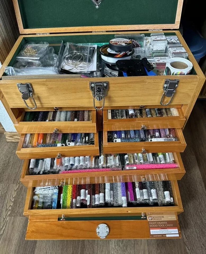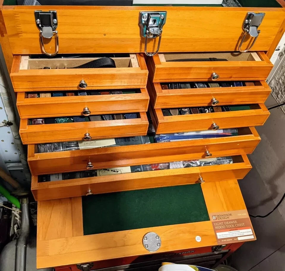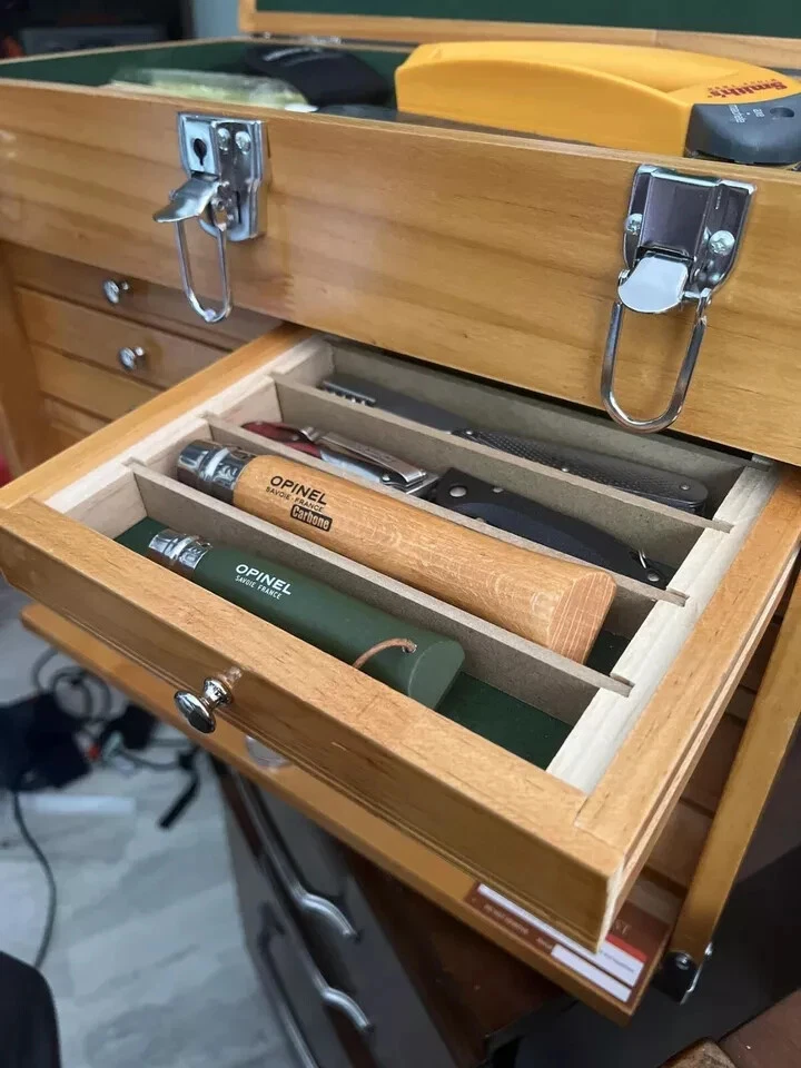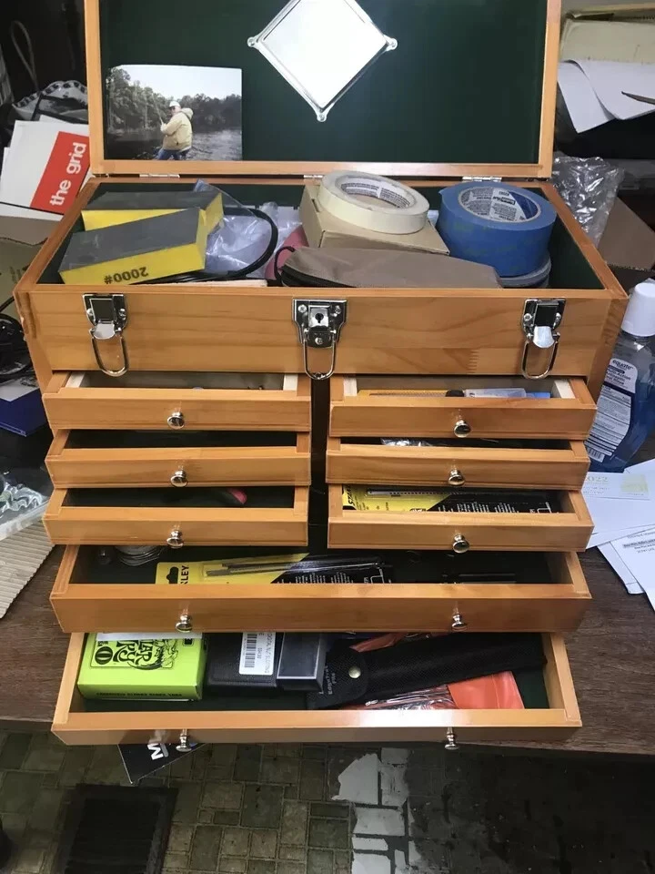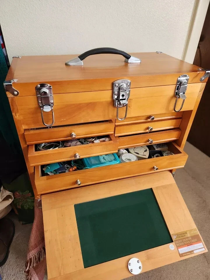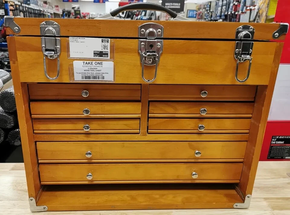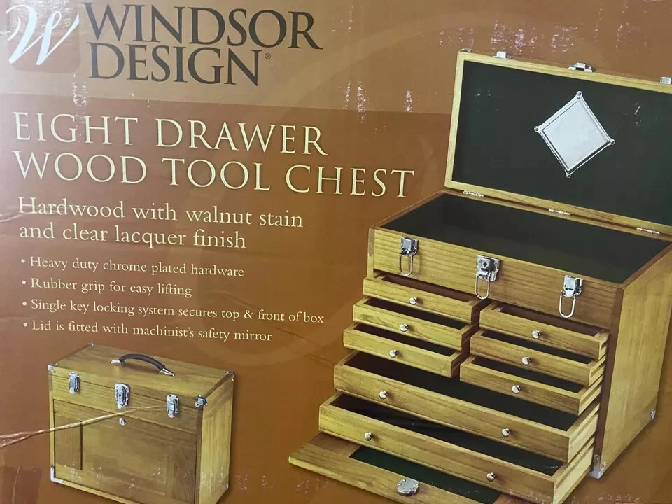 NEW 8 Drawer Hard Wood Tool Chest Storage Box Cabinet Felt Lined Machinists Chest This attractive wood tool chest is crafted of hardwood with a walnut stain making it the perfect way to store your calipers, micrometers and other fine tools. The eight drawers are lined with felt for protection and to help prevent rust. The inside lid is fitted with a machinist's safety mirror, originally designed for first aid in case debris gets in one's eyes. Hardwood with walnut stain and clear lacquer finish Heavy duty chrome plated hardware Single key locking system Rubber handle for easy lifting Felt lined drawers Specifications Material Hardwood Product Height 16 in. Product Length 20 in. Product Weight 18.65 lb. Product Width 10-5/8 in. Shipping Weight 20.05 lb. Number of Drawers 8 CA Residents