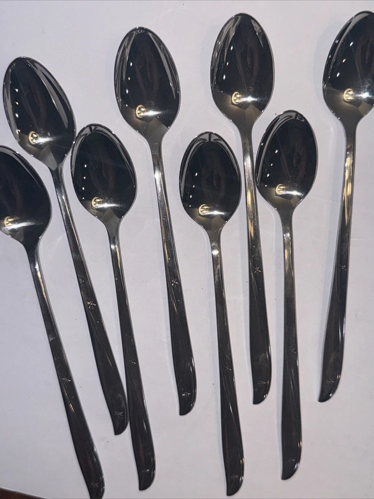 Add some sophistication to your tea time with this lot of 8 Oneida Community Atomic TWIN STAR Iced Tea Spoons which are 7 1/2" in length and come in a set of eight. Please feel free to contact me with any questions you have