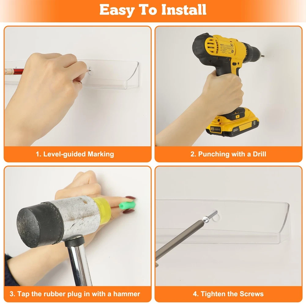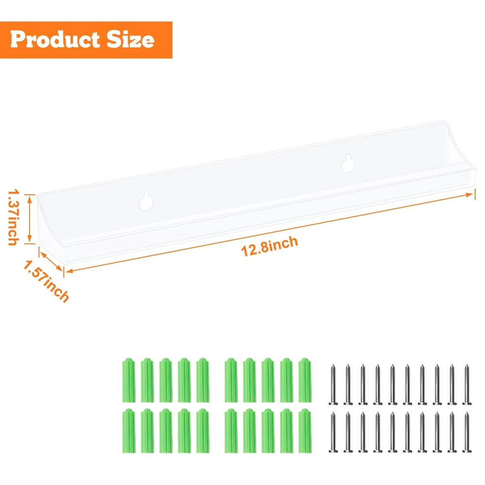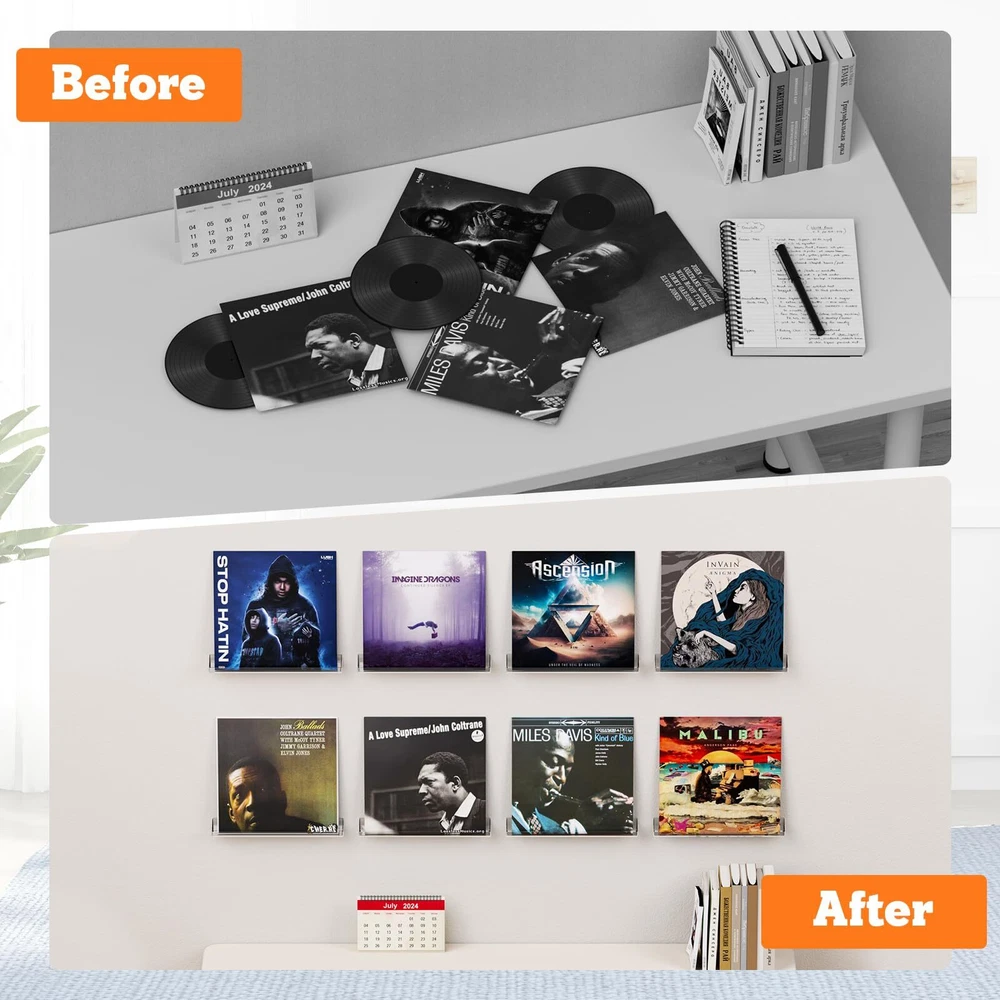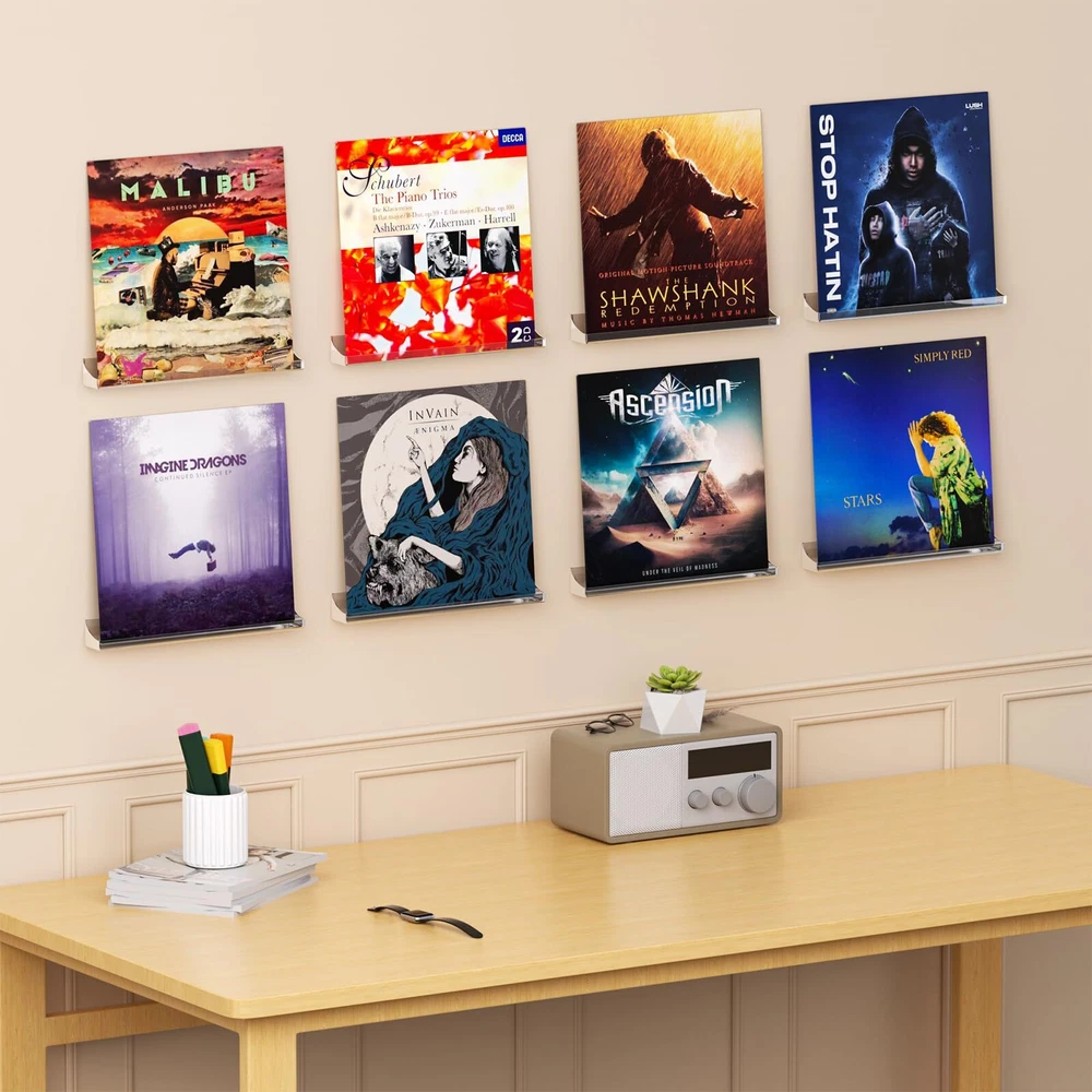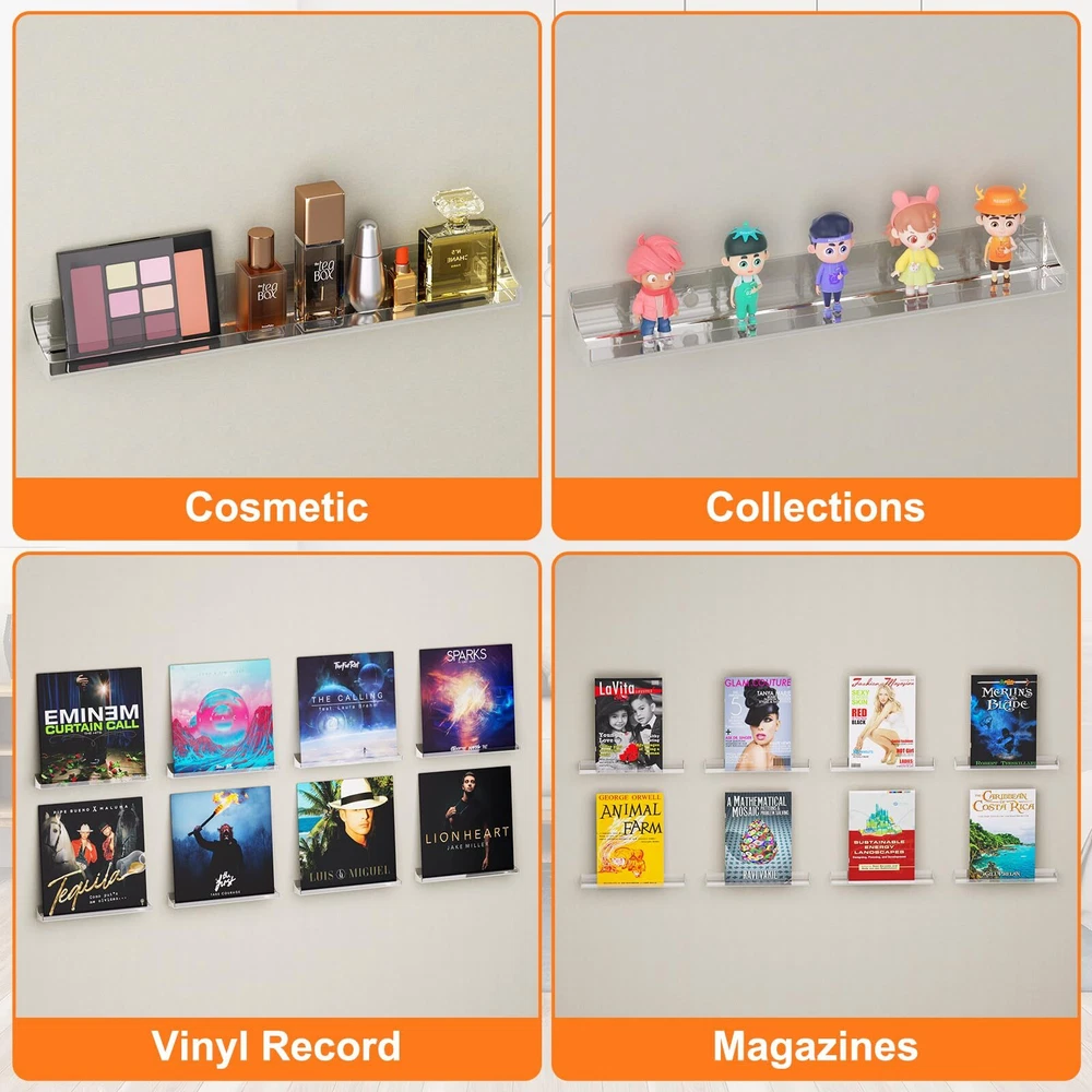 【DISPLAY VINYL】- Display and store your favorite or rare vinyl record collection in this beautiful way. You can easily distinguish between different types of records and create your private collection space. 【QUALITY & RELIABLE】- These vinyl wall mount are made of high quality acrylic, sturdy and easy to clean. Size: 12.8x1.57x1.37 inches. 【EASY INSTALLATION & NOVEL DESIGN】- The vinyl record holder are pre-drilled with mounting screws included. It only takes a few minutes to easily mount the rack on the wall. Furthermore, the beveled sides prevent items from sliding and falling. 【MULTIFUNCTIONAL DISPLAY SHELF】- Transparent vinyl shelf can better display what you want, such as vinyl records, album covers, children's books, magazines, collectibles, artwork and other items. Turn your blank wall into a spacious storage area. Perfect for living rooms, offices, vinyl record stores and cafes. 【BEST CHOICE】- The best gift for any music lover. Choose our vinyl wall mount for your family or friends. If you have any questions or are not satisfied with the product, please messages us.