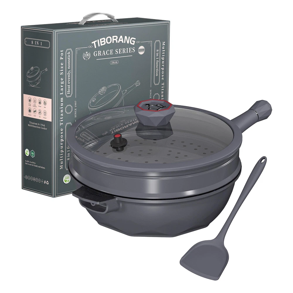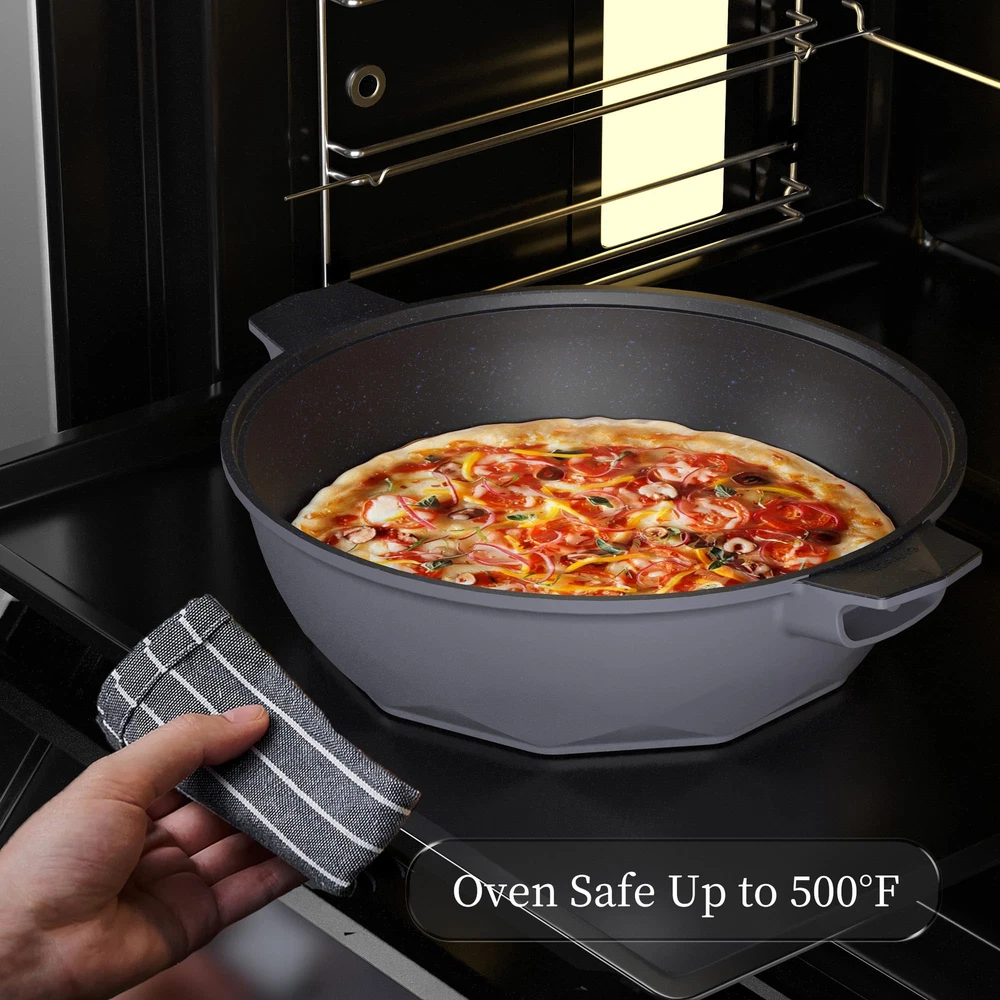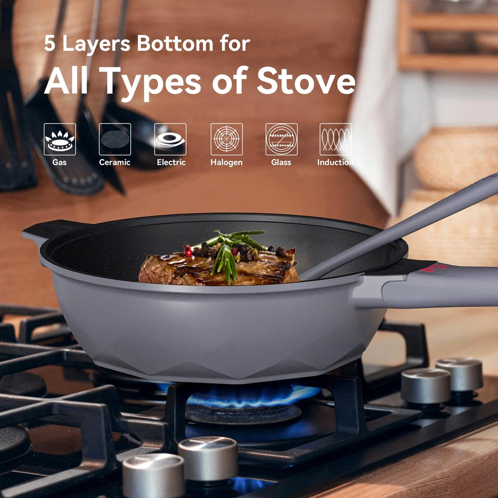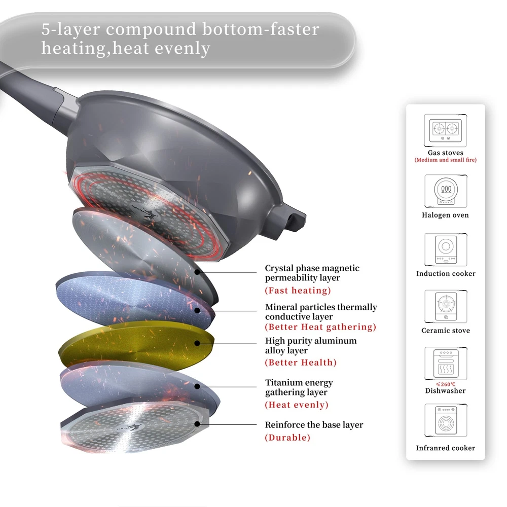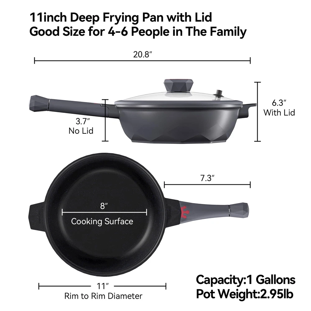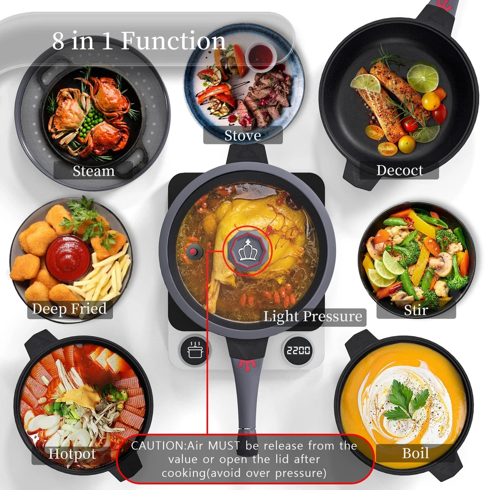 Versatile Always Nonstick Saute Pan: The pan is suitable for Deep Fried, Light Pressure cooking,Steam,Stew,Boil,Decoct,bake,Stir and Hotpot. you also use it to make rice.It can replace deep fat fryer,steamer,sauté pan,skillet,a light pressure cooker,stir fry pan,saucepan,roasting pan.Suit for a "One Pan" minimalist kitchen Definitely Non-Stick & NON-TOXIC Coating:The surface of the pan is Titanium coating, you can push an egg around on it with no oil or butter.and no rivet it's super easy to wash. Simply using damp soapy cloth,dishwasher safe.SGS approved.Pot and pan are PTFE-free, PFOA-free, PFAS-free, lead-free, cadmium-free and are safe for you and your family Save Cooking Time:The nonstick deep skillet with lid comes with a 10KPA micro pressure valve on the fringe, when your dish require to stew, it will speed up as much as 40%-50% compare to traditional chinese wok , great for saving cooking time during your busy schedule. At the same time, it can firmly lock the pot body to increase the flavour of food, lock the moisture and increase meat tenderness.so please avoid to cook it on high Sturdy Wok Body&Oven Safe: The hard anodized aluminum is harder than stainless steel,Compared with cast iron pans and stainless steel pans, it is light in weight, it will never warp.it design 5 layers induction steel plate for rapid even heat distribution from edge to edge. it works on all cooktops(including induction stoves), and is oven safe up to 500°F/260°C Exclusive Patent Design:The woks & stir fry pan is designed by inhouse architect, you can enjoy beauty and quality frome the saute pans everyday use.it comes diamond pattern and it has a gorgeou crown on the lid,spruce up your kitchen decor!It is suitable for giving to your relatives and friends on holidays, weddings, bridal showers, anniversaries, couple's housewarming parties, Mother's Day, or a best friend's birthday Detachable Handle & Preheat Function:The chef pan handle adopts an invisible screw, which makes it easy to disassemble during wash. no tools required, No rust. definitely save storage space.very ergonomic,The front end of the handle is a temperature indicator. Red change to white after heating when Oil temperature is ≥150℃. you can know exactly when the wok is ready. Master the heat and prevent nutrient loss Silicone Glass Lid:The pot is heat and shatter resistant which prevents splatters, the rubber gasket on the lid has a good safety fit and will not slip when transferred.seals in the flavor and nutrients for a healthier and better tasting food. If you want to clean rubber around the lid, you can sprinkle baking soda and brush it, smell will go away in times.the pan has 5 quarts, It is very deep, so you don’t need to worry about oil spray everywhere. Good size for 4-6 people in the family Package & Size: Package: 1 x 5 qt All In One Pan,1 x Packaging Box,1 x Pot Lid,1 x Silicone Spatula,1 x non-stick wok steamer grid,1 x Non-stick silicone pad,1 x User/Recipe Guides,Size:28 x 24 x 8.5cm/11" x 9.4" x 3.3"(Top Dia*Bottom Dia*H) Tips:As the non toxic pan has micro pressure valve design, it can help us save cooking time, when you turn off the stove, if you don't open the lid, or micro pressure value, it still Continuously generate micro pressure in the pot, The air pressure in the all purpose pan is too large can exceed the pressure that the glass lid can withstand. so we recommend that the pot should not be allowed to stand for more than half an hour, you need open the lid or micro pressure Tips:1:Our food can cook fast. so please don't cook it on a high . Prolonged will change the coating color.Please note that all pots do not support long-term dry cooking, please check the food in the pot in time.2:when you first receive the new induction nonstick wok pan with lid,use warm water to clean, avoid using stainless steel scrubbing balls. Then wipe the body of the pot with oil, the coating is more non-sticky