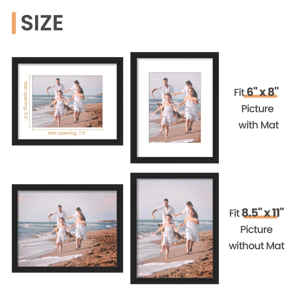 CLASSIC & DURABLE: With sturdy frame, high definition cover, safe packing, picture frame will protect your photo and give a clear view. DOUBLE SIZE DESIGN: Black 8.5x11 inch picture frame perfects for Pictures 6x8 with Mat or 8.5x11 Without Mat. The display size will be 0.5inch smaller than the photo size to better stable the photo and prevent it from falling off. EASY MOUNTING: Spring type action to remove the backing, can be hung horizontally or vertically. GIFT & BE MERRY: 8.5x11 frame set not only the simple yet classic design for any home or office decor, but also a heartfelt gifts for everyone. INTACT PARTS AND PACKING: Protective Packaging let you don't have to worry about receiving damaged products